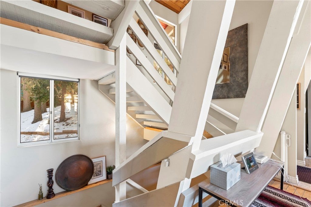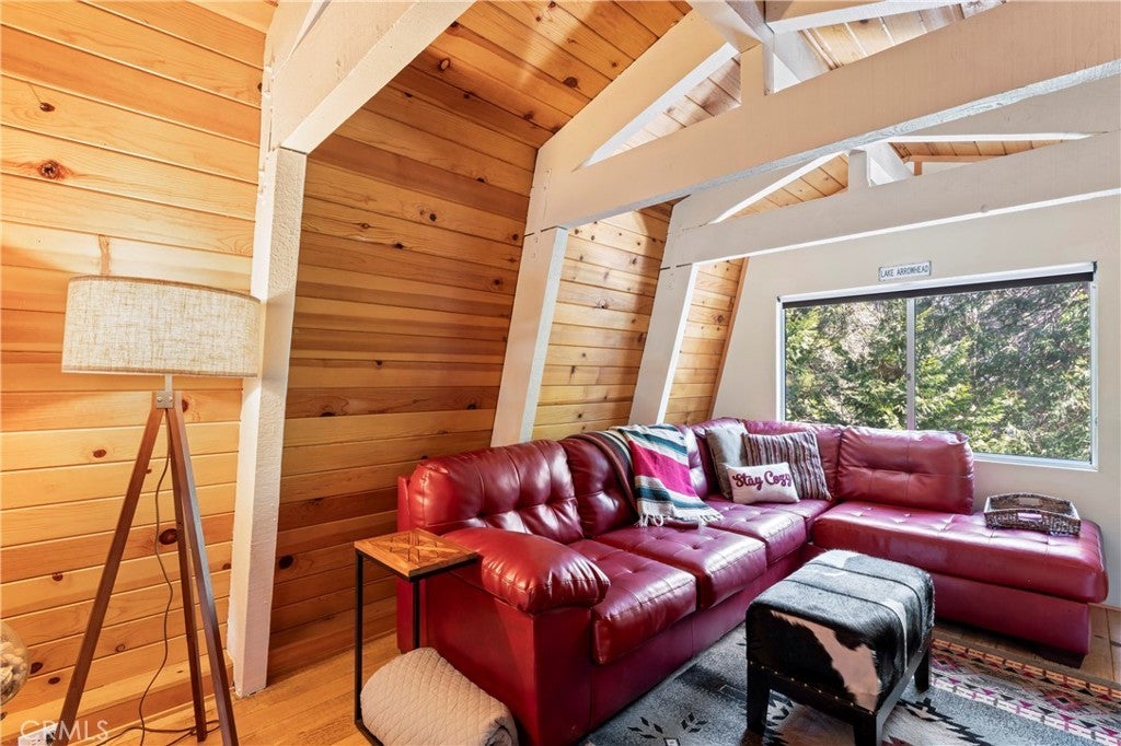 Welcome to “Little Red Lodge” — your perfect mountain escape. Relax and unwind in this charming three-level Gambrel-style cabin nestled in the desirable Lake Arrowhead Villas. Offering a blend of rustic character and modern comforts, this private retreat features 3 bedrooms, 2 full bathrooms, a loft and 1,718 sq ft of inviting living space—easily one of the best values under $500K in the Lake Arrowhead area.~~Step inside and be greeted by warm wood walls, soaring ceilings, and a cozy fireplace that sets the tone for an authentic cabin experience. The main level includes an updated kitchen, a spacious living and dining area and a full bathroom—perfect for everyday living or hosting guests.~~The lower level offers three comfortable bedrooms and a shared full bath, while the upper loft provides an ideal bonus space for movie nights, games, or family gatherings.~~Enjoy mountain air and forest views from the large main-level deck, complete with a hot tub—your private spot to soak under the pines. Additional features include inside laundry, A/C, an upgraded concrete two-car parking area, and a whole-house generator. The home is also EV-ready with an electric car charger.~~Currently a successful short-term vacation rental, “Little Red Lodge” is offered fully furnished and truly turnkey.~~Located just minutes from Lake Arrowhead Village, you’ll enjoy quick access to dining, boutique shopping, a grocery store and more.~~This is mountain living at its best—don’t miss your chance to own this beautifully maintained, ready-to-enjoy retreat.