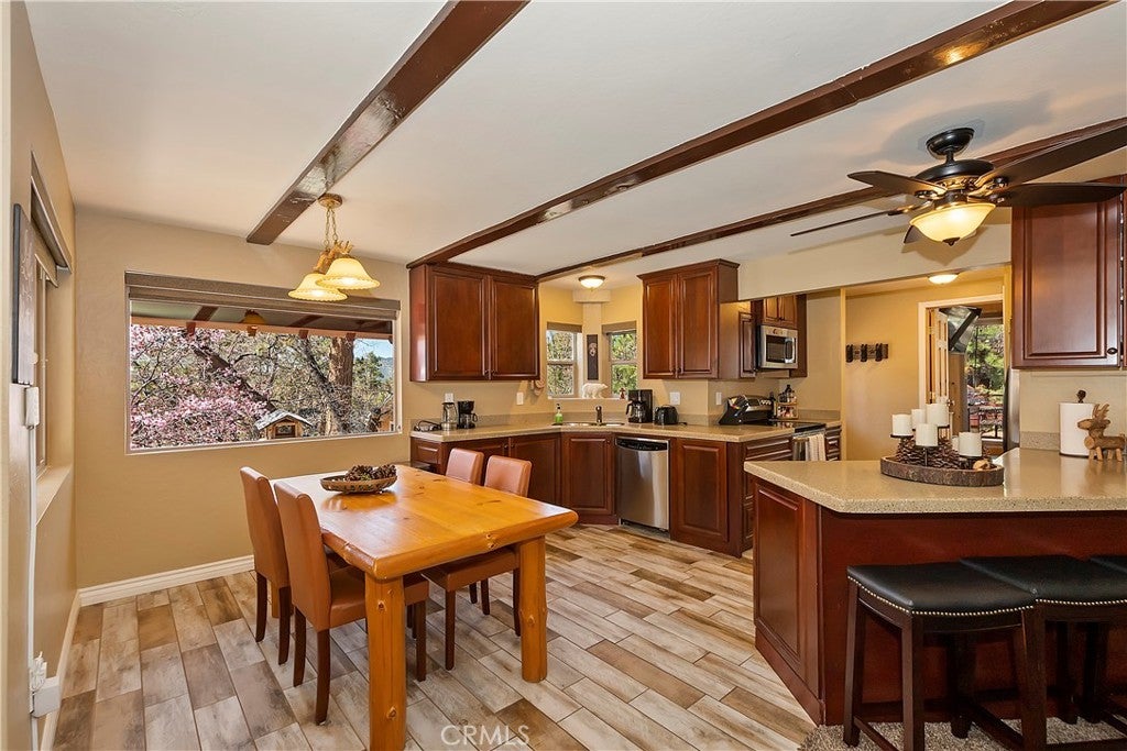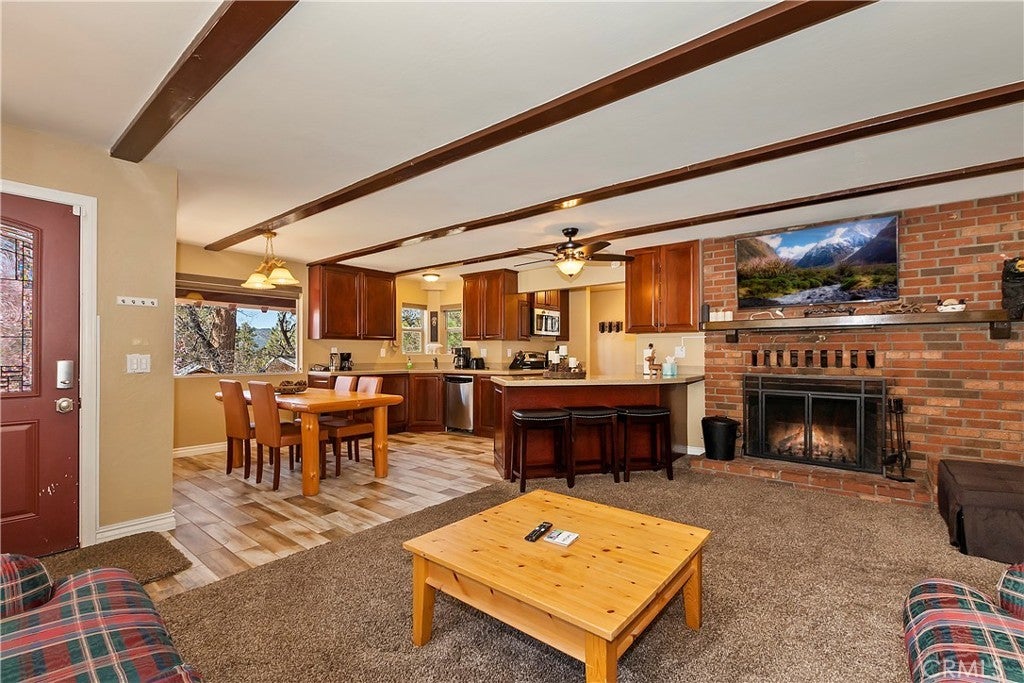 Highly sought-after Moonridge location near Bear Mountain Ski Resort! Recently remodeled 3BR/2BA, 1,634 sq. ft. home with a concrete patio, hot tub, and fencing. Light and bright interior with T&G, accent beams, tile flooring, and custom kitchen with stone counters and SS appliances. Primary suite features private deck. Separate downstairs living quarters plus a newly completed game room with pool table. Successful Airbnb. Home sold fully furnished.