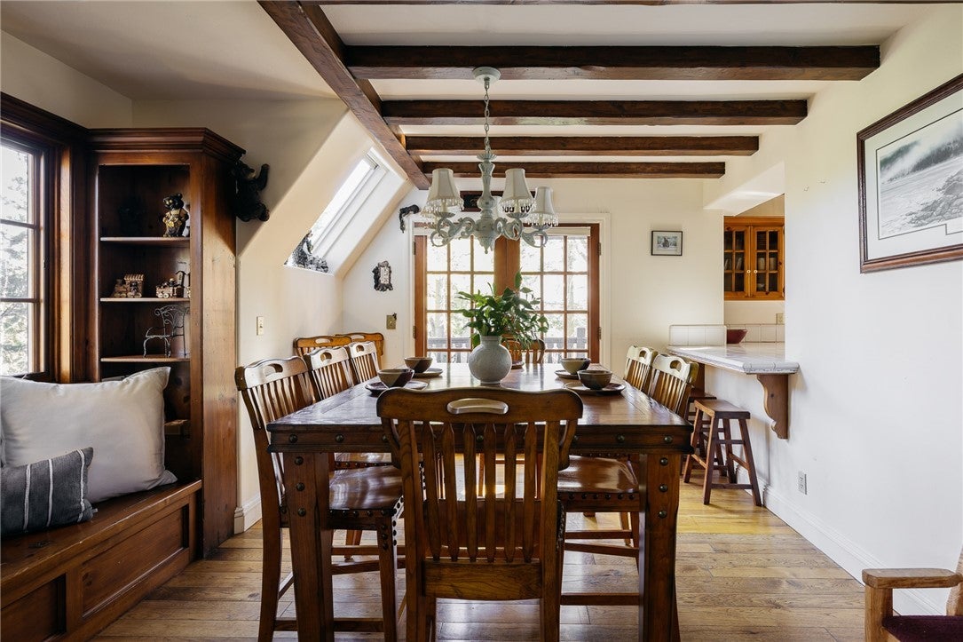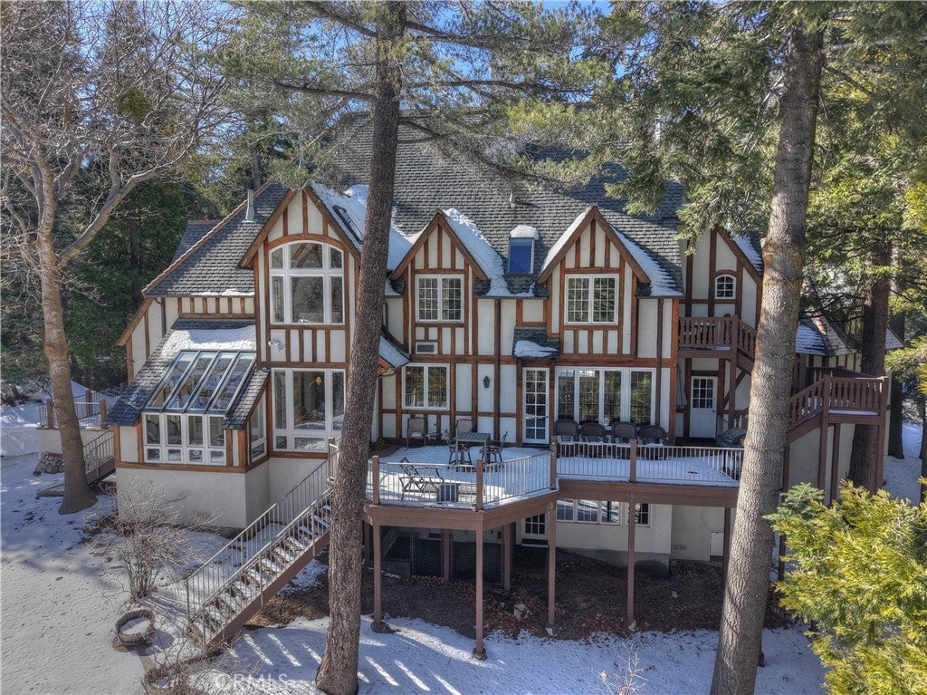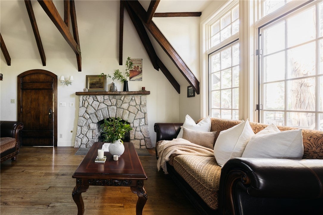 A stunning estate boasting a 3-bedroom main house with two bonus spaces, along with a separate 4-bedroom guest house sited on 1.6+ acres. Every inch of the property reflects a rare devotion to artistry, imagination, and intentional design. Thoughtfully oriented to the south, the residence captures fresh mountain breezes, abundant natural light, and ever-changing forest views, creating a home that feels both alive and deeply grounded in nature. The 6,000+ square-foot main residence is defined by soaring ceilings, intricate hand-crafted woodwork, graceful arched doorways, and seven fireplaces that add warmth and character throughout. A grand living room anchors the home, where diamond-paned windows frame cinematic mountain scenery that transforms with the seasons. Sunlight filters through the trees by day, while evenings glow with firelight and forest silhouettes. Designed for both refined entertaining and quiet retreat, the home features a private library, an intimate wine room, and a gourmet kitchen equipped with a Viking range and double ovens—ideal for the serious chef or hosting memorable gatherings. The layout flows effortlessly, blending elegance and comfort at every turn. The main residence includes two beautifully appointed guest bedrooms plus a luxurious primary suite, each offering privacy, warmth, and serene woodland views. A uniquely designed media room and additional custom spaces throughout the home showcase a level of creativity rarely found, with no two rooms alike. Expansive windows invite the forest indoors, ensuring a strong connection to the natural surroundings. Two generous decks overlook the forest canopy, perfect for morning coffee, entertaining, or evenings under the stars. Above the garage, a massive entertainment hall with a stage, professional sound system, and private entrance offers limitless possibilities. Built in 2002 by acclaimed builder Ron Dolman, known for crafting residences for Disney executives, this iconic estate stands as an enduring architectural work of art.