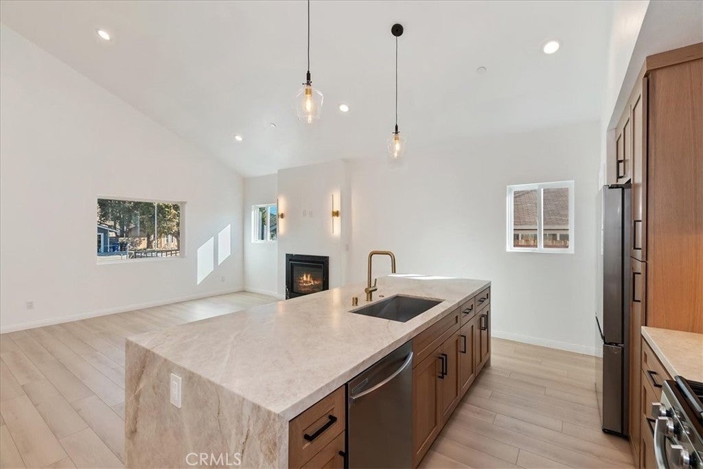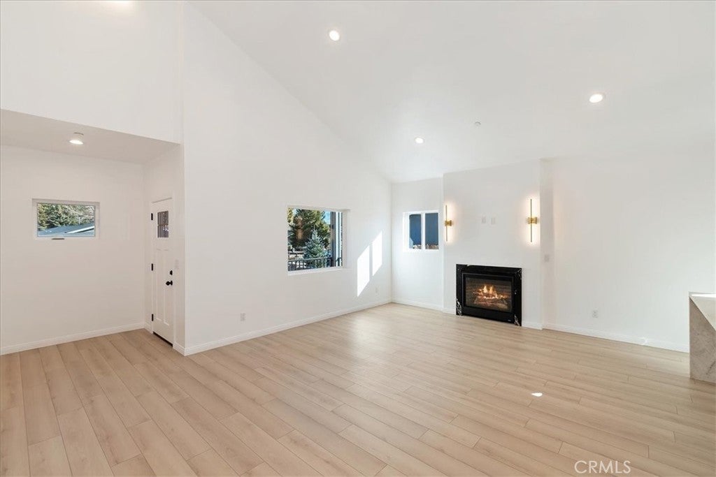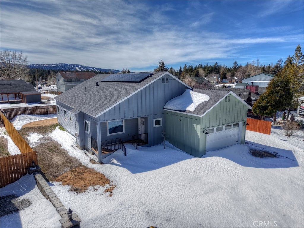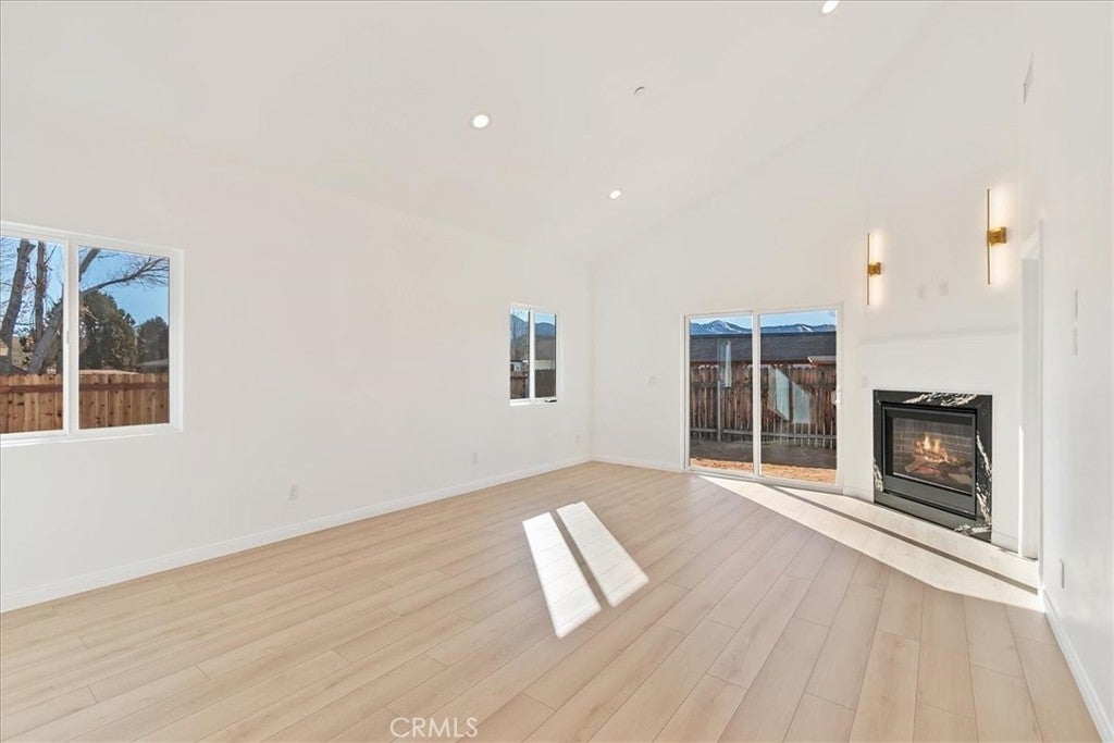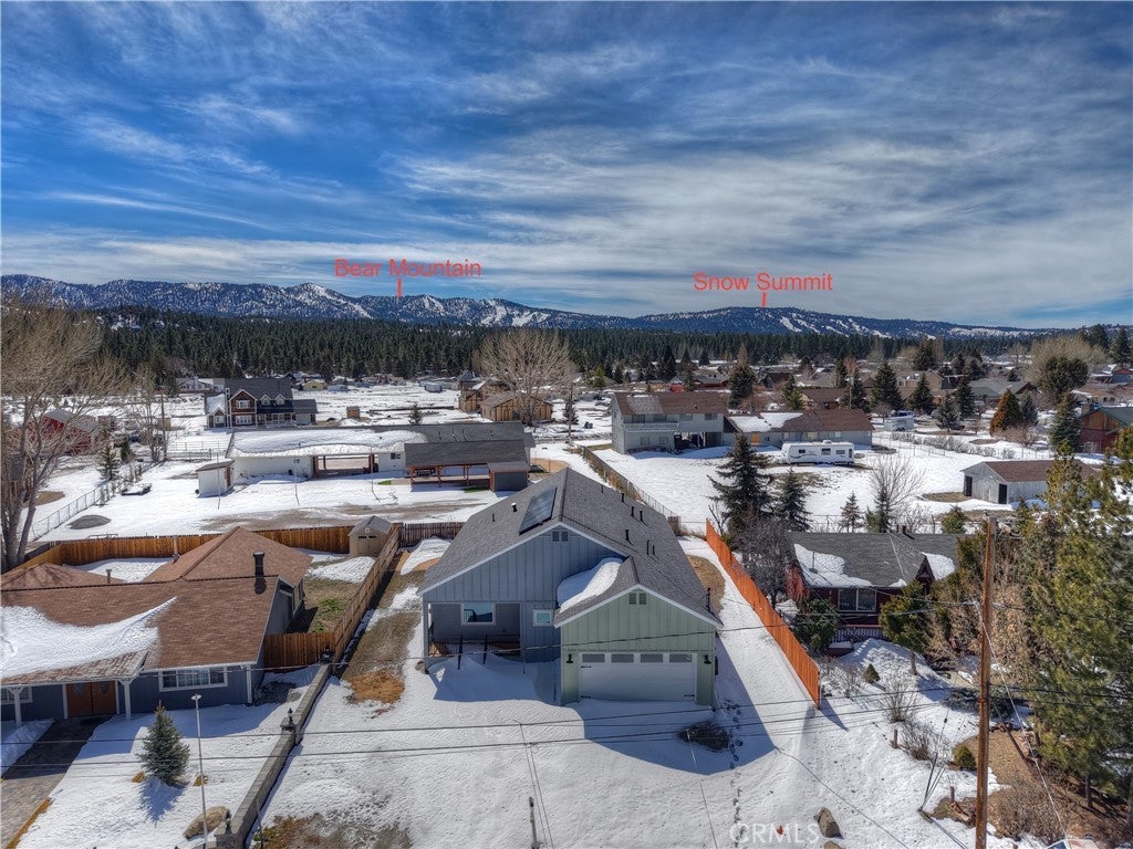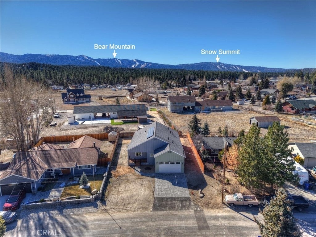 Brand new home with views of Bear Mountain & Snow Summit ski slopes! This house is ready and waiting to become your home ~ It has everything you would want in a new home ~ When you walk in you will love the 18 ft. ceilings over the open floor plan and gas fireplace with quartz surround in the living room ~ The kitchen features real quartzite countertops with a quartzite waterfall island, solid oak cabinets and new appliances ~ In the master bedroom you have 18 ft. ceilings, a gas fireplace with matching quartz surround and views of the ski slopes ~ The master bathroom has porcelain tile floors, step in shower with dual showerheads, a separate soaking tub, dual sinks and light up mirrors ~ Bedrooms 2 & 3 are both en suite with their own full bathrooms and 9 ft. ceilings ~ There is even a 1/2 bathroom off the living room for guests ~ The large laundry room also has a sink ~ The redwood front deck is ideal for relaxing with your morning cup of coffee and taking in your views of Gold Mountain ~ In the 440 sf. ft. 2 car garage you will find 12 ft. high ceilings, EV charging and your tankless water heater with recirculating line (no waiting for hot water) ~ The 3.2kW Solar System with 8 Talesun Panels and Tesla 7.6kW Standalone Inverter is paid for with warranties that can be transferred to the new owner ~ The house is wired for Wifi and has a Wifi thermostat for the forced air heating and air conditioning ~ They have even wired Ring camera outlets for you ~ On the right hand side of the house you have RV parking with a cleanout installed ~ The left hand side of the house gives you room to park your boat and any other toys ~ This has all the bells and whistles and is ready for you to make it your own!