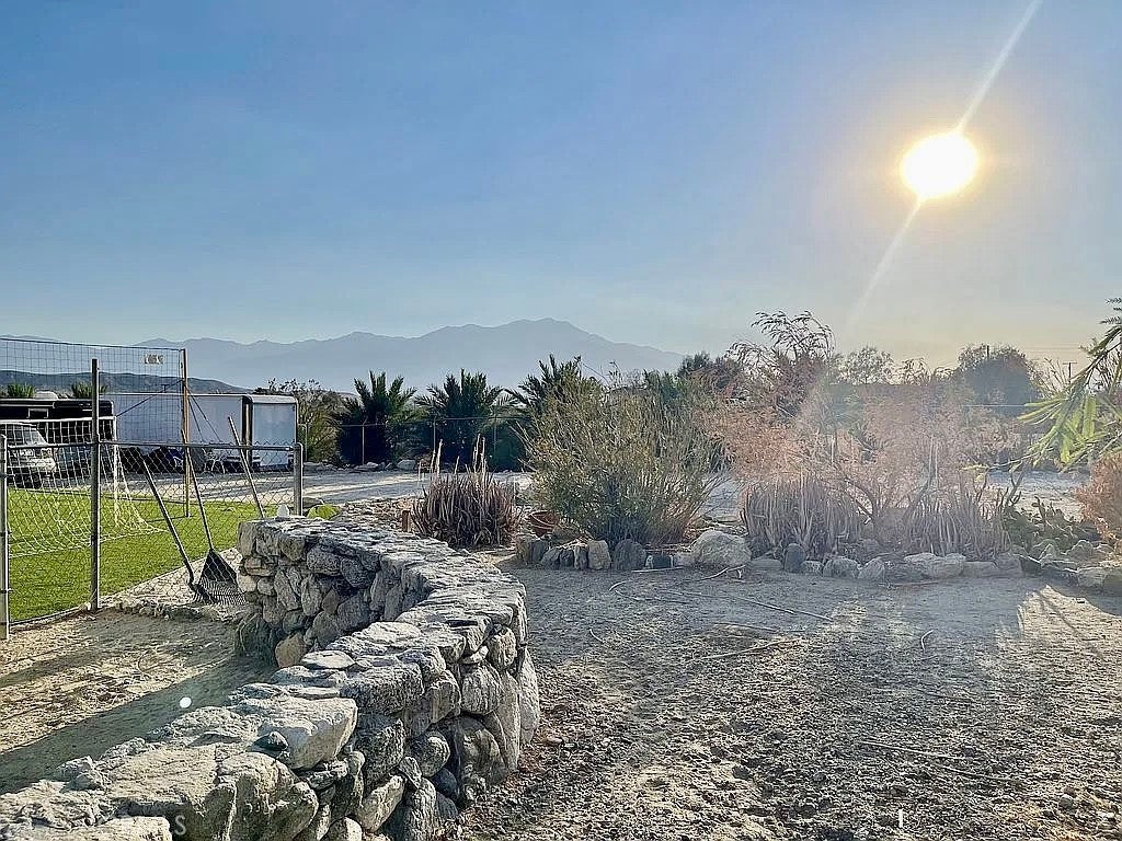 Escape the city and enjoy serene, private living on this gorgeous 2.5-acre property featuring over 65 Medjool Date trees with room to plant many more. Zoned for agriculture and equestrian use, this secluded retreat offers spectacular mountain and desert vistas, perfect for appreciating stunning sunsets, sunrises, and starry nights in peace. The charming, furnished 4-bedroom, 1-bath Sky Valley home boasts a European kitchen with white and gray granite countertops, Old World cabinetry, and spacious dining area. The bathroom features a high vanity with a glass bowl sink and an open tile shower. The living room is warm and inviting, with French doors and a real wood-burning stove, complemented by a spacious 6’ x 40’ screened-in porch for outdoor relaxation. A fourth bedroom on the west side of the home provides additional flexibility. Outside, the property includes a trailer for a project ideal for guests, a caretaker, or in-law quarters as well as four sheds for storage. For entertainment and gatherings there is 20’x40’ concrete slab on the lower part of the property offers versatile space for additional projects or structures. The home is partially gated for privacy and features a covered carport, making it perfect for families, artists, musicians, or contractors seeking a peaceful rural lifestyle. This property offers a unique blend of natural beauty, functional living spaces, and agricultural potential, or just a private getaway for those seeking a weekend home