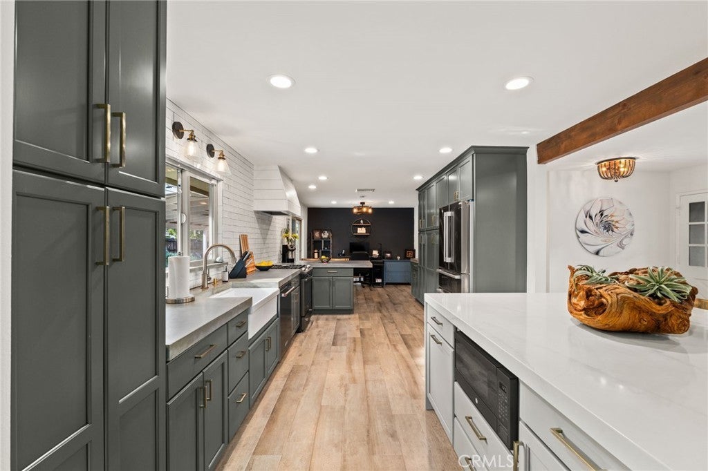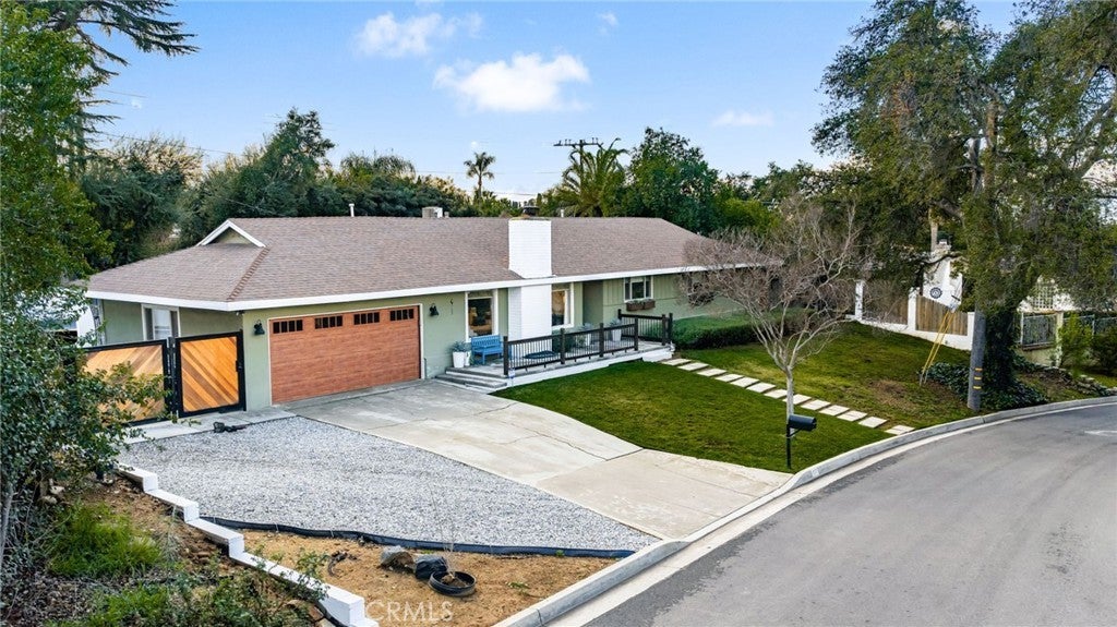 Turnkey, single story South Redlands pool home with gated RV parking, no HOA, and an attached garage with over 15,000 sq ft of land! Located just off of Sunset, this fully renovated ranch home offers a fabulous (and very quiet) South Redland location. You're greeted by a front porch and tremendous parking - including gated RV parking - plenty of room for your toys or extra vehicles! Enter the home into the living room, with a cozy fireplace and direct access to the backyard via french doors. This room offers tremendous natural light. The renovated kitchen features an oversized island, and plenty of storage with soft close drawers. All of the stainless steel appliances are included. There is a formal dining area off the kitchen adjacent to the garage with direct access. Another dining area opposite that (currently set up as a home office) offers patio access with a sliding glass door. The primary bedroom features it's own 3/4 bath with a walk in shower, and a walk in closet. Both restrooms have been fully updated. Stepping outside, you'll find a PebbleTec pool, a covered patio for al fresco dining, and a sizable lawn as well. Most of the furniture is also available for purchase. Excellent Redlands schools.