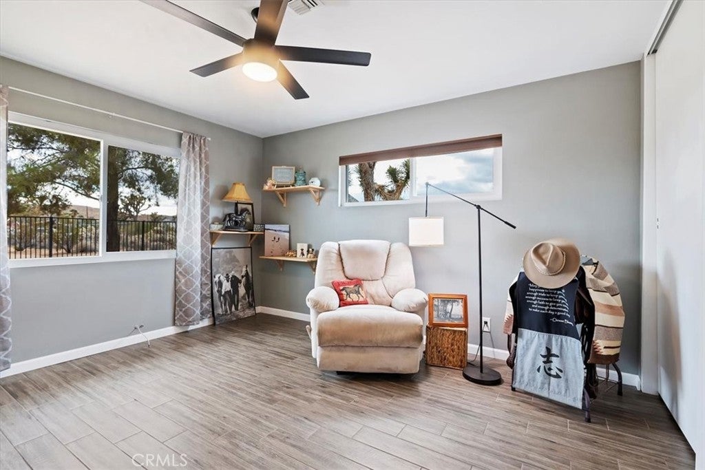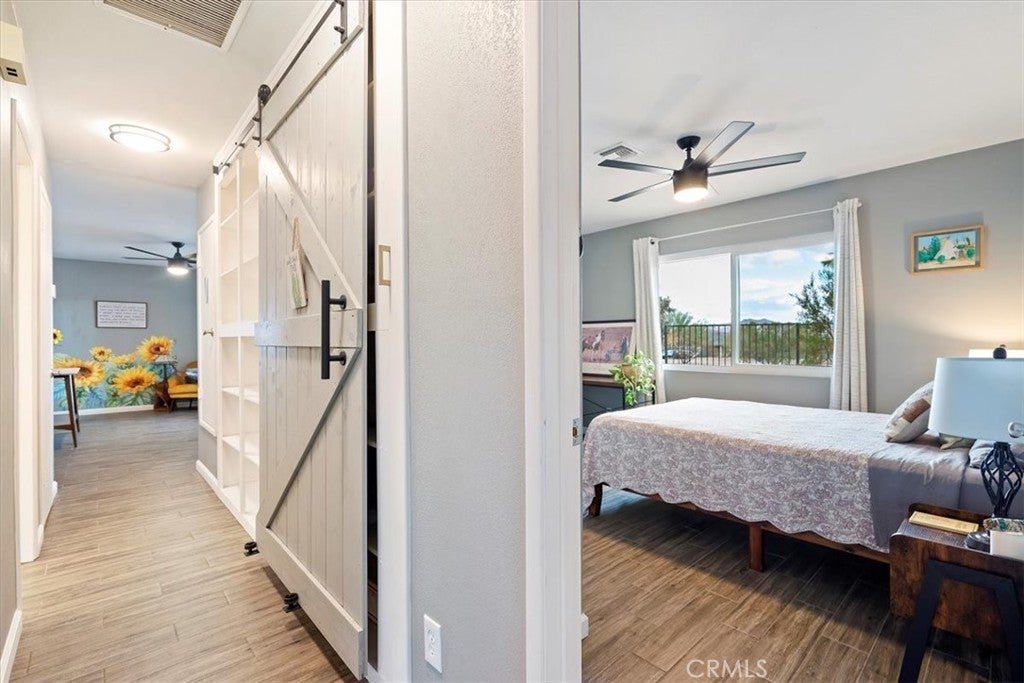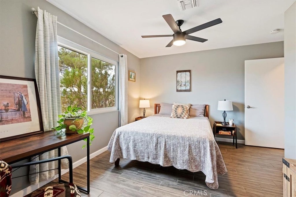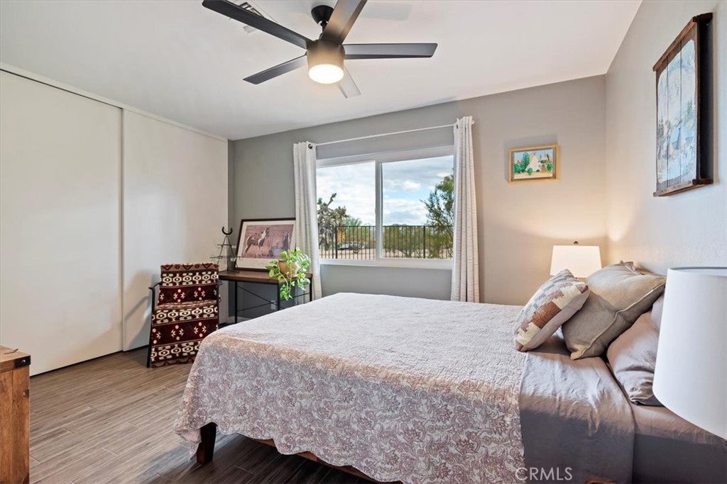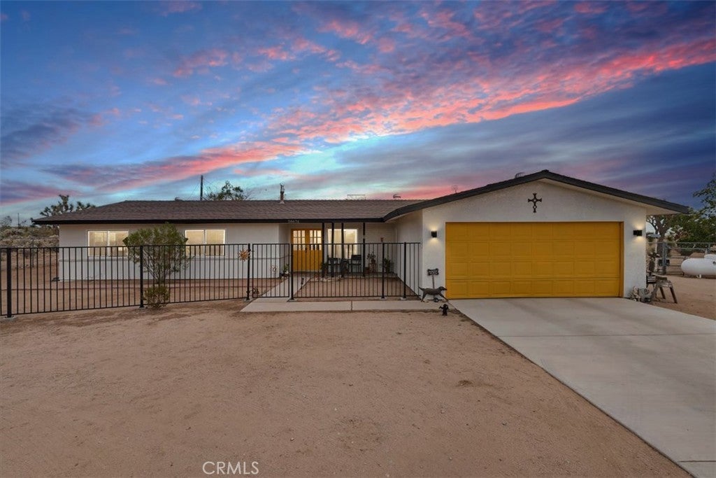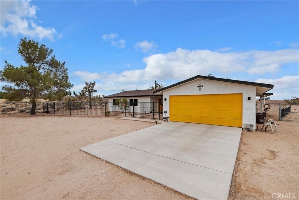 Dreamy desert oasis located on 1.25 acres in Yucca Valley! **ACTIVE SHORT TERM RENTAL WITH PERMIT** This gorgeous home is just 10 minutes from Joshua Tree National Park & minutes from restaurants, shops, and entertainment! The home is remodeled and move-in ready with newer HVAC, Energy star rated windows, porcelain tile flooring and more! The expansive lot offers endless possibilities with a large covered patio, spacious shed, and a reliable Generac backup generator, so you’re always prepared! Step inside through double doors to an open living room, complete with cozy fireplace. The remodeled kitchen features elegant quartz countertops, recessed lighting, brand new stove, and ample cabinetry. Upgraded porcelain tile floors continue throughout the home, extending to the generously sized bedrooms with expansive desert views from each room. The spacious primary bedroom offers two closets and an ensuite bathroom with a newly tiled shower and tub. The hallway bath has also been updated with an accessible walk-in shower. Enjoy privacy and natural beauty with two mulberry trees, several iconic Joshua trees, and a solar-powered motorized gate completing the serene surroundings. Furniture negotiable!**