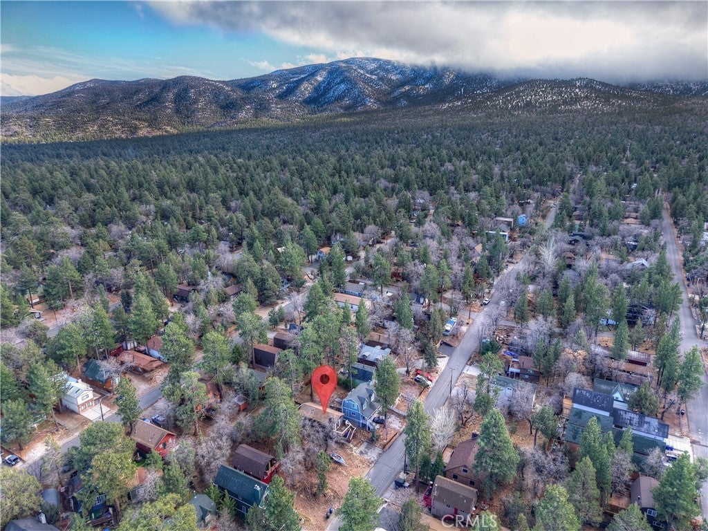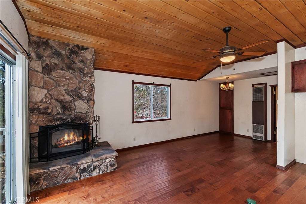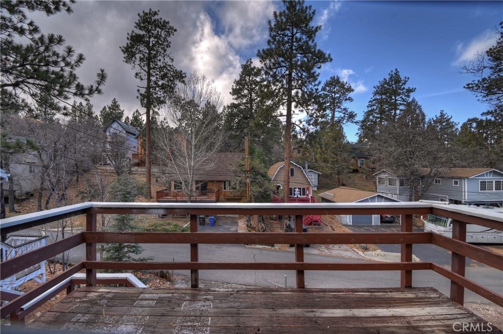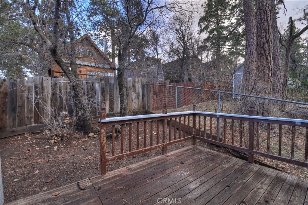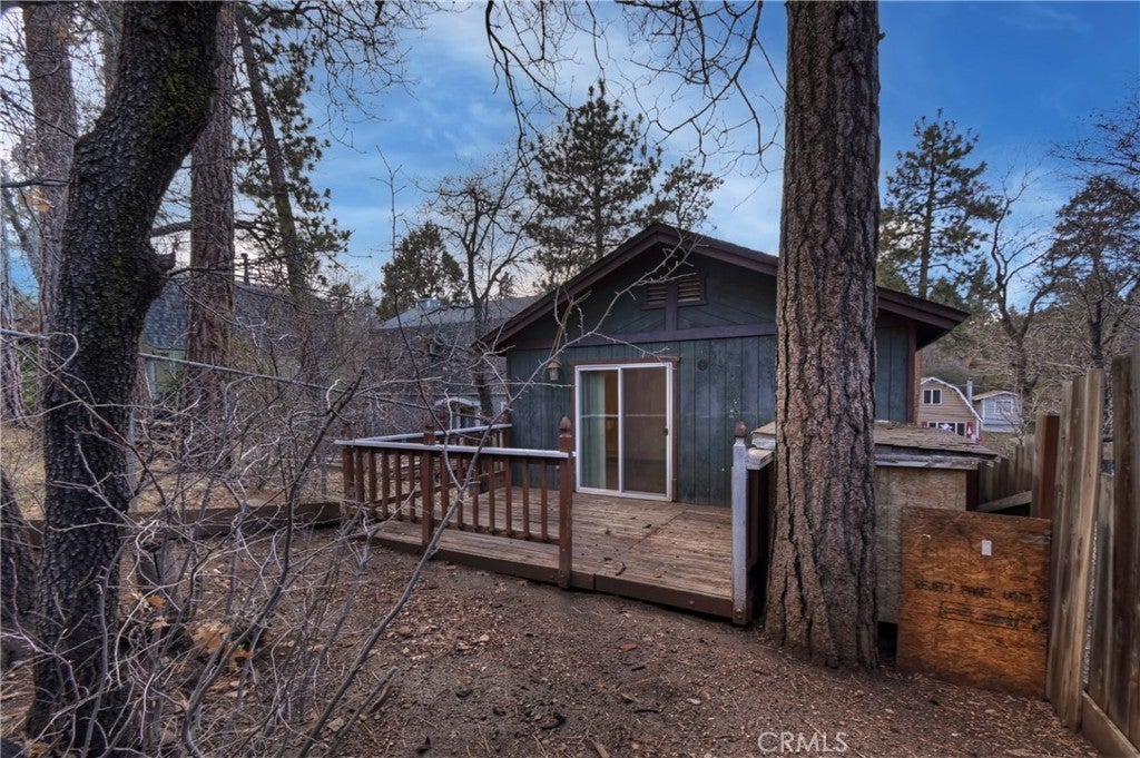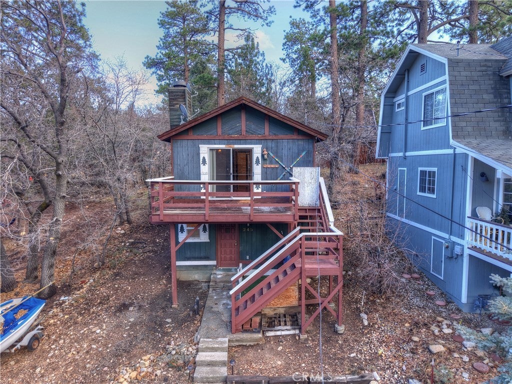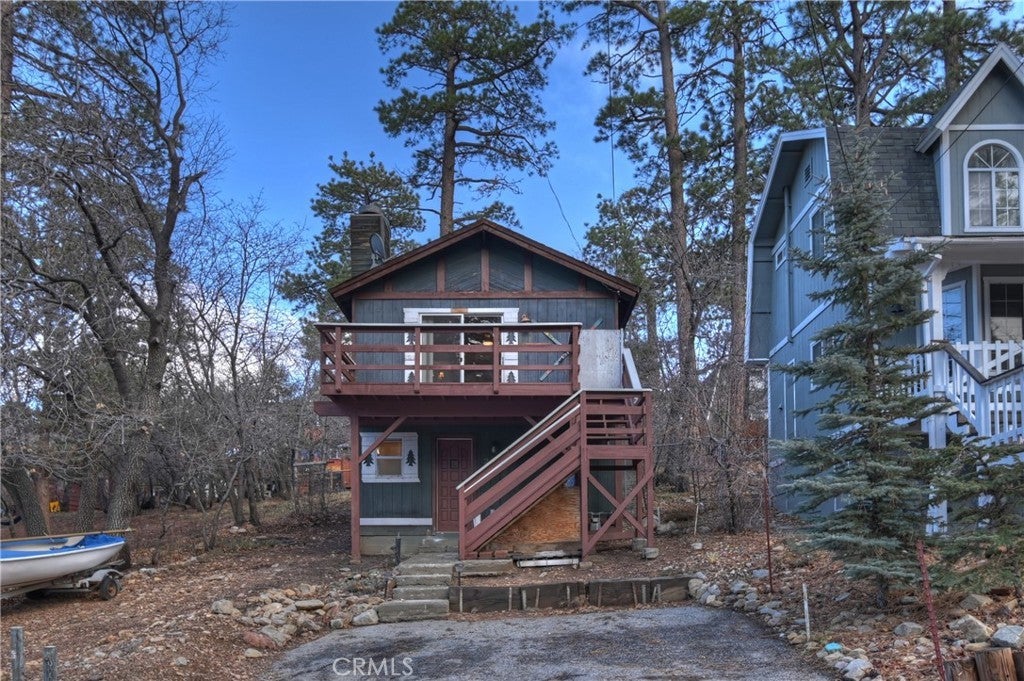 Chalet style home located in Sugarloaf ~ This reverse floor plan features 2 bedrooms and 1.5 bathrooms ~ A mud room, one bedroom, a half-bathroom with laundry hookups, and a large closet are on the entry level ~ The other bedroom with large closet is upstairs, alongside the main living area, and the full bathroom ~ The living room, kitchen, and dining area on the second level are an open space to gather, and have laminate flooring, an inviting rock fireplace, T&G ceilings, and an abundance of natural light ~ Enjoy outdoor living on two decks, with one in the front, and one in the rear with a storage area, ideal for relaxing or entertaining ~ The yard is partially fenced ~ Situated near hiking trails and the National Forest, with convenient access to Big Bear Lake, ski resorts, and local amenities.