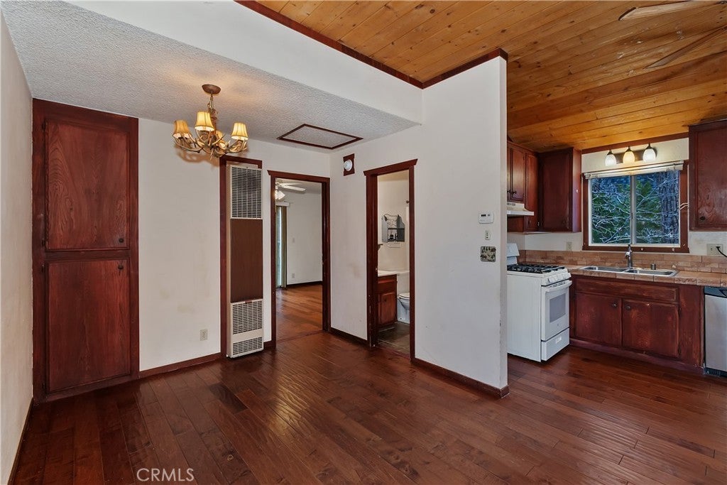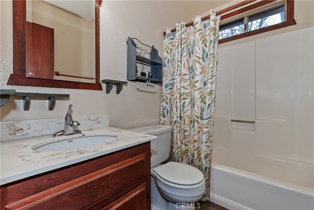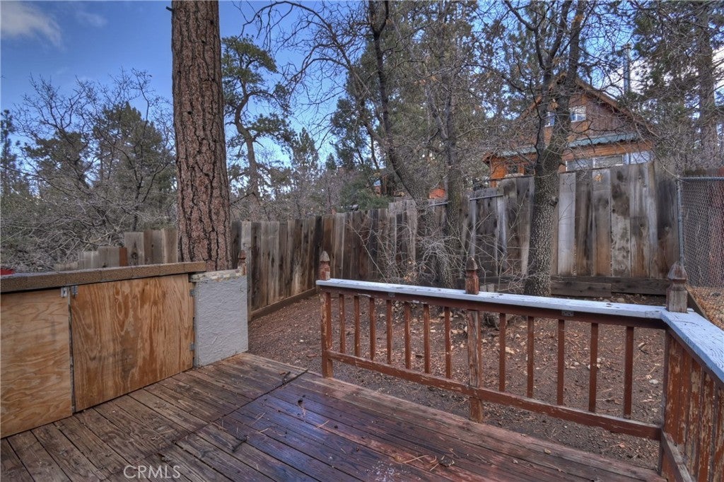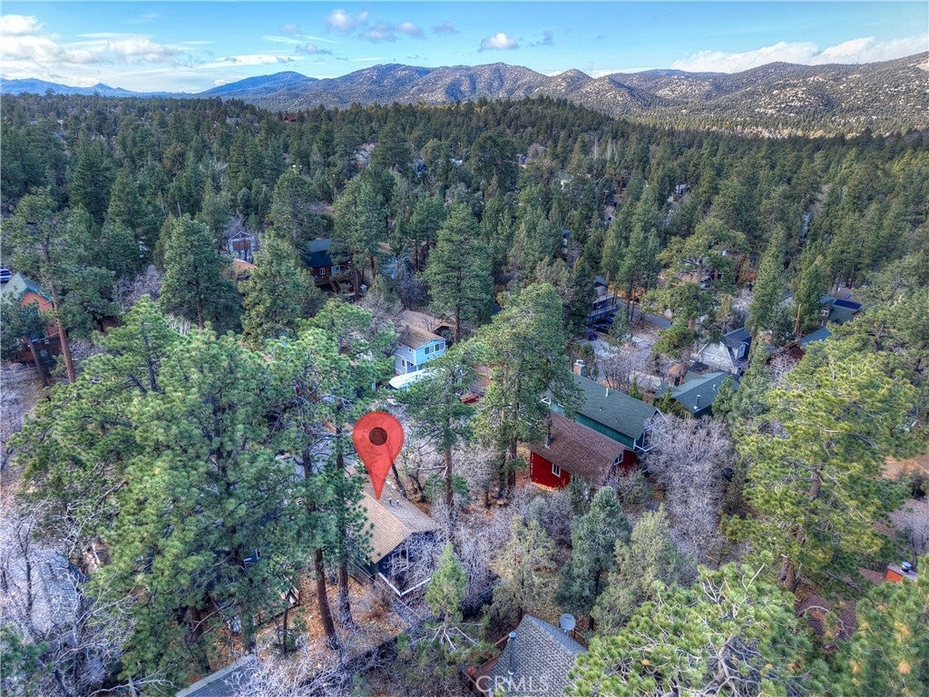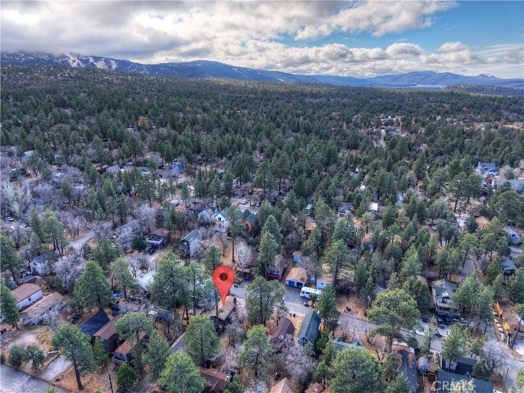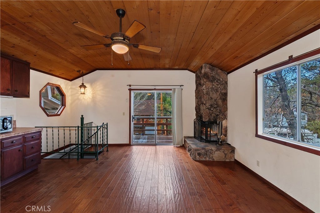 Chalet style home located in Sugarloaf ~ This reverse floor plan features 2 bedrooms and 1.5 bathrooms ~ A mud room, one bedroom, a half-bathroom with laundry hookups, and a large closet are on the entry level ~ The other bedroom with large closet is upstairs, alongside the main living area, and the full bathroom ~ The living room, kitchen, and dining area on the second level are an open space to gather, and have laminate flooring, an inviting rock fireplace, T&G ceilings, and an abundance of natural light ~ Enjoy outdoor living on two decks, with one in the front, and one in the rear with a storage area, ideal for relaxing or entertaining ~ The yard is partially fenced ~ Situated near hiking trails and the National Forest, with convenient access to Big Bear Lake, ski resorts, and local amenities.