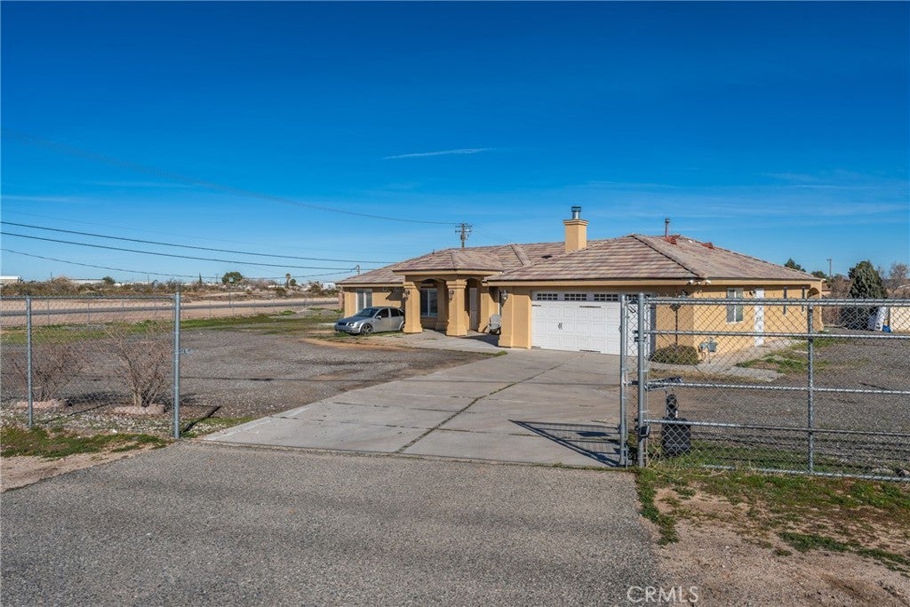Centrally located Hesperia home situated on a usable 1.4 acre corner lot with remote gate access, offering space, privacy, and flexibility for a variety of uses. This single story ranch style home features a split open floor plan, high ceilings, and 4 bedrooms with 3 bathrooms. Tile flooring runs throughout the main living areas, kitchen, bathrooms, and hallways, creating a clean and cohesive layout. The open floor plan allows the kitchen, dining, and living areas to flow together, making the home ideal for everyday living and entertaining. The kitchen features granite countertops, ample cabinetry, generous counter space, and a center island. The living room includes a fireplace and direct access to the backyard, enhancing the indoor outdoor connection. The primary suite offers a private retreat with an en suite bathroom featuring dual sinks, a separate soaking tub and shower, and a large closet. Secondary bedrooms are well sized and versatile for guests, home office use, or additional living needs. The exterior offers an expansive covered wraparound patio ideal for outdoor living. The fully usable land provides excellent potential for recreation, storage or future improvements. Originally built as a model home, this property includes numerous upgrades throughout and offers a rare combination of space and functionality.