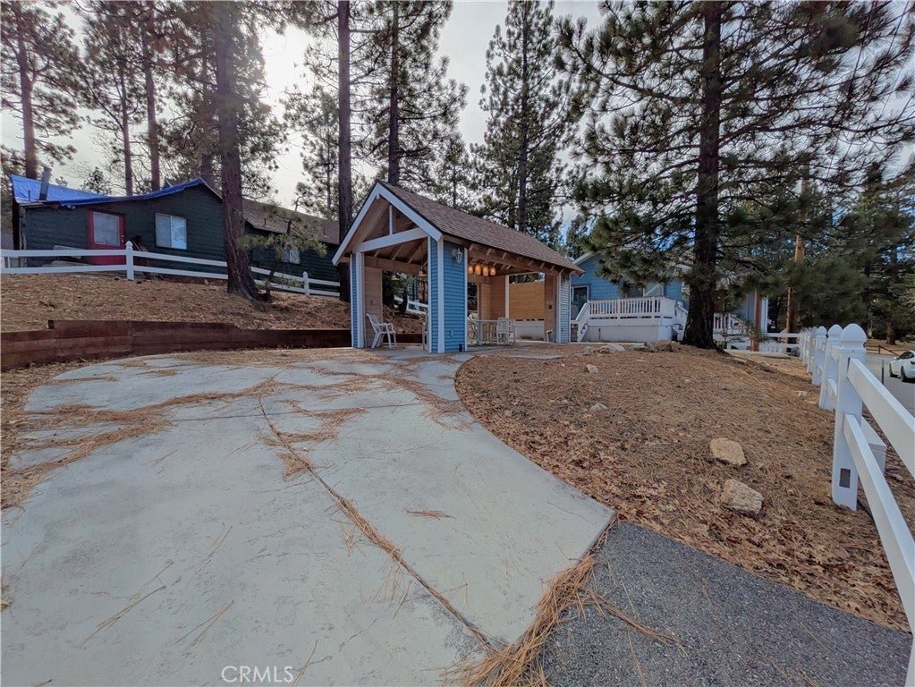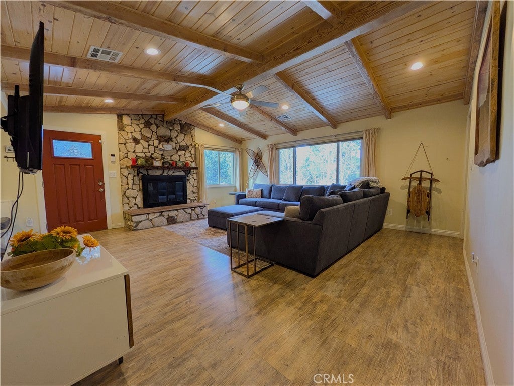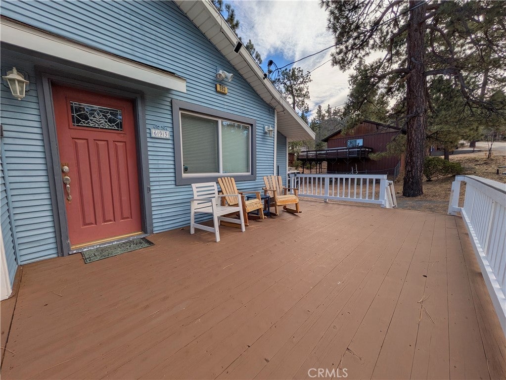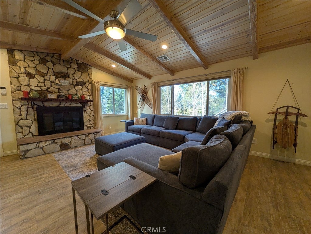 Welcome to your perfect mountain escape in the heart of Big Bear Lake. Ideally located within walking distance to Big Bear Village and the lake, this beautifully remodeled 3 bedroom, 3 bathroom home offers the ultimate blend of luxury, comfort, and convenience. With 1,783 square feet of thoughtfully designed living space, this turnkey property comes fully furnished, including all appliances, making it truly move-in or rental ready! Inside, the home has been completely remodeled throughout and showcases luxury vinyl plank flooring, modern finishes, and a warm mountain aesthetic. The family room is a standout, featuring soaring natural wood ceilings and a stunning wood-burning rock fireplace that creates an inviting atmosphere for relaxing evenings after a day on the mountain. Large windows fill the space with natural light and enhance the open, airy feel. The upgraded kitchen is designed for both everyday living and entertaining, complete with quartz countertops, stainless steel appliances, and ample cabinetry. A spacious full bathroom is conveniently located on the main floor, along with one of two primary bedrooms, offering flexibility for guests or multigenerational living. Downstairs, you will find a second primary bedroom that is tucked away from the rest of the home. This unique space has its own separate entrance and can function as a secure guest suite or private accommodation, adding versatility and rental appeal. A huge bonus room downstairs provides endless possibilities and can be used as a game room, home theater, or additional entertaining space. There is also a large, lockable storage room, perfect for gear, supplies, or owner storage. Outdoor living is just as impressive. Enjoy a large front porch ideal for morning coffee or evening sunsets, and a spacious rear patio featuring a private spa for year-round relaxation. The backyard pavilion includes lighting and electricity, making it perfect for outdoor gatherings, dining, or events. Parking is easy with private parking in front of the home as well as a gated rear driveway. Whether you are looking for your own private mountain getaway or a short-term rental investment, this home checks every box. Its unbeatable location, fully furnished turnkey condition, flexible layout, and exceptional amenities make it a fantastic opportunity in Big Bear Lake.
