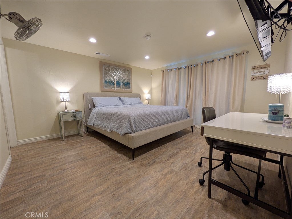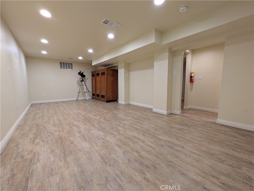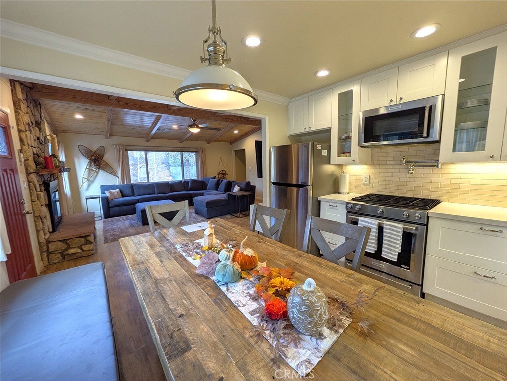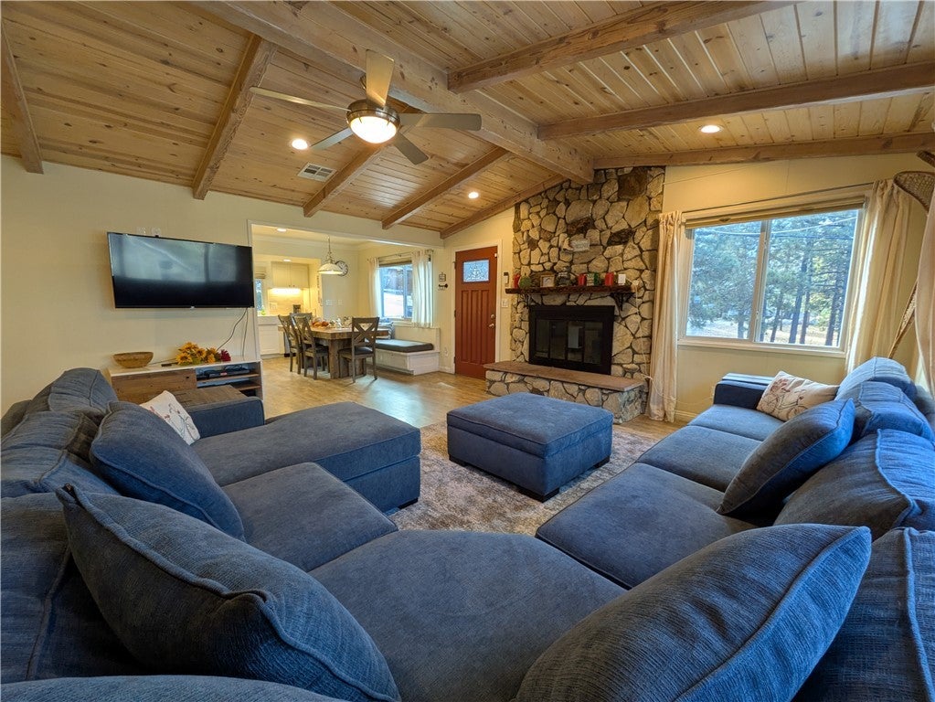 Welcome to your perfect mountain escape in the heart of Big Bear Lake. Ideally located within walking distance to Big Bear Village and the lake, this beautifully remodeled 3 bedroom, 3 bathroom home offers the ultimate blend of luxury, comfort, and convenience. With 1,783 square feet of thoughtfully designed living space, this turnkey property comes fully furnished, including all appliances, making it truly move-in or rental ready! Inside, the home has been completely remodeled throughout and showcases luxury vinyl plank flooring, modern finishes, and a warm mountain aesthetic. The family room is a standout, featuring soaring natural wood ceilings and a stunning wood-burning rock fireplace that creates an inviting atmosphere for relaxing evenings after a day on the mountain. Large windows fill the space with natural light and enhance the open, airy feel. The upgraded kitchen is designed for both everyday living and entertaining, complete with quartz countertops, stainless steel appliances, and ample cabinetry. A spacious full bathroom is conveniently located on the main floor, along with one of two primary bedrooms, offering flexibility for guests or multigenerational living. Downstairs, you will find a second primary bedroom that is tucked away from the rest of the home. This unique space has its own separate entrance and can function as a secure guest suite or private accommodation, adding versatility and rental appeal. A huge bonus room downstairs provides endless possibilities and can be used as a game room, home theater, or additional entertaining space. There is also a large, lockable storage room, perfect for gear, supplies, or owner storage. Outdoor living is just as impressive. Enjoy a large front porch ideal for morning coffee or evening sunsets, and a spacious rear patio featuring a private spa for year-round relaxation. The backyard pavilion includes lighting and electricity, making it perfect for outdoor gatherings, dining, or events. Parking is easy with private parking in front of the home as well as a gated rear driveway. Whether you are looking for your own private mountain getaway or a short-term rental investment, this home checks every box. Its unbeatable location, fully furnished turnkey condition, flexible layout, and exceptional amenities make it a fantastic opportunity in Big Bear Lake.