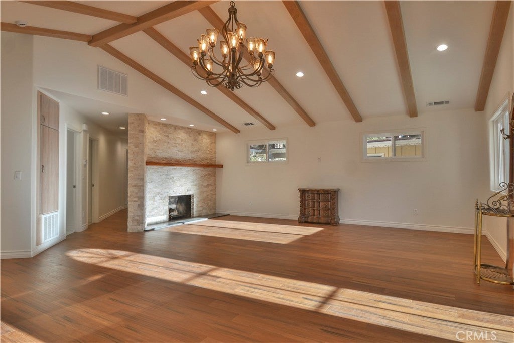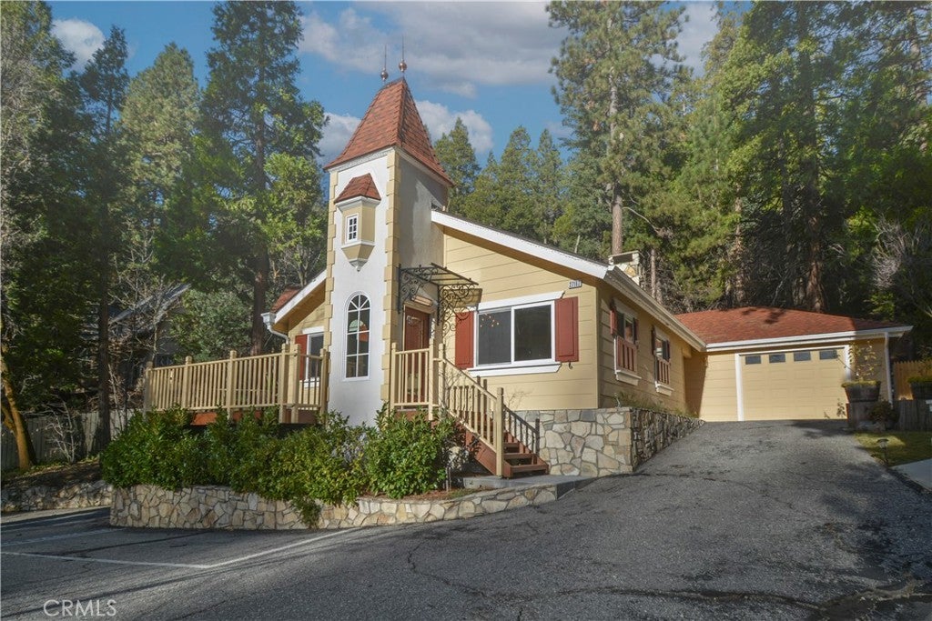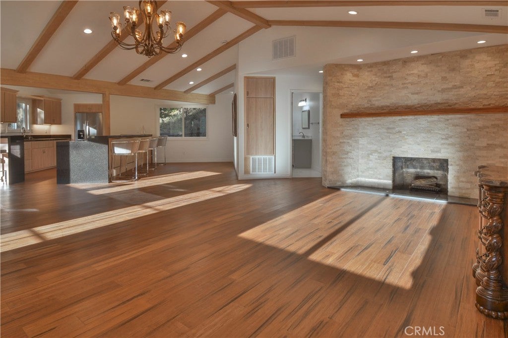 Completed May 25, 2025, this never-occupied new construction sits on a quiet knoll with just two neighboring homes—right in Blue Jay and an easy walk to shopping and dining, with quick access to Hwy 18. Designed for low-maintenance living, the home features 2 bedrooms and an airy open floor plan anchored by a chef’s bar and a long black granite counter with seating. The dining area accommodates a table for eight and flows into the living room with vaulted beamed ceilings, hardwood floors, and a stone-mantled fireplace. Step outside to a generous entertaining deck and take in the elevated setting. New appliances (never used), a custom bath, level entry, a deep attached garage, two extra parking spaces, and a convenient bathroom in the garage round out the package. Owner may carry.