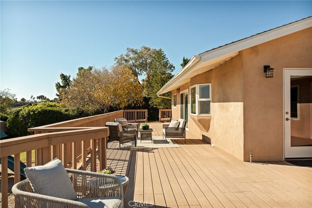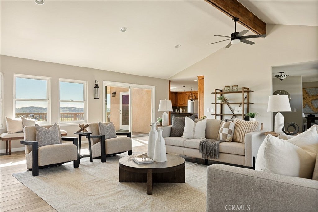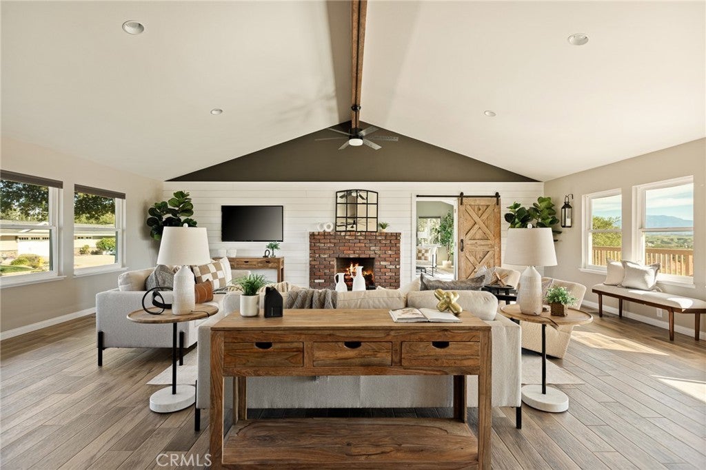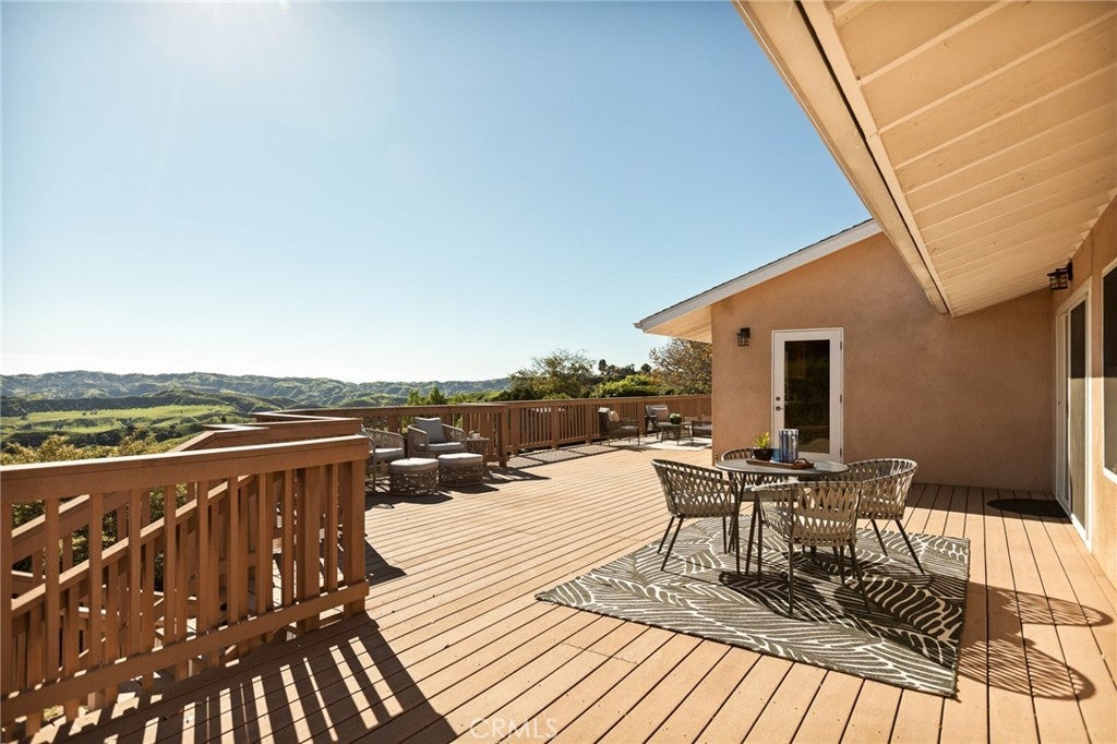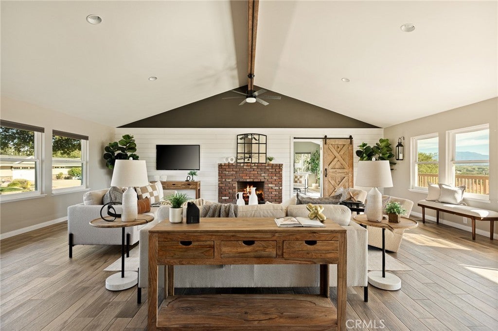 Spanning over 3,700 square feet, this exceptional 4-bedroom, 4-bathroom home is defined by dramatic architecture and breathtaking canyon views. The main level features a stunning great room with vaulted ceilings, exposed beam detail, a brick fireplace, and expansive windows that frame the surrounding hills. Sliding doors open to a massive Trex deck with multiple seating areas—ideal for entertaining or simply enjoying the sweeping views. The open-concept layout includes a dining area and a beautifully designed kitchen with a large center island and built-in banquette seating. The primary suite is a true retreat, offering vaulted ceilings, serene views, direct access to the rear deck, and a spacious en-suite bath with separate soaking tub and shower, dual vanities, and a walk-in closet. Two additional bedrooms and two bathrooms complete the main level. The lower level offers a private apartment with a sitting area, eat-in kitchen, bathroom, and separate bedroom with additional living space. Accessible from both the interior of the home and a private exterior entrance, this space also enjoys incredible canyon views—ideal for guests, extended family, or multigenerational living. Situated on a large lot with room for RV or boat parking.