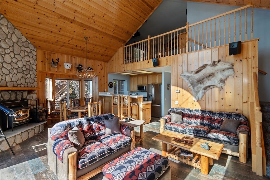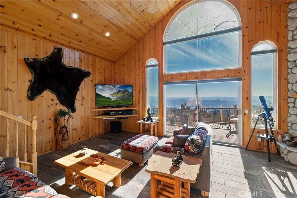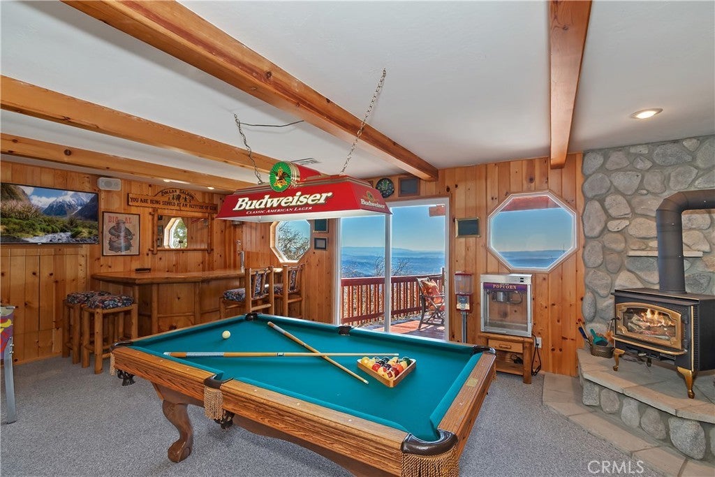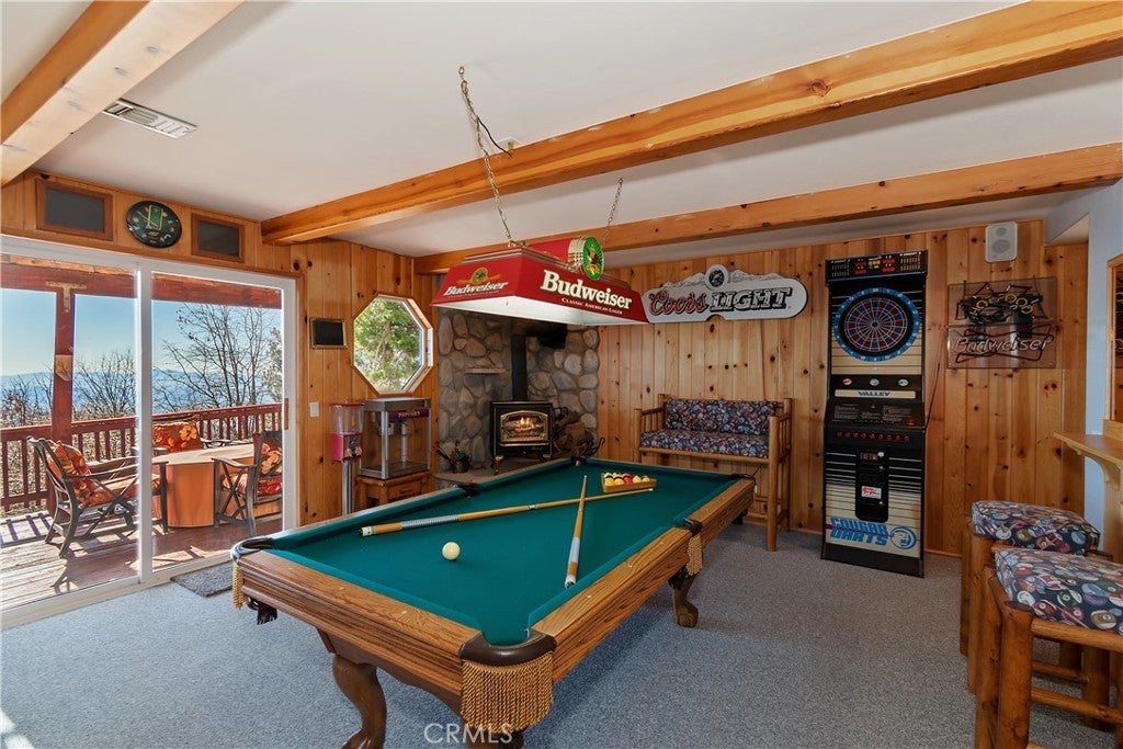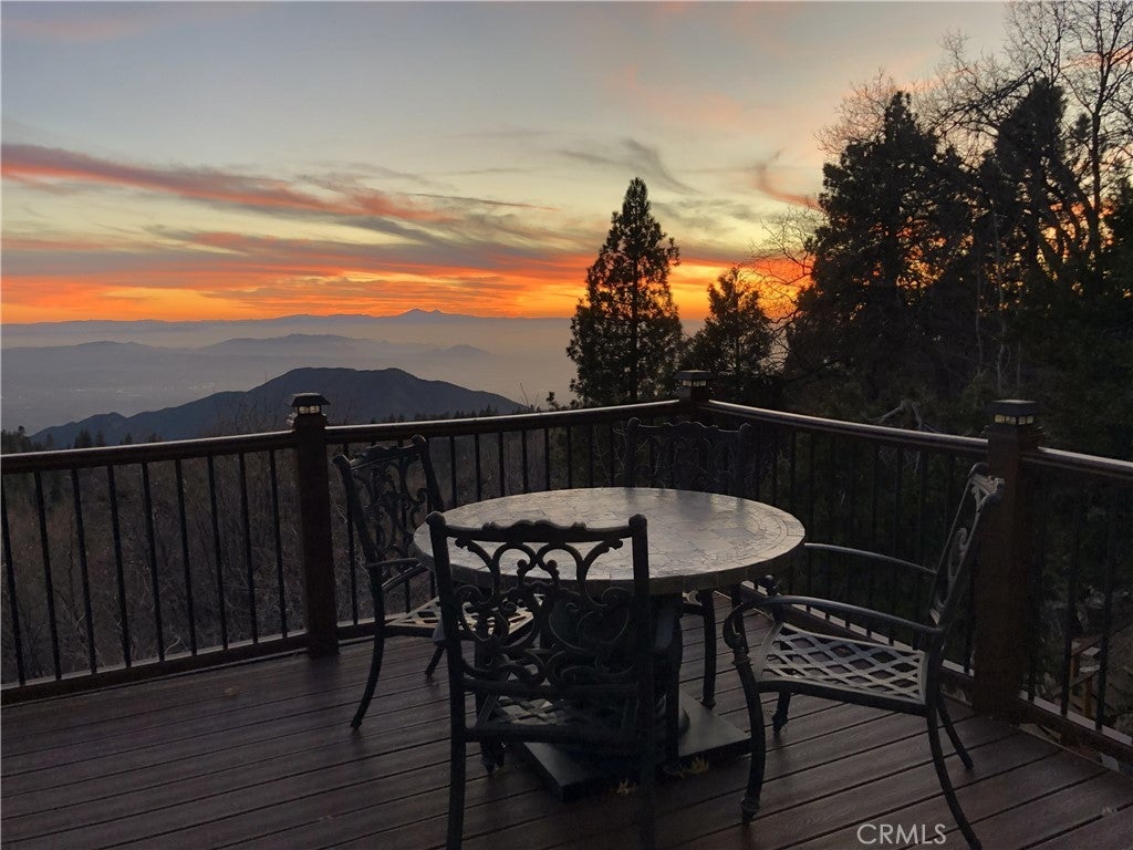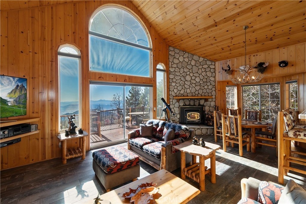 Welcome to your private mountain retreat! This stunning three-level home offers breathtaking panoramic views of sparkling city lights, majestic mountains, and lush forest canopy from multiple vantage points throughout the property. The main level welcomes you with an inviting living room anchored by a striking river rock fireplace, creating the perfect ambiance for relaxation. The well-appointed kitchen features a convenient breakfast bar and dining area, ideal for both casual meals and entertaining guests. Step through to the upper back deck and prepare to be captivated by the sweeping vistas that stretch before you. This level also includes a comfortable bedroom and full bathroom, offering convenient single-level living if desired. Ascend to the top level where the luxurious primary suite awaits. This serene retreat features its own cozy rock fireplace for intimate evenings and spectacular views to wake up to each morning. The spa-like primary bathroom is designed for indulgence, complete with dual sinks for busy mornings, a relaxing jetted tub for unwinding after a long day, and a separate walk-in shower. The lower level transforms into an entertainer's dream with a dedicated game room that includes a pool table and electronic dart board, perfect for hosting friends and family. The private bar adds a sophisticated touch for gatherings, while the laundry closet provides practical convenience. Another bedroom and full bathroom on this level ensure comfortable accommodations for guests, and access to the lower back deck provides yet another spectacular setting to enjoy those unforgettable views. With easy, level parking and thoughtful design throughout, this exceptional property offers the perfect blend of mountain living and modern comfort. Every level of this home has been crafted to maximize the stunning natural surroundings while providing the amenities and space for comfortable everyday living and memorable entertaining. This is a great, short drive location to Running Springs town, Hwy 330 for commuters, Snow Valley Ski Resort, Green Valley Lake, Sky Park At Santa's Village, etc.!