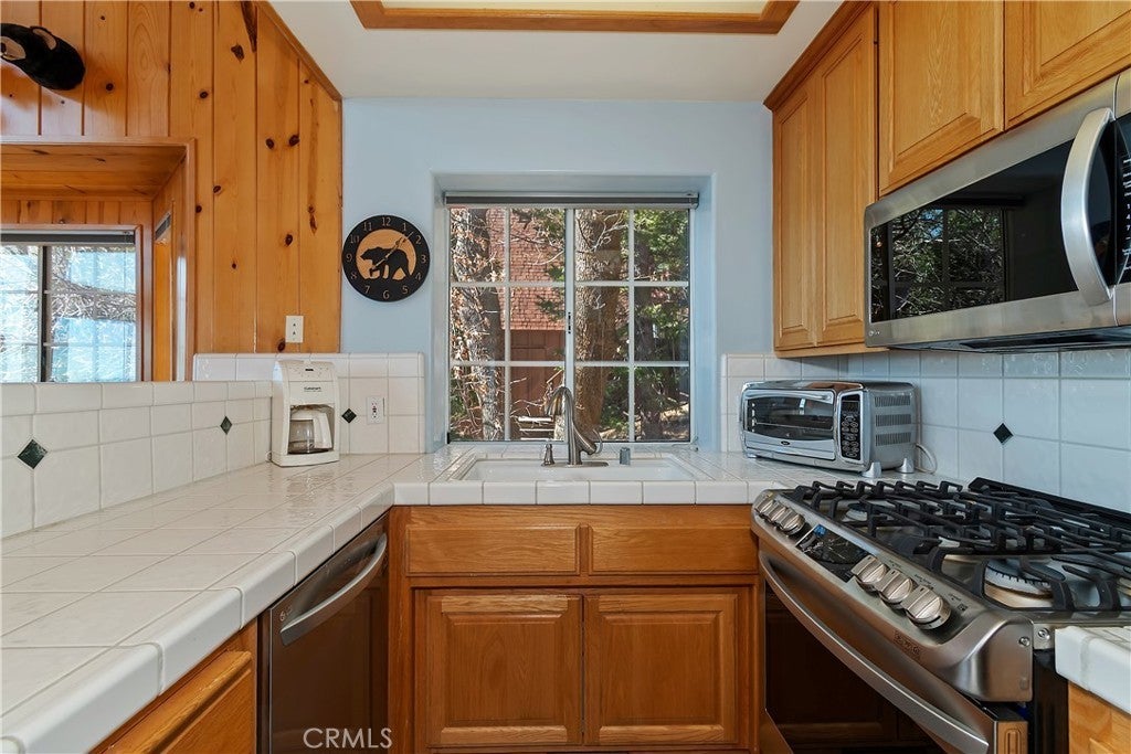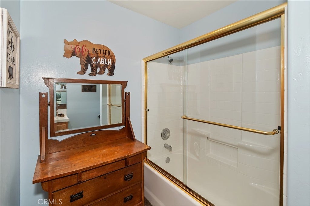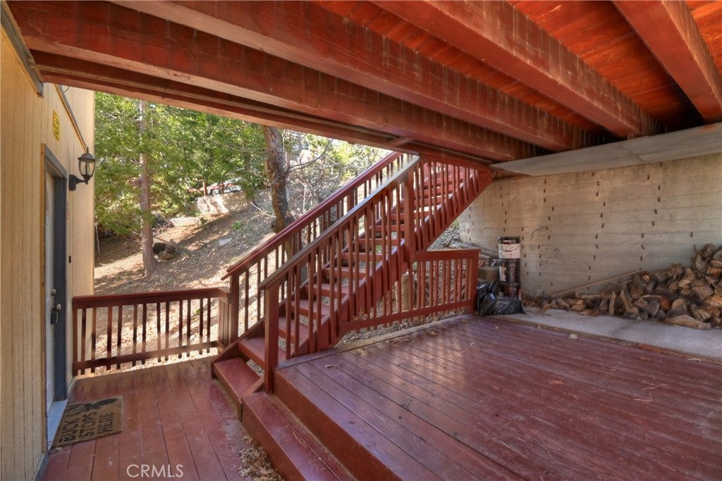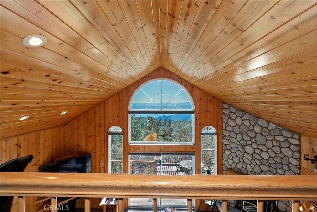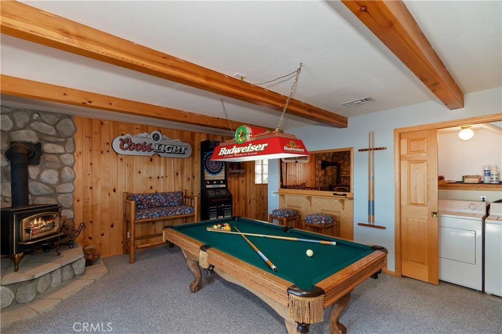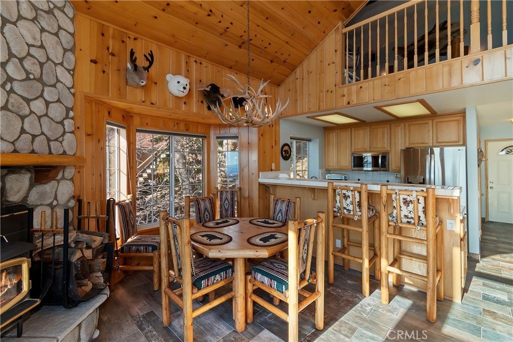 Welcome to your private mountain retreat! This stunning three-level home offers breathtaking panoramic views of sparkling city lights, majestic mountains, and lush forest canopy from multiple vantage points throughout the property. The main level welcomes you with an inviting living room anchored by a striking river rock fireplace, creating the perfect ambiance for relaxation. The well-appointed kitchen features a convenient breakfast bar and dining area, ideal for both casual meals and entertaining guests. Step through to the upper back deck and prepare to be captivated by the sweeping vistas that stretch before you. This level also includes a comfortable bedroom and full bathroom, offering convenient single-level living if desired. Ascend to the top level where the luxurious primary suite awaits. This serene retreat features its own cozy rock fireplace for intimate evenings and spectacular views to wake up to each morning. The spa-like primary bathroom is designed for indulgence, complete with dual sinks for busy mornings, a relaxing jetted tub for unwinding after a long day, and a separate walk-in shower. The lower level transforms into an entertainer's dream with a dedicated game room that includes a pool table and electronic dart board, perfect for hosting friends and family. The private bar adds a sophisticated touch for gatherings, while the laundry closet provides practical convenience. Another bedroom and full bathroom on this level ensure comfortable accommodations for guests, and access to the lower back deck provides yet another spectacular setting to enjoy those unforgettable views. With easy, level parking and thoughtful design throughout, this exceptional property offers the perfect blend of mountain living and modern comfort. Every level of this home has been crafted to maximize the stunning natural surroundings while providing the amenities and space for comfortable everyday living and memorable entertaining. This is a great, short drive location to Running Springs town, Hwy 330 for commuters, Snow Valley Ski Resort, Green Valley Lake, Sky Park At Santa's Village, etc.!