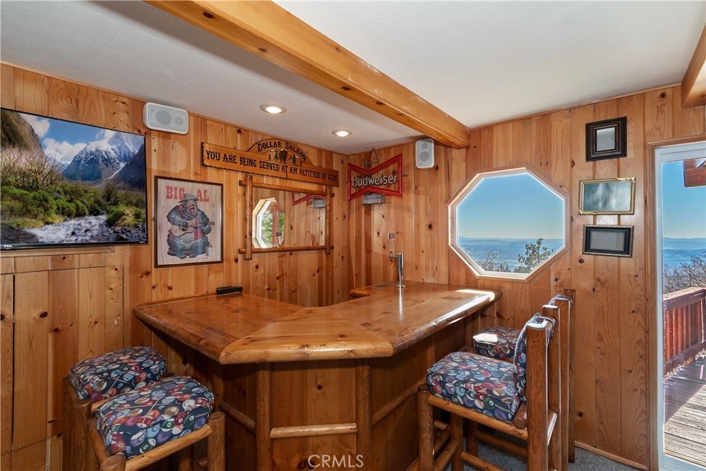 Beamed Ceilings, Wet Bar, Breakfast Bar, Built-in Features, Balcony, Ceramic Counters, Cathedral Ceiling(s), Furnished, High Ceilings, Living Room Deck Attached, Open Floorplan, Recessed Lighting, Two Story Ceilings, Bar, Wood Product Walls, Wired for Sound, Bedroom on Main Level, Central Vacuum, Galley Kitchen
