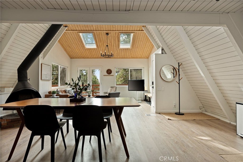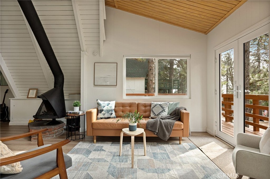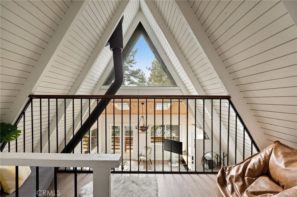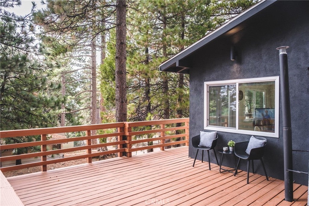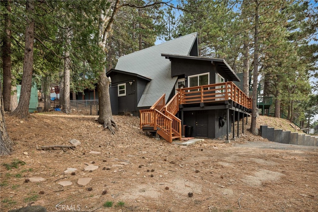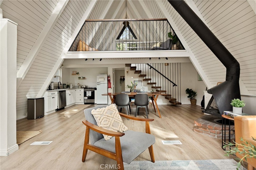 This modified A-frame sits on a spacious, almost level lot. Just a few stairs up to the front door where you are welcomed by an open plan living room with unique architectural features, beautiful natural light and a wood burning fireplace. The living room leads out onto a large deck - perfect for enjoying the fresh mountain air on summer evenings. The main living level also includes the dining area, kitchen and primary bedroom & bathroom. A slider in the bedroom opens to the fenced backyard. Upstairs is a loft bedroom. Laundry is in the buildup below, with lots of storage space too! Modern upgrades include an HVAC system for central heating, an electrical panel supporting EV charging access from the driveway, a smart thermostat, and a covered utility panel for reliable winter performance. Throughout the home, you will see newer SPC rigid-core luxury plank flooring and dual pane insulated windows. Offered fully furnished and sold as-is with designer-grade lighting, furnishings, and textiles. The property has an active STR permit, for a seamless income potential opportunity. Make this A Frame cabin your getaway today!