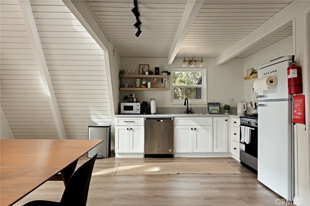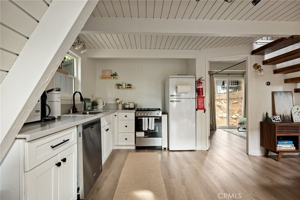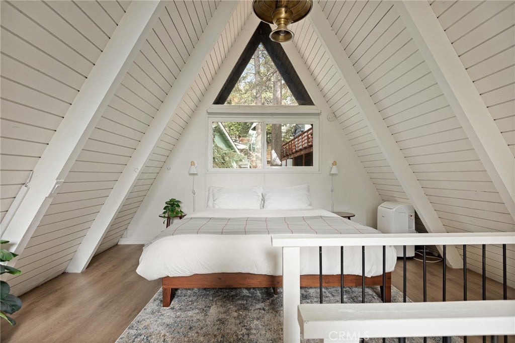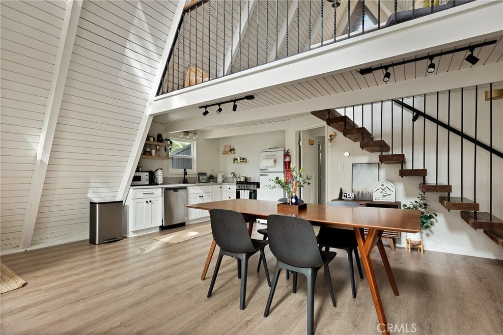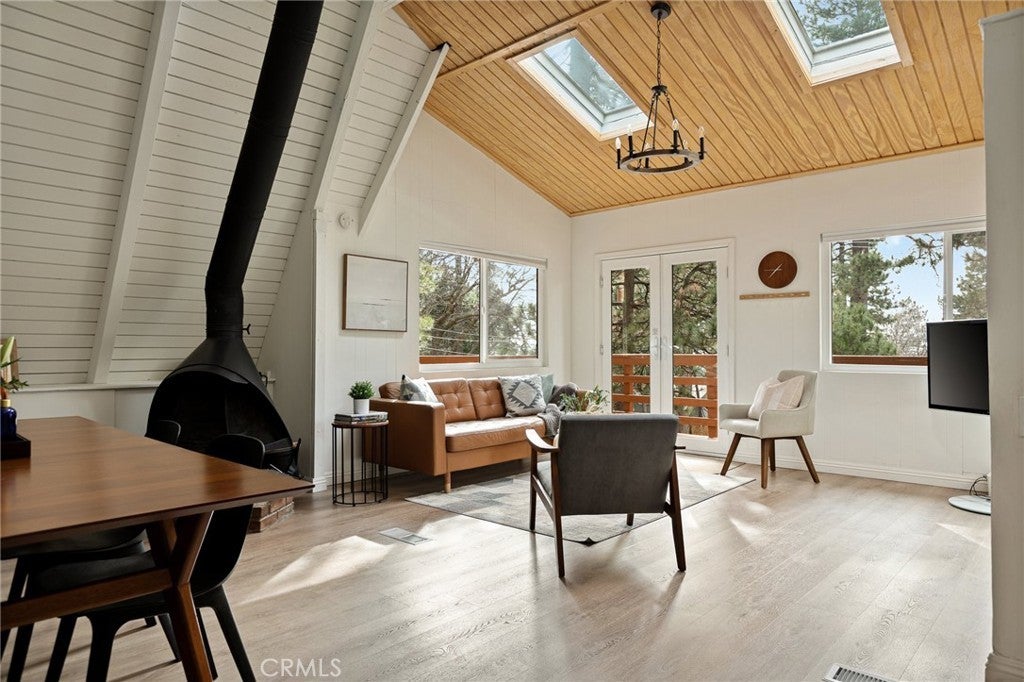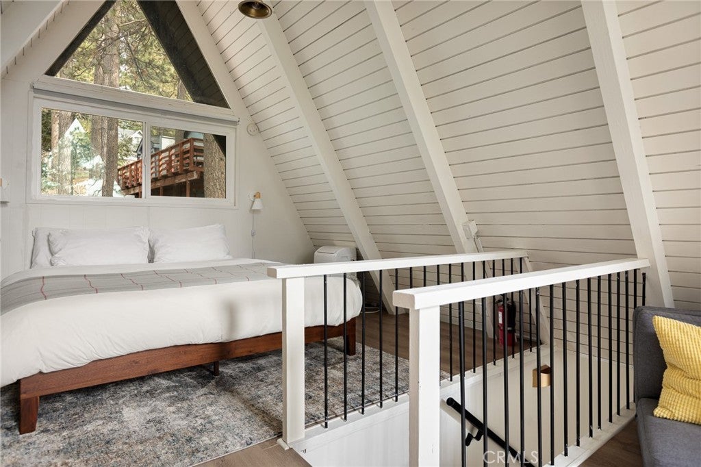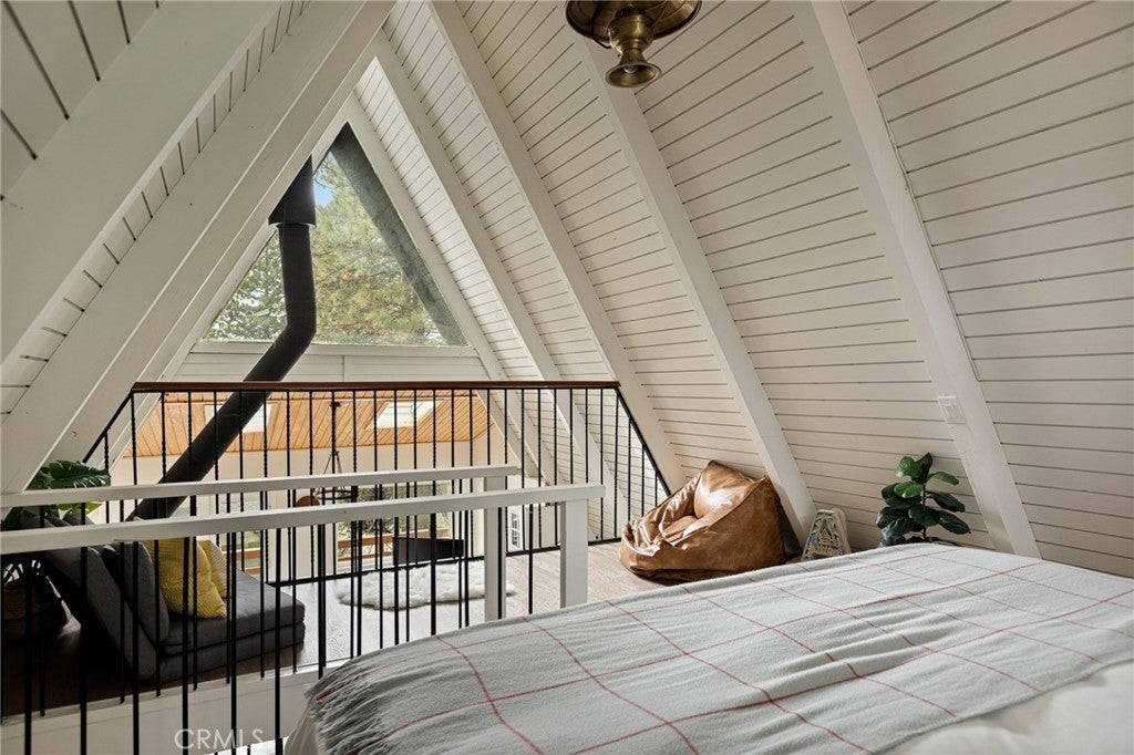 This modified A-frame sits on a spacious, almost level lot. Just a few stairs up to the front door where you are welcomed by an open plan living room with unique architectural features, beautiful natural light and a wood burning fireplace. The living room leads out onto a large deck - perfect for enjoying the fresh mountain air on summer evenings. The main living level also includes the dining area, kitchen and primary bedroom & bathroom. A slider in the bedroom opens to the fenced backyard. Upstairs is a loft bedroom. Laundry is in the buildup below, with lots of storage space too! Modern upgrades include an HVAC system for central heating, an electrical panel supporting EV charging access from the driveway, a smart thermostat, and a covered utility panel for reliable winter performance. Throughout the home, you will see newer SPC rigid-core luxury plank flooring and dual pane insulated windows. Offered fully furnished and sold as-is with designer-grade lighting, furnishings, and textiles. The property has an active STR permit, for a seamless income potential opportunity. Make this A Frame cabin your getaway today!