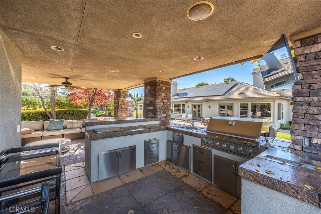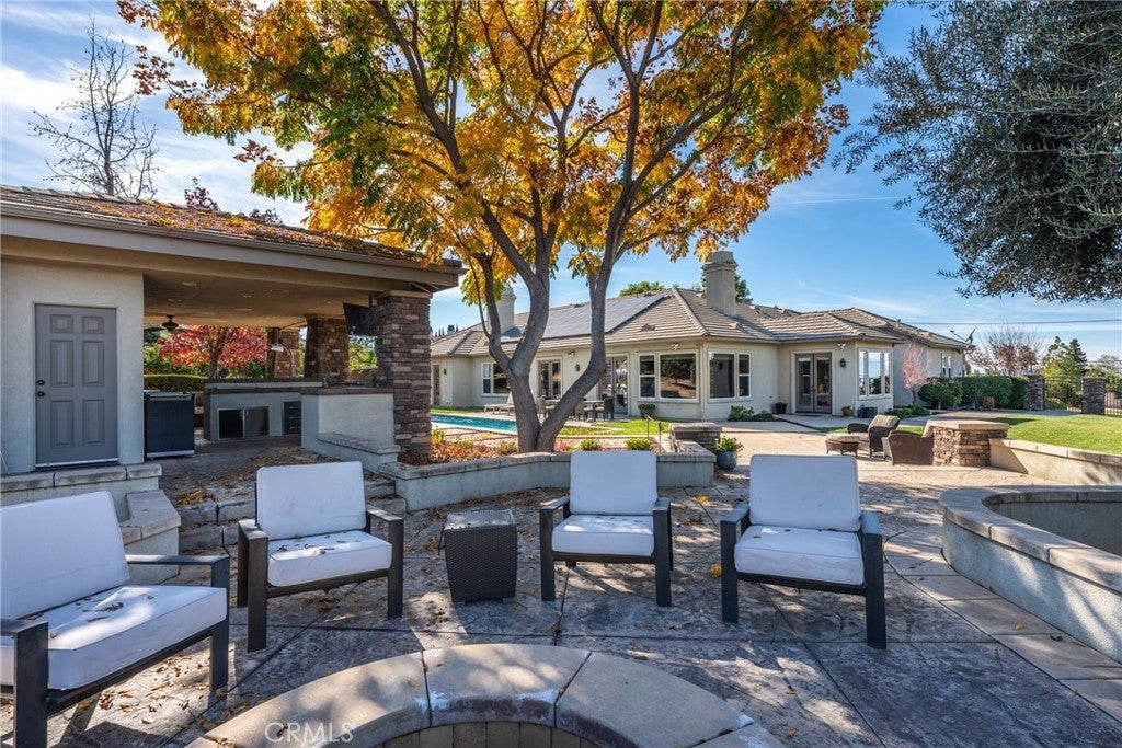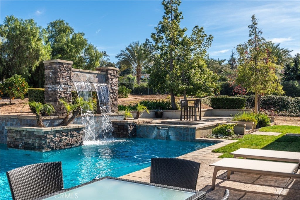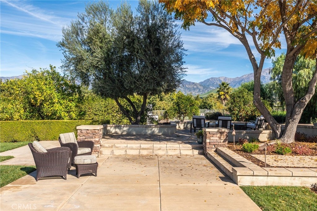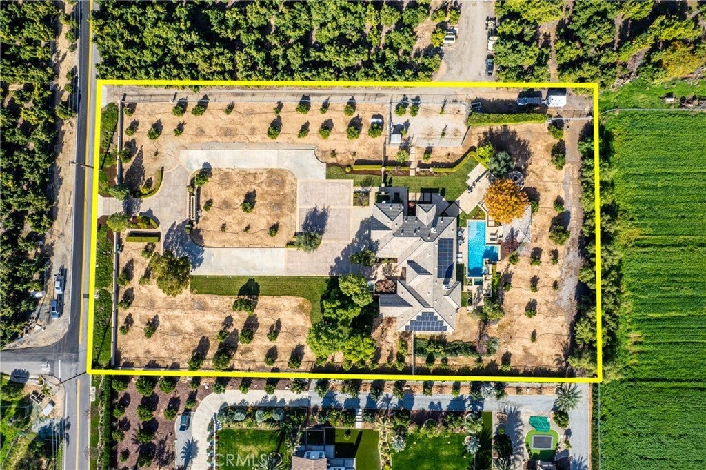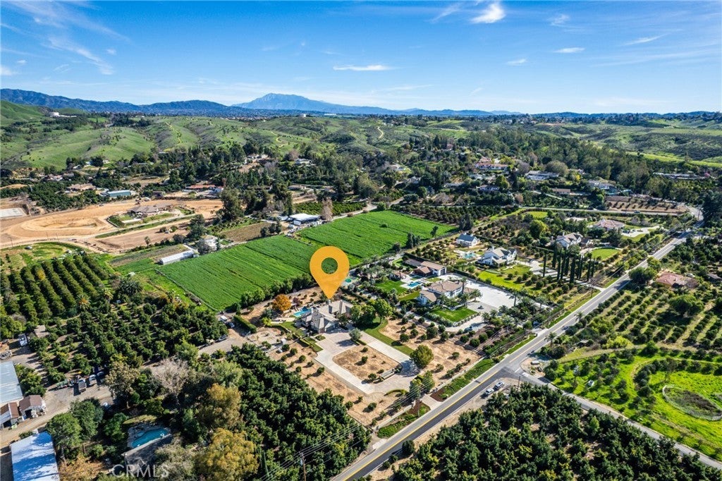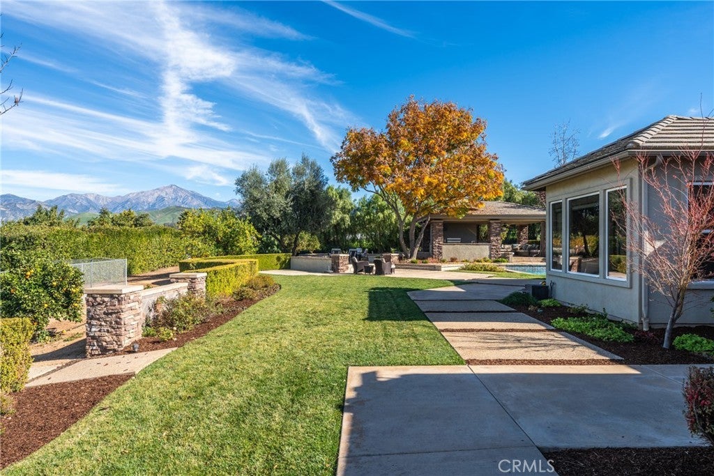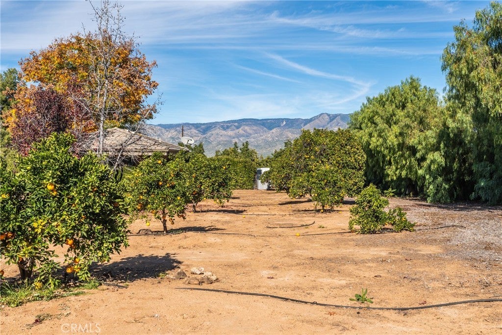 The beautiful Chateau L'Orange is situated on a private 2.5 acre lot; zoned agricultural and horse property with an abundance of fruit trees that have their own drip irrigation system supplied by the included water shares. There are gorgeous mountain views from everywhere and meticulously maintained landscape. The home is spacious and open with a freely flowing floor plan that works well for entertaining or just relaxing. Four ensuite bedrooms feature large closets as well as an office that could easily be converted to a 5th. The main boasts "his and hers closets", dual sinks, large shower, separate soaking tub and a makeup vanity. The dramatic entry looks directly out to the pool area with its waterfall feature, elevated spa, and separate covered outdoor kitchen & patio. Additionally, there is an RV parking area tucked in nicely between the back yard and neighbors citrus grove with its own road for easy access.
