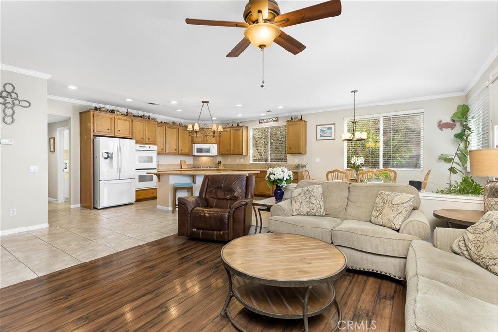 Welcome to 11924 Southwind Way located in the desirable Chapman Heights community of Yucaipa. This spacious 5 bedroom, 4 bathroom home offers 3,364 square feet of well-designed living space. The main floor features a full bedroom and bathroom, ideal for guests or multi-generational living, along with ceramic tile and wood laminate flooring throughout. The kitchen is perfect for entertaining with a large granite island, double ovens, 5 burner cooktop, built-in microwave, abundant cabinetry, and a large walk-in pantry. Additional storage includes a generous walk-in space beneath the staircase. Upstairs you’ll find a large loft area and an expansive primary suite with sitting area, ensuite bathroom, large walk-in closet, and newly rebuilt private balcony/deck. The backyard is low maintenance with multiple fruit trees (1 pear, 1 pomegranate, 4 apple, 1 cherry, 2 lemon, and 1 lime) and a covered patio with ceiling fans. Additional features include plantation shutters on front-facing windows and a three-car garage with a two-car garage plus separate single-car garage. Conveniently located near schools, shopping, dining, and golf in beautiful Chapman Heights.