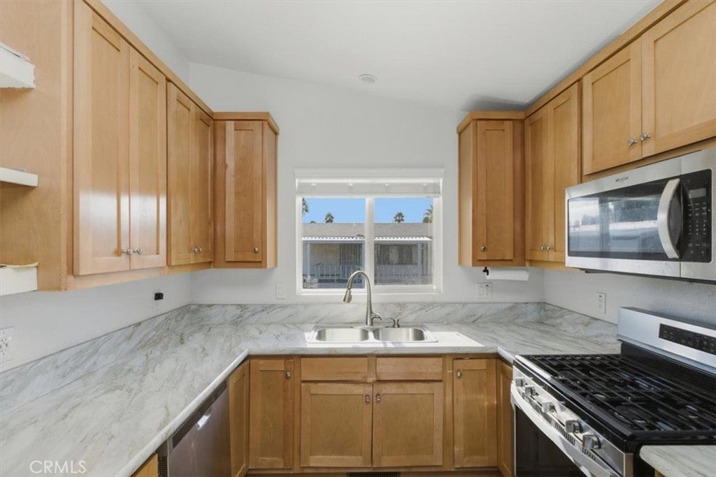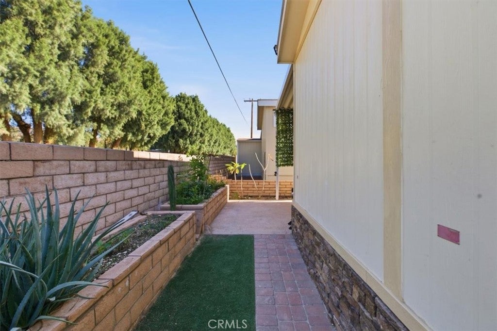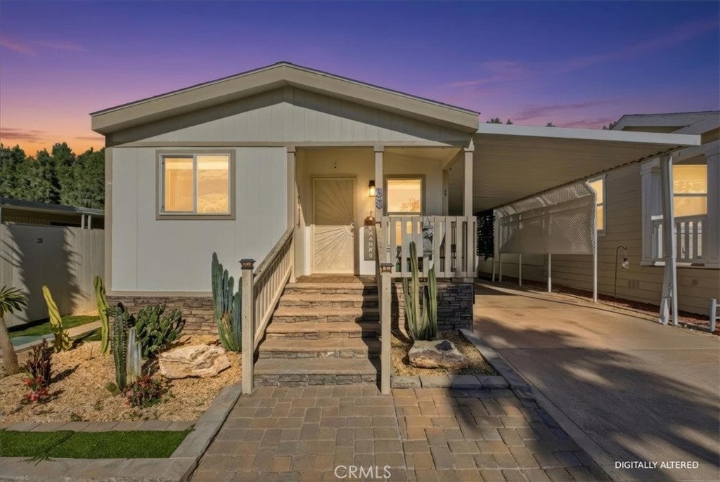 Welcome to this beautiful 3 bedroom, 2 bath manufactured home offering approximately 1,148 square feet of bright and functional living space, located in the desirable 55+ community of Corkhill Palms. The home features excellent curb appeal with a charming covered front porch, stone-accented steps, paver walkways, and low-maintenance desert landscaping. Inside, the open-concept layout connects the living room, dining area, and kitchen, creating a spacious and inviting setting for everyday living and entertaining. The living room offers vaulted ceilings, modern ceiling fans, and abundant natural light, while tile flooring flows throughout the main living areas for a clean, cohesive look. The dining area is highlighted by a contemporary chandelier and a striking stacked-stone accent wall that adds warmth and architectural character. The kitchen is well appointed with warm wood cabinetry, marble-look countertops, a large center island with seating, stainless steel appliances, open shelving, recessed lighting, and a window over the sink for natural light and outdoor views. The spacious primary bedroom features vaulted ceilings, ceiling fan, a walk-in closet, and dual windows, along with an en-suite bathroom offering a wood vanity with marble-look countertop and a step-in shower with glass enclosure. Two additional bedrooms provide flexibility for guests, office, or hobby space, and a dedicated indoor laundry room includes washer and dryer hookups with convenient exterior access. Outdoor living is enhanced by a long covered patio and carport area with string lighting and privacy screening, ideal for relaxing or entertaining, along with raised planter beds, Meyer lemon, navel orange, and Mexican lime trees, paver pathways, block wall fencing for added privacy, and a storage shed for extra utility. Community features include therapeutic natural mineral springs at the clubhouse, a putting green, and a billiard room. This move-in ready home offers a wonderful blend of comfort, style, and usable indoor and outdoor space.