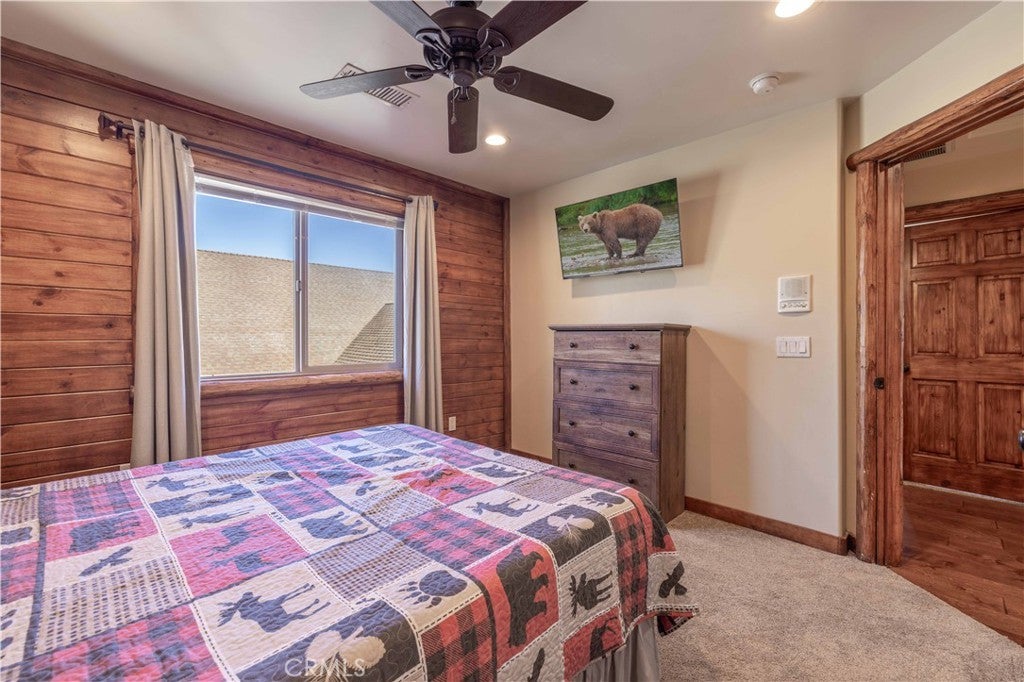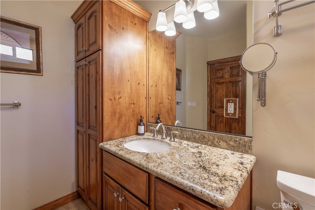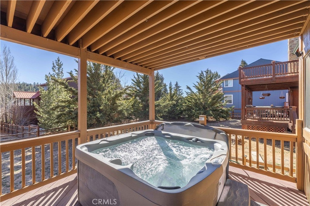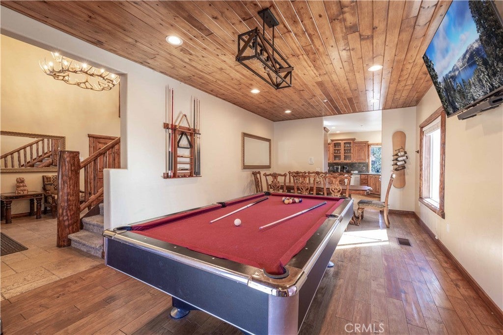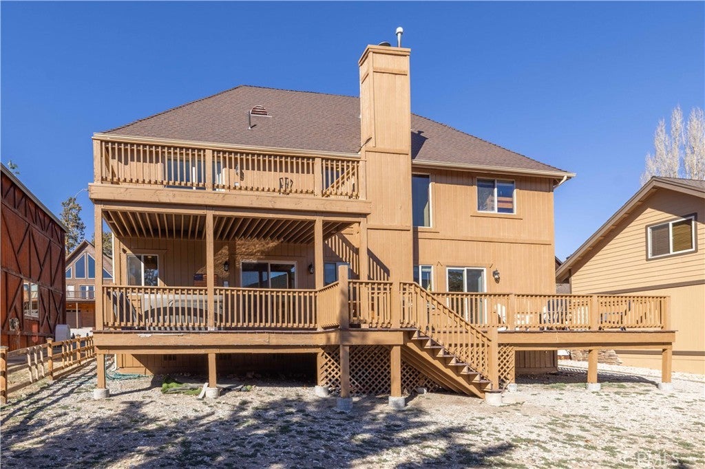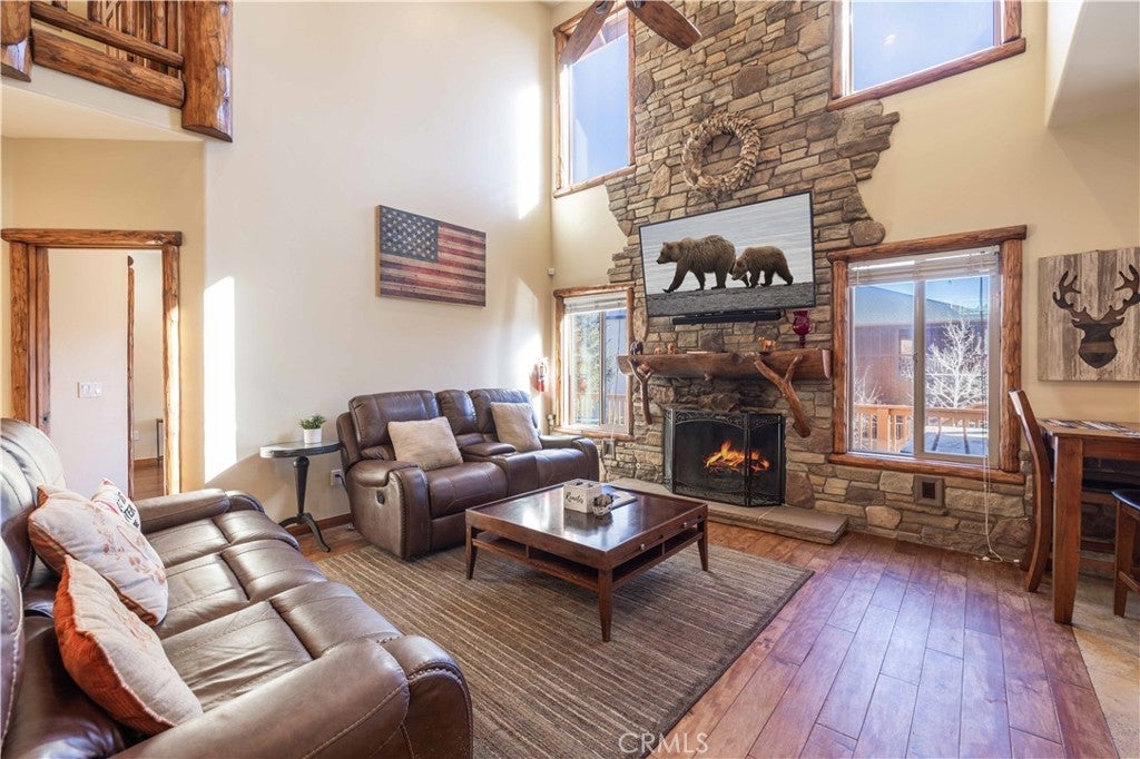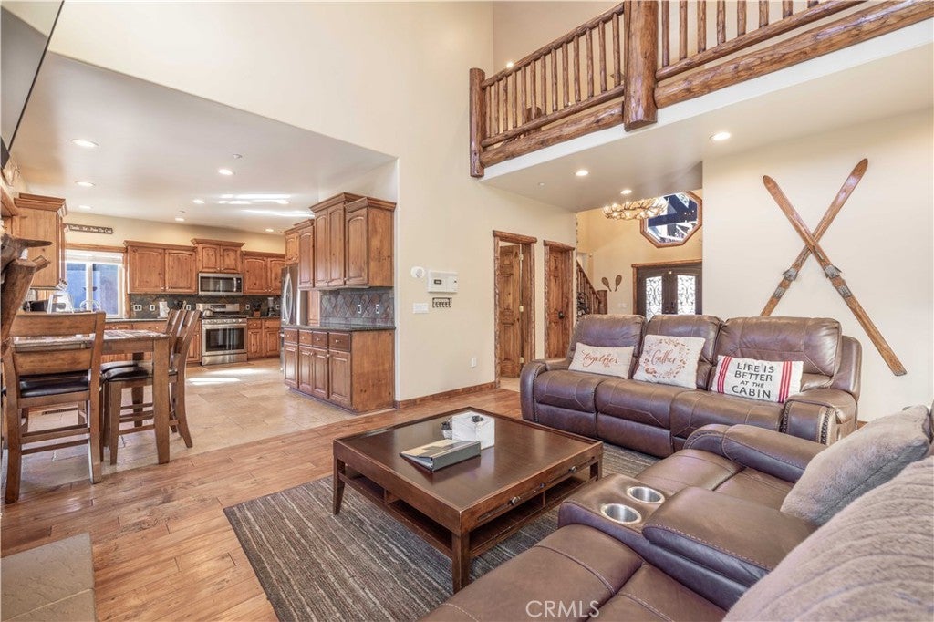Custom log-style mountain home on Bear Loop with sweeping views of Baker’s Pond, the ski slopes, and Sugarloaf Mountain. This 4-bedroom, 4-bath residence features two true primary suites—one on each level—ideal for hosting, multi-generational living, or STR flexibility. The lodge-inspired living room showcases vaulted ceilings, a dramatic two-story rock fireplace, and an open catwalk loft, all framed by oversized windows and rich log and stone accents that deliver a true mountain feel. The open kitchen offers custom cabinetry, expansive granite countertops, and newer stainless steel appliances, flowing seamlessly into a spacious game room and dining area. Upstairs, the primary suite includes a walk-in closet, private balcony, and a spa-style bath with travertine finishes and soaking tub. Every bedroom features its own accent wall, adding warmth and character throughout. Dual forced-air heating zones serve both upper and lower levels for year-round comfort. Multiple decks invite you outdoors to take in the views, unwind in the new spa, and enjoy mountain living at its best. Located in a neighborhood with underground utilities and pride of ownership throughout. Minutes to everywhere you'd want to be in Big Bear!