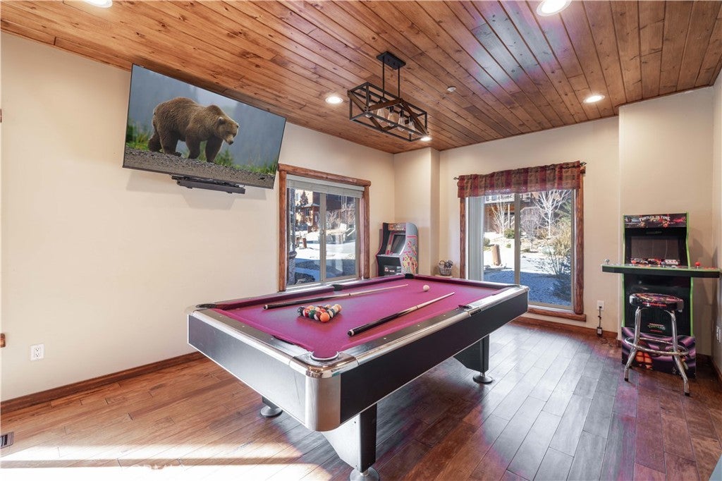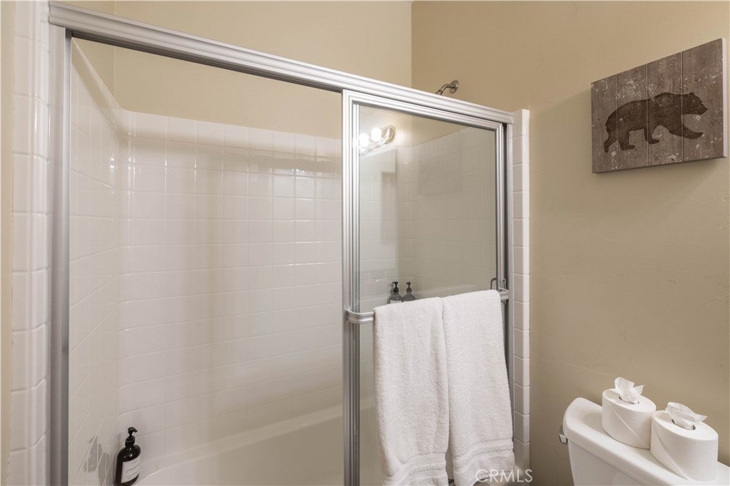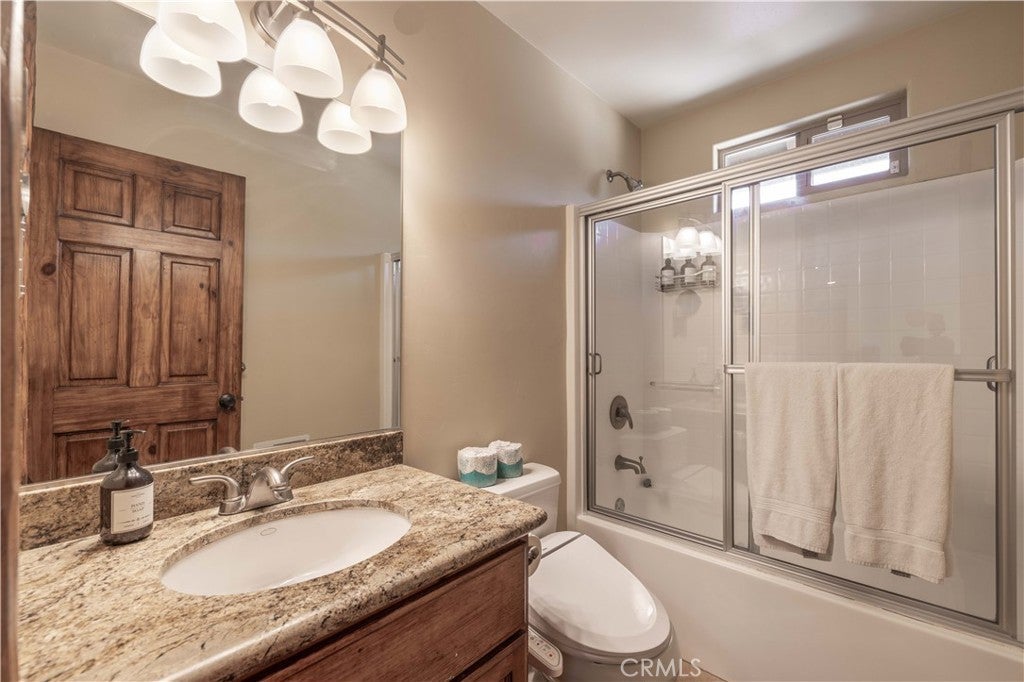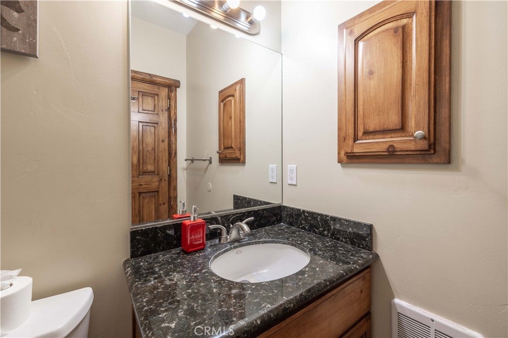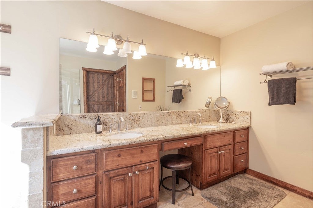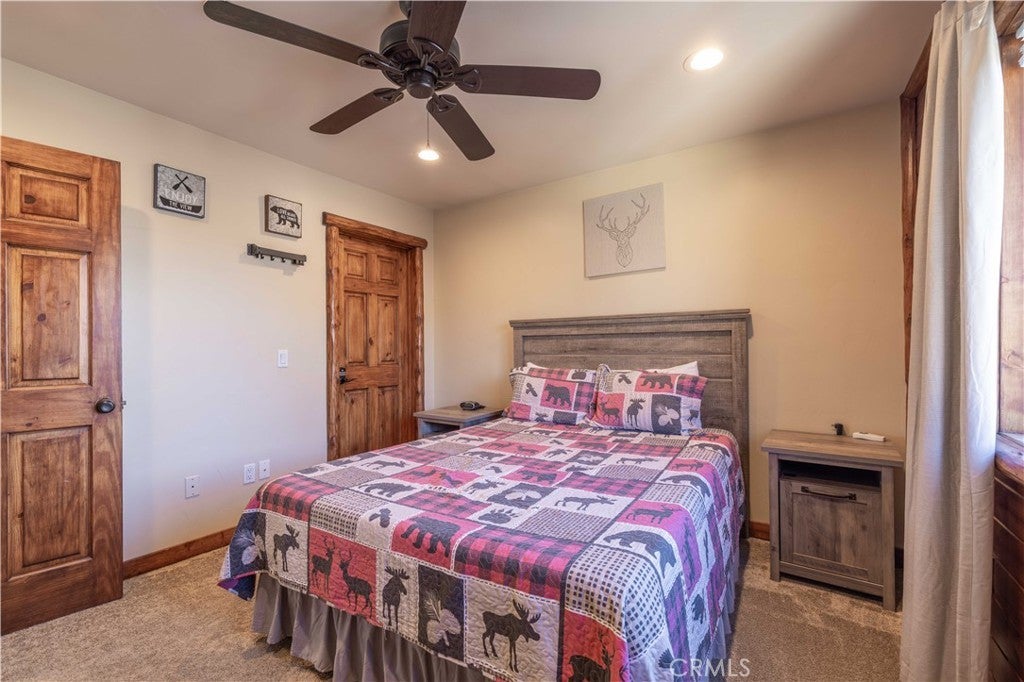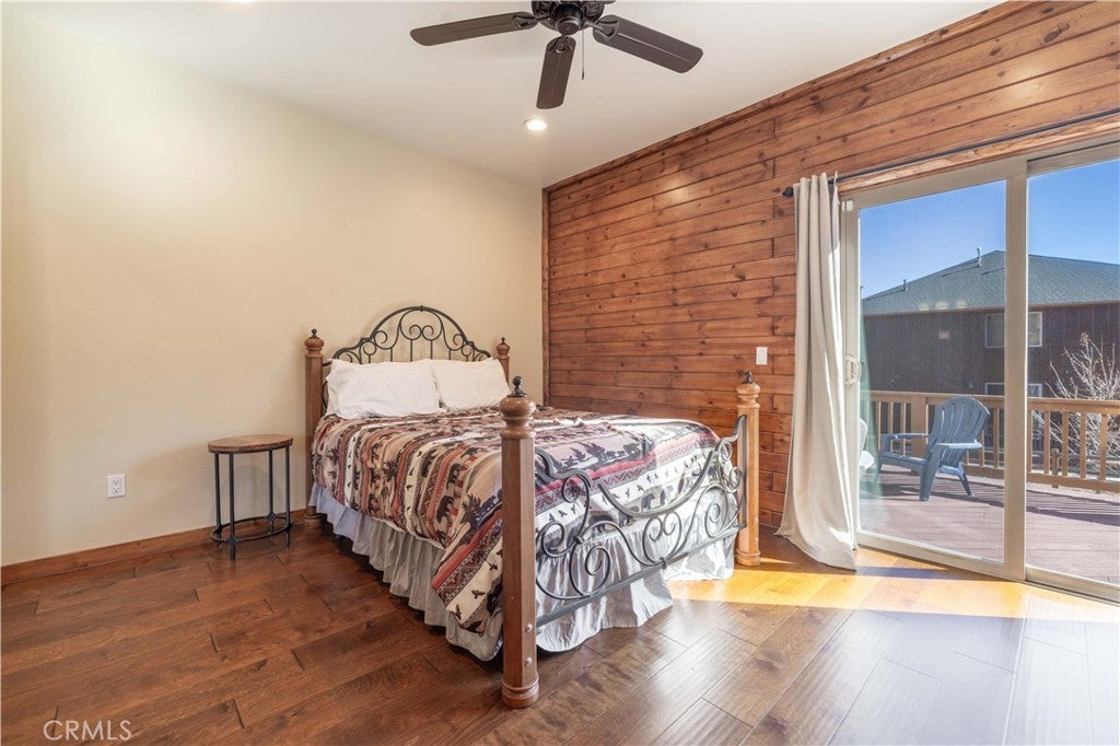 Custom log-style mountain home on Bear Loop with sweeping views of Baker’s Pond, the ski slopes, and Sugarloaf Mountain. This 4-bedroom, 4-bath residence features two true primary suites—one on each level—ideal for hosting, multi-generational living, or STR flexibility. The lodge-inspired living room showcases vaulted ceilings, a dramatic two-story rock fireplace, and an open catwalk loft, all framed by oversized windows and rich log and stone accents that deliver a true mountain feel. The open kitchen offers custom cabinetry, expansive granite countertops, and newer stainless steel appliances, flowing seamlessly into a spacious game room and dining area. Upstairs, the primary suite includes a walk-in closet, private balcony, and a spa-style bath with travertine finishes and soaking tub. Every bedroom features its own accent wall, adding warmth and character throughout. Dual forced-air heating zones serve both upper and lower levels for year-round comfort. Multiple decks invite you outdoors to take in the views, unwind in the new spa, and enjoy mountain living at its best. Located in a neighborhood with underground utilities and pride of ownership throughout. Minutes to everywhere you'd want to be in Big Bear!