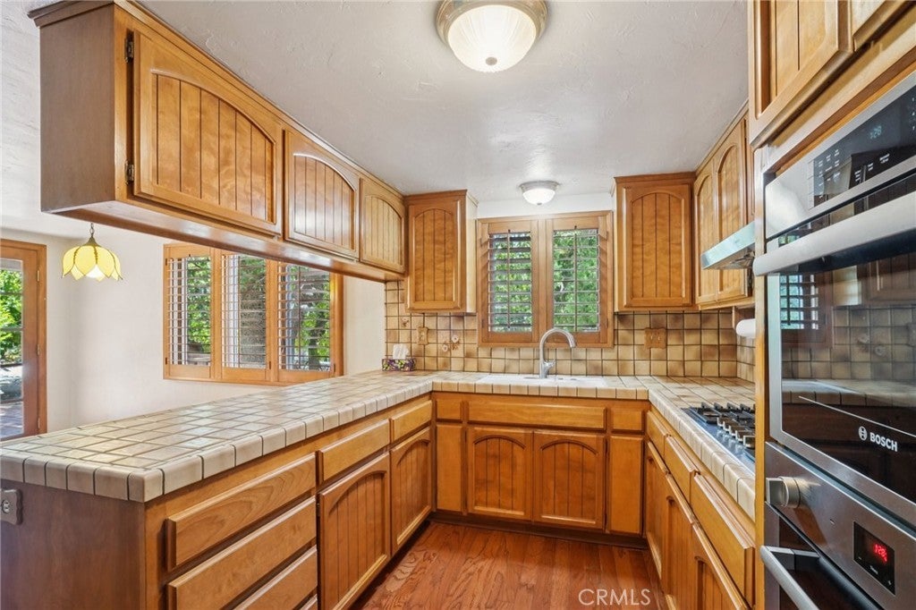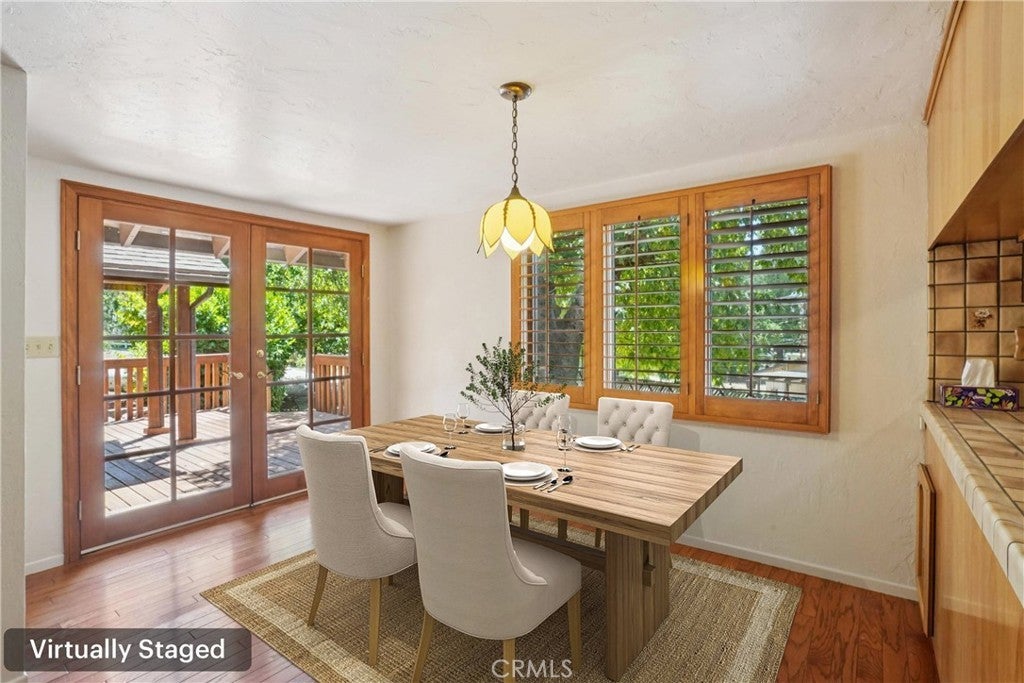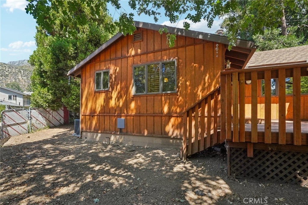 Absolutely charming Oak Glen cabin near iconic apple orchards, boutique shops, and quaint restaurants. This well-maintained property features 1 bedroom and 1.75 bathrooms in 1,052 sq. ft. of living space, all situated on a private 15,300 sq. ft. lot with plenty of space for home expansion if desired. Also offering a detached 2-car garage, a 1-car carport, and driveway parking for 4 additional cars - great for guests! A lovely brick walkway with planters adorns the front, leading to the front deck which wraps around the home to the back. Inside, you will find beautiful vaulted wood-beamed ceilings, wooden plantation shutters, central A/C & heating, and newly installed aluminum flex ducting (rodent resistant) under the home! The home boasts a spacious living room complete with wood-burning stove. The living room flows into the kitchen with wood cabinetry, tile counters, and high-end Bosch Stainless Steel appliances including the cooktop with vent, a built-in oven, and microwave. The Samsung refrigerator is also included with the sale of the home! The kitchen opens to the light and bright dining room with double French-doors that opens to the front deck, and there is a convenient laundry closet in the kitchen with included washer and dryer. This home has a large bedroom with glass slider to the back deck, a large private ensuite with vanity space, a walk-in shower, and the ideal cedar-lined walk-in closet with built in storage. A full-size bathroom completes the interior floor plan. Relax and entertain on the back deck with stunning mountain and forest views, and there is also a shed for extra storage! This home is truly a gem! Bask in the best of mountain living while still being close to shopping and services, also the US Forestry Service Station is located next door! Do not miss this one!