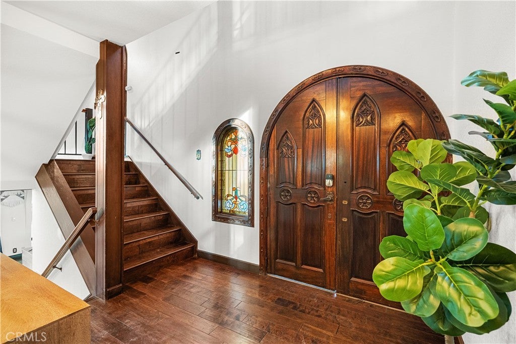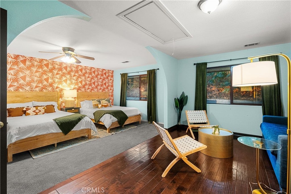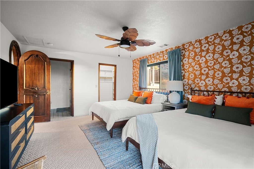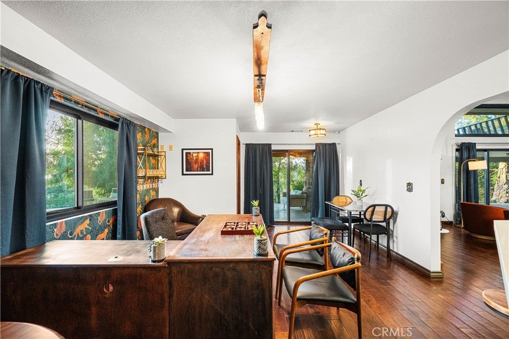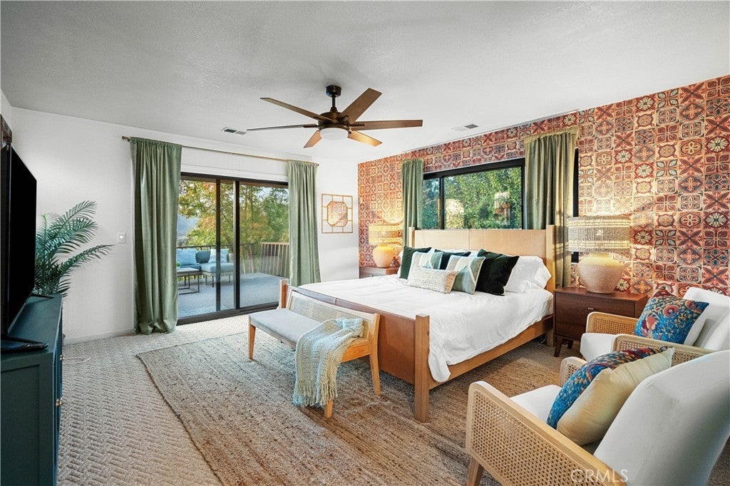 Welcome to an extraordinary hilltop Spanish-Mediterranean retreat with breathtaking mountain and city-light views. Privately positioned on 1.32 acres at the end of a quiet road shared by only four homes, this tri-level estate offers rare seclusion, panoramic scenery, and a lifestyle that feels like a permanent getaway. Spanning 4,371 square feet, the home features 5 bedrooms, 4.5 bathrooms, and a 4-car drive-through garage, thoughtfully designed for multi-generational living and memorable entertaining. From the moment you enter, soaring ceilings, floor-to-ceiling windows, imported wood accents, custom doors, and rich hardwood floors create warmth and timeless character. The dramatic living room showcases 20-foot ceilings, exposed wood beams, a striking stone fireplace, and an architectural catwalk that connects the living spaces while framing the incredible views. The main level also includes a den with built-in bar, formal dining room, spacious kitchen with island, guest bath, and mudroom/storage area—ideal for hosting with ease. This home offers two private primary suites, each with en-suite bathrooms and private balconies. One suite features a spa-inspired jetted tub perfectly positioned to soak in the scenery. The upper level includes a cozy lounge landing, two additional bedrooms, a full bathroom, a large laundry room, and an oversized bonus room currently used as a bedroom and game room. Newer windows and sliding doors open to multiple decks and patios, seamlessly blending indoor and outdoor living. Outside, enjoy a long private driveway, RV and boat parking, additional parking areas, solar power, a sand volleyball court, fruit trees including walnut, and a jacuzzi overlooking the hills—perfect for stargazing and unwinding at sunset. Conveniently located just minutes from Oak Glen’s apple orchards, vineyards, regional parks, and the shops and dining of uptown Yucaipa, yet feeling worlds away. No HOA. Offered fully furnished and ideal as a primary residence, second home, or potential vacation rental. Just 74 miles to Los Angeles and 41 miles to Palm Springs. A rare hilltop sanctuary—schedule your private showing today.