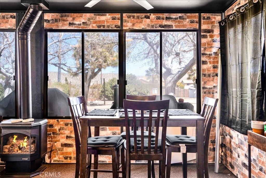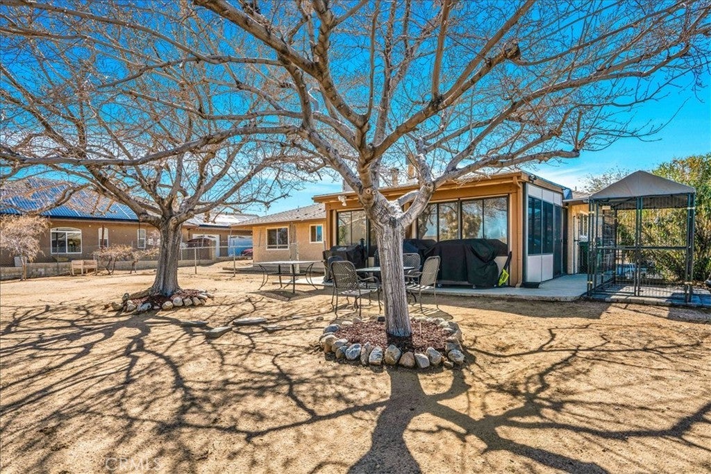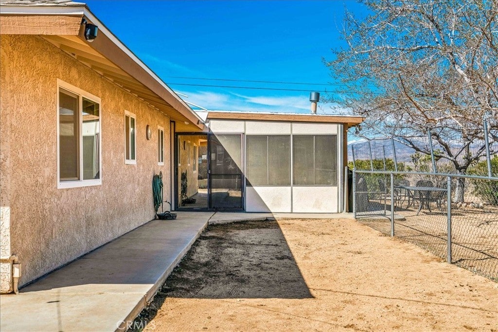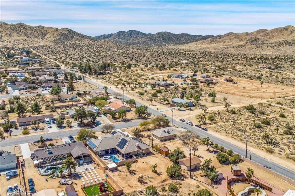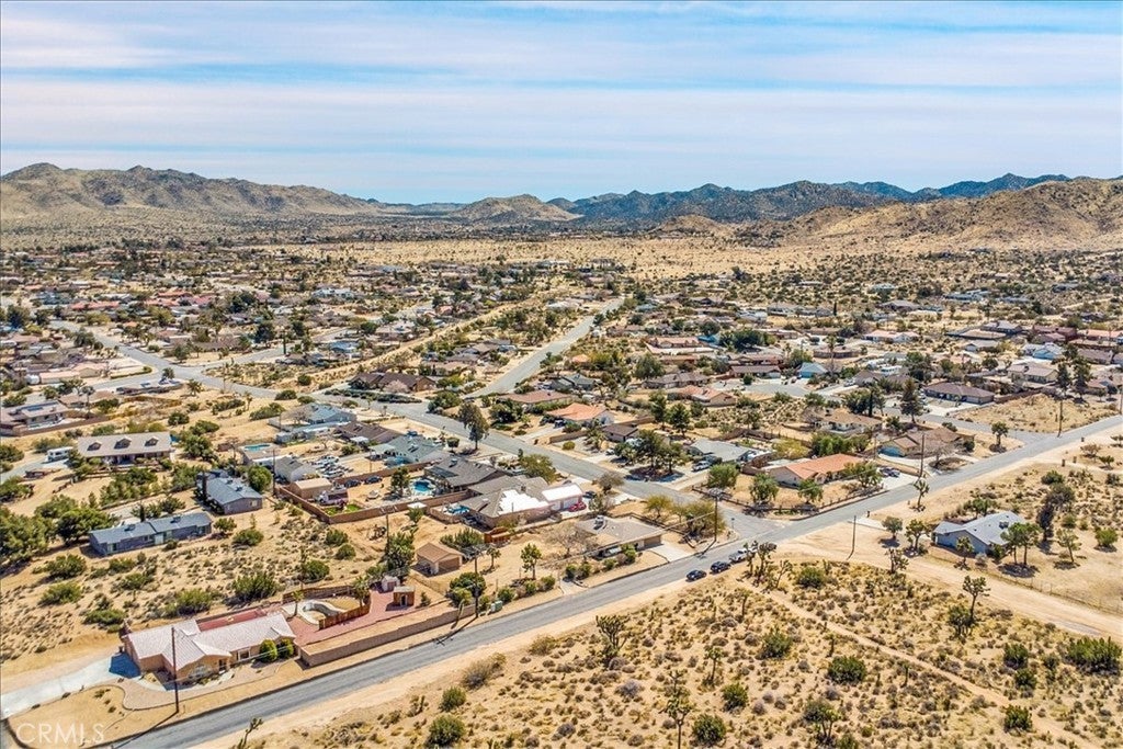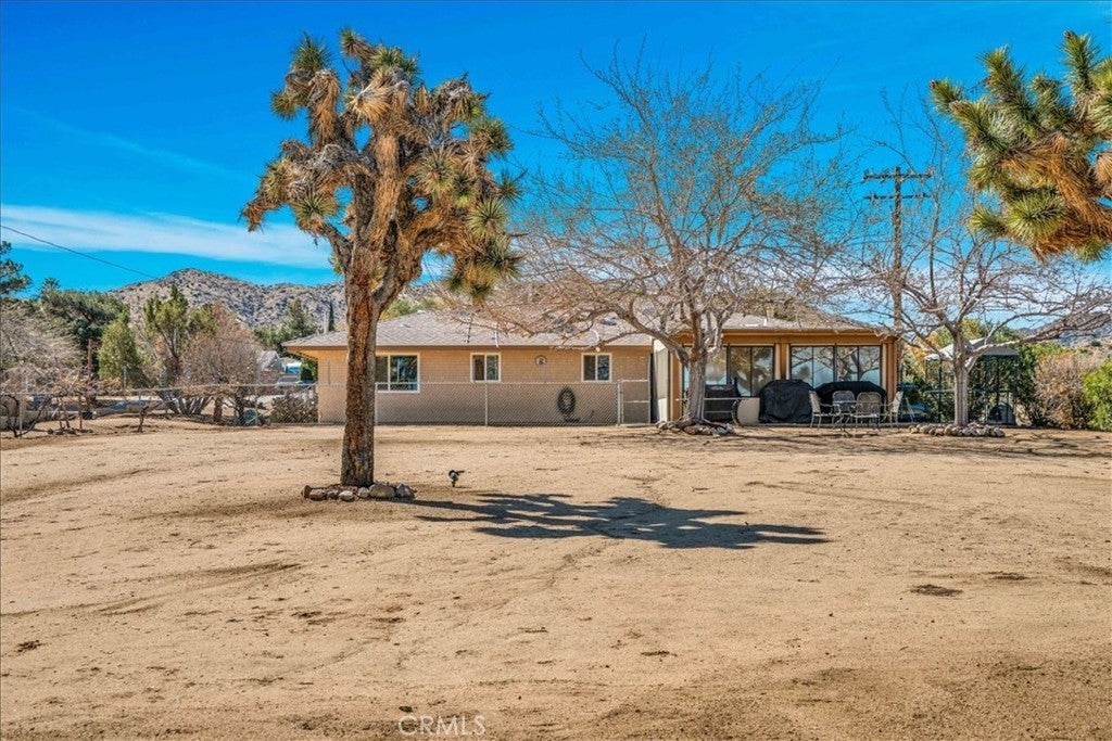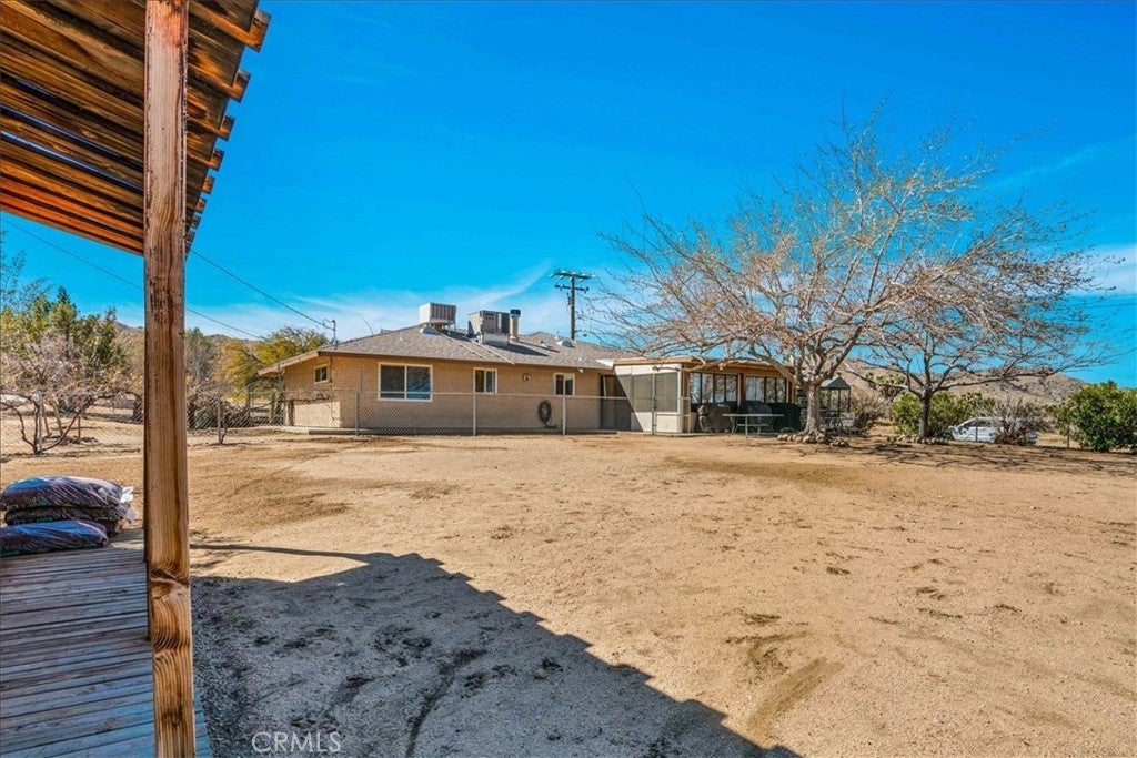 This well maintained 2-bedroom, 2-bathroom ~Potential for a 3rd Bedroom~ home is situated on a desirable corner lot in the sought-after Sky Harbor neighborhood, it spans approximately half an acre and is surrounded by mature trees and a beautiful desert landscape with scenic views. BRAND NEW heating and A/C units! The living room has built-in shelving and a cozy natural gas fireplace. The kitchen is equipped with stainless steel appliances, including a gas stove and built-in microwave, and the dining area is conveniently located off the kitchen. A separate office space with built-in cabinets offers direct access to the enclosed patio and garage. The spacious primary bedroom comes with an en-suite bathroom, while the large secondary bedroom is adjacent to a hall bathroom. As an added bonus there is an enclosed patio that adds an additional 280sq ft of living space and features a natural gas heater, carpet flooring, and lovely views of the yard. The attached 2-car garage includes evaporative heating and cooling, laundry area with a sink, built-in cabinets, a newer water heater, and carpeting. This space can be used as a traditional garage or additional space for an in-home gym, possible 3rd bedroom option or extra storage, providing versatility. The backyard, which has gated access from Warren Vista, features a separate 2-car garage, fire pit area, cowboy shed, garden areas, and ample space for RV or boat storage. Fully fenced for privacy, this home also boasts a newer roof, making it a fantastic opportunity for any buyer. Close Proximity to Joshua Tree National Park, Pioneer Town and Palm Springs.