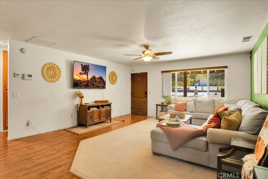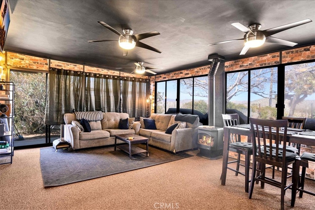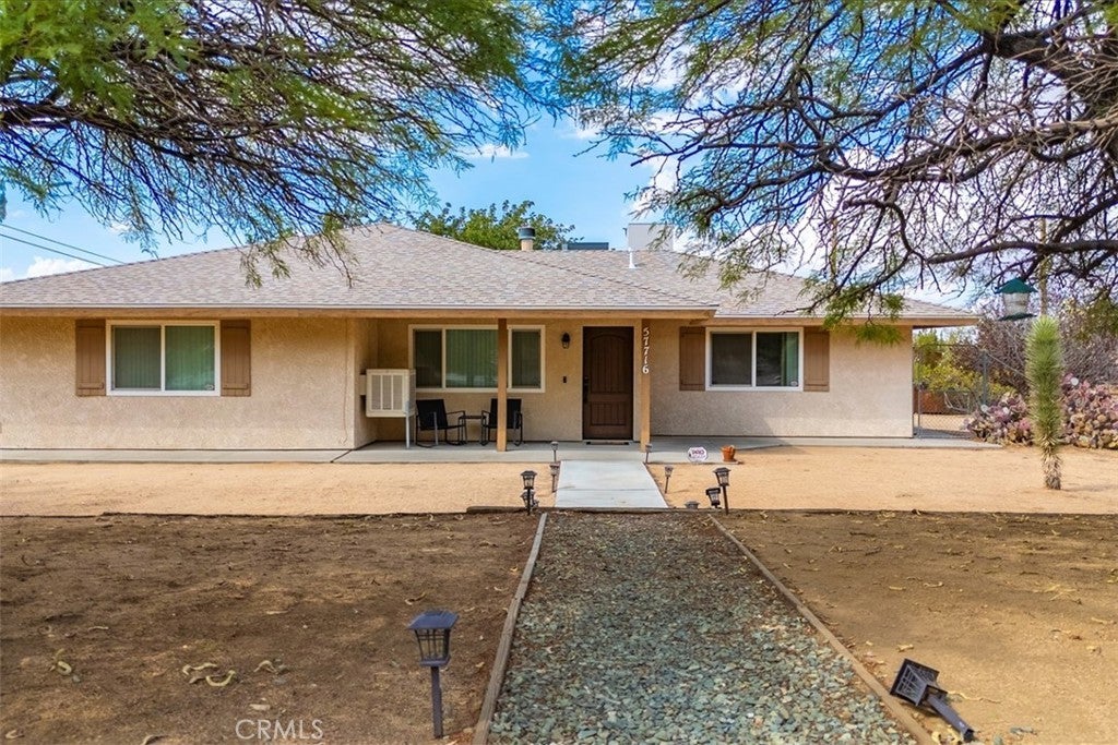This well maintained 2-bedroom, 2-bathroom home is situated on a desirable corner lot in the sought-after Sky Harbor neighborhood, it spans approximately half an acre and is surrounded by mature trees and a beautiful desert landscape with scenic views. BRAND NEW heating and A/C units! The living room has built-in shelving and a cozy natural gas fireplace. The kitchen is equipped with stainless steel appliances, including a gas stove and built-in microwave, and the dining area is conveniently located off the kitchen. A separate office space with built-in cabinets offers direct access to the enclosed patio and garage. The spacious primary bedroom comes with an en-suite bathroom, while the large secondary bedroom is adjacent to a hall bathroom. As an added bonus there is an enclosed patio that adds an additional 280sq ft of living space and features a natural gas heater, carpet flooring, and lovely views of the yard. The attached 2-car garage includes evaporative heating and cooling, laundry area with a sink, built-in cabinets, a newer water heater, and carpeting. This space can be used as a traditional garage or additional space for an in-home gym, possible 3rd bedroom option or extra storage, providing versatility. The backyard, which has gated access from Warren Vista, features a separate 2-car garage, fire pit area, cowboy shed, garden areas, and ample space for RV or boat storage. Fully fenced for privacy, this home also boasts a newer roof, making it a fantastic opportunity for any buyer. Close Proximity to Joshua Tree National Park, Pioneer Town and Palm Springs.