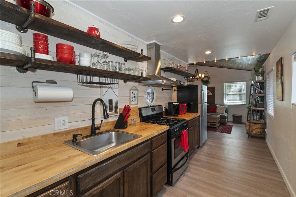 Welcome to the Sugar Shack ~ Beautiful Single-Level Home ~ A True Entertainers Dream ~ This turn-key residence is perfectly designed for comfort, entertainment, and easy living ~ From the moment you arrive, you’ll appreciate the thoughtful design, premium finishes, and exceptional indoor-outdoor flow ~ Inside, the home welcomes you with tasteful design, and a bright, open floor plan accented by luxury vinyl flooring throughout ~ The dining area flows effortlessly into the living space, complete with a cozy, crackling, wood stove insert for maximum efficiency ~ The kitchen and laundry area (with stackable washer/dryer) are both functional, and well-appointed ~ The layout offers excellent separation of space, including a full bathroom with tub, a versatile den currently used as a workspace, and a spacious primary bedroom with ensuite bathroom and shower ~ To call this home charming is truly an understatement ~ It’s a rare blend of style, comfort, and functionality, complete with tankless water heater, and forced air heating ~ The custom game/entertainment room, which could be used as a 3rd bedroom, is a showstopper, featuring mounted heaters, a quartz bar setup, epoxy coated flooring, and ample space to host any game day or gathering, in style ~ Double doors open seamlessly to the backyard, creating the perfect entertaining experience, with views of the beautifully landscaped outdoor space ~ Step outside to your bubbling jacuzzi, fire pit, BBQ area, and a spacious yard finished with turf ~ All fully fenced in low-maintenance vinyl material for convenience ~ A side gate provides RV or boat parking with easy access from the flat driveway ~ Neighboring oak trees shade the backyard in summer, and create a stunning seasonal display in the fall. Offering exceptional flexibility for full-time living, second-home use, and/or income potential. Come see The Sugar Shack today!