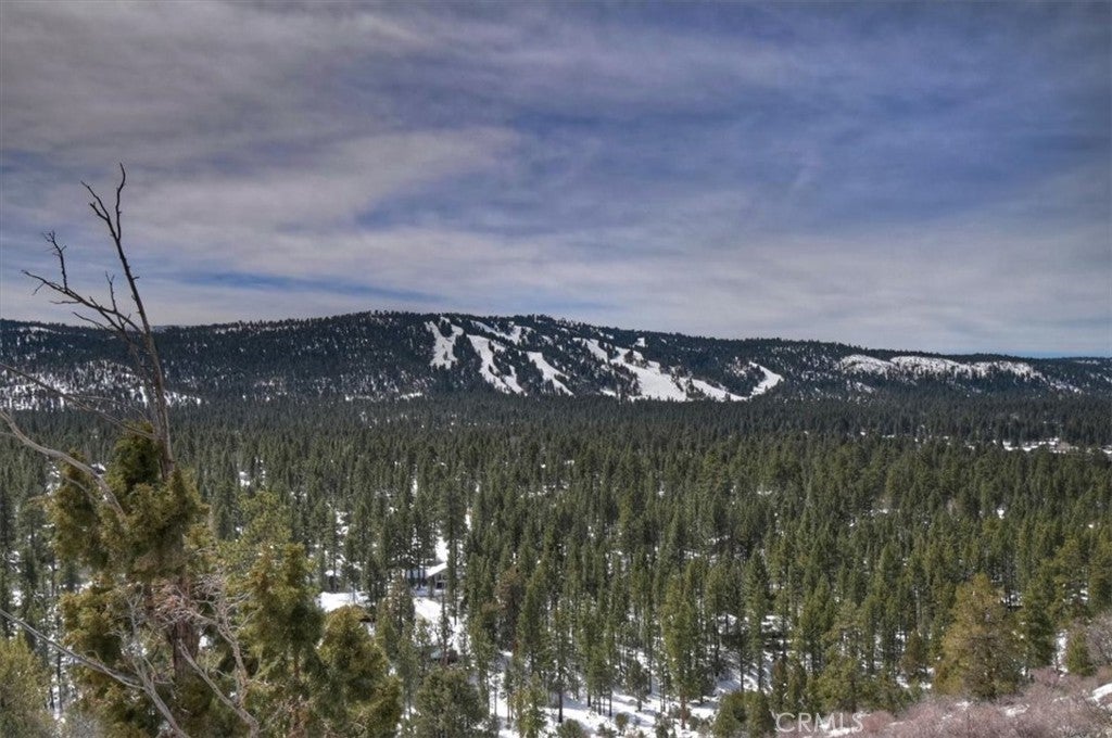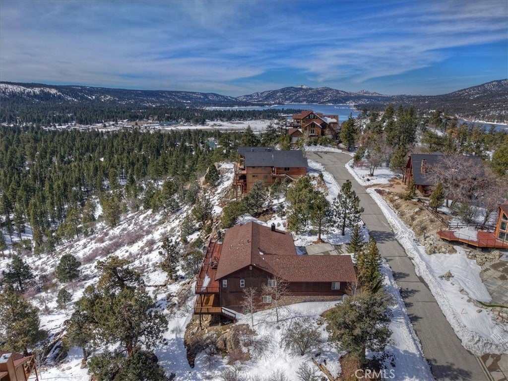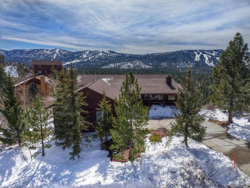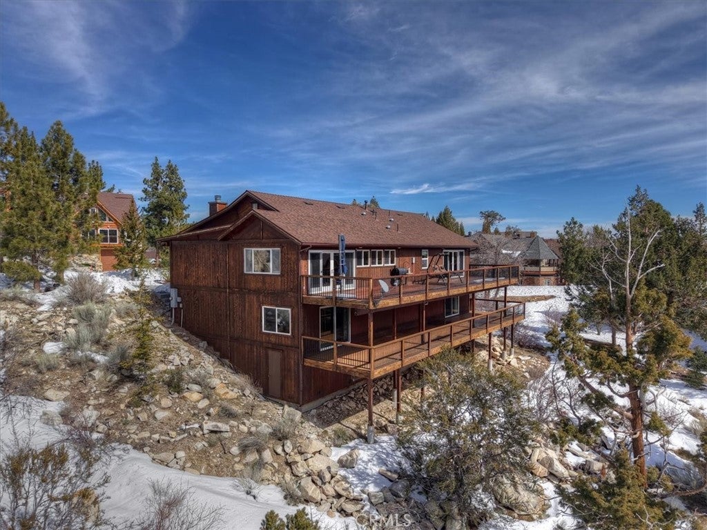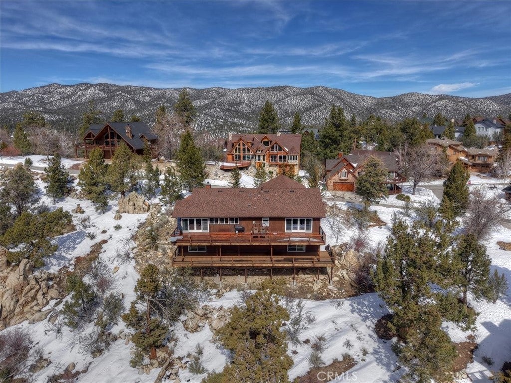 Perched at the top of prestigious Castle Glen on Pegasus Way, this luxury retreat captures breathtaking ski slope views of both Bear Mountain and Snow Summit. Designed with a reverse floor plan to maximize the scenery, the home features vaulted tongue-and-groove ceilings and expansive upper and lower decks overlooking unbuildable forest with a peek of the lake. Offering 5 bedrooms plus an additional office and 4 full bathrooms, the layout is ideal for hosting and privacy alike. The main level includes 3 bedrooms and 2 baths, while the lower level offers 2 bedrooms, an office, and 2 baths. Two spacious primary suites feature walk-in closets and direct deck access. Each level is complete with its own living room, fireplace, and laundry room. Dual forced-air heaters and dual water heaters provide comfort and efficiency year-round. The kitchen is appointed with granite countertops and stainless-steel appliances. Turn-key and thoughtfully designed, this mountain estate also includes a way oversized two-car garage—perfect for vehicles, toys, and gear.