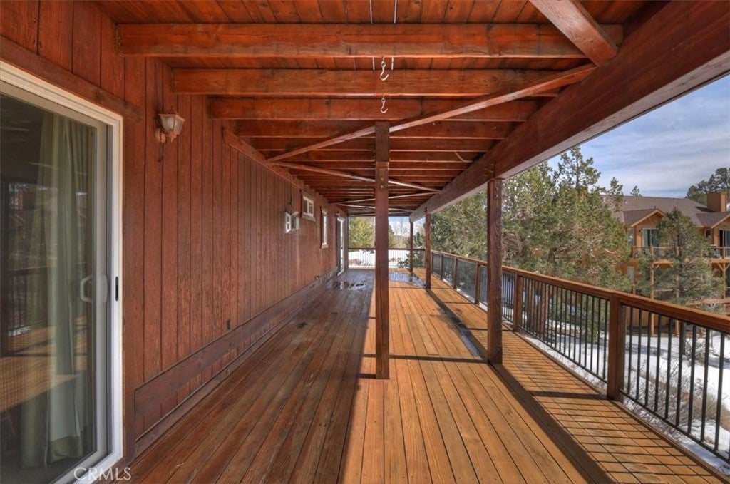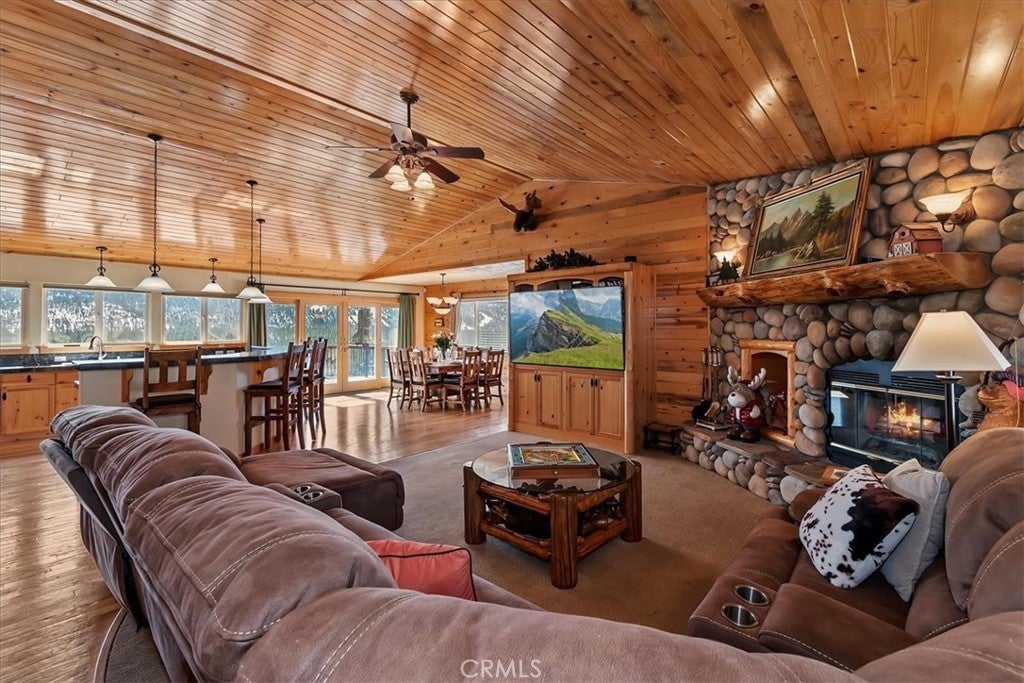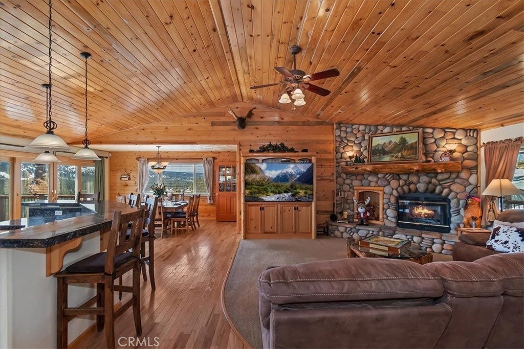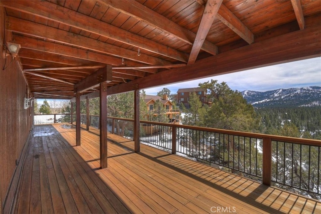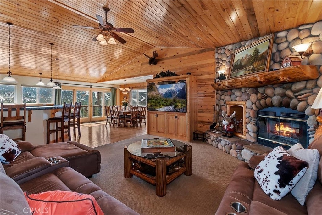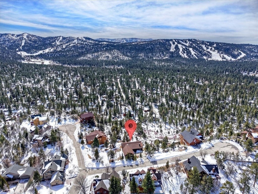 Perched at the top of prestigious Castle Glen on Pegasus Way, this luxury retreat captures breathtaking ski slope views of both Bear Mountain and Snow Summit. Designed with a reverse floor plan to maximize the scenery, the home features vaulted tongue-and-groove ceilings and expansive upper and lower decks overlooking unbuildable forest with a peek of the lake. Offering 5 bedrooms plus an additional office and 4 full bathrooms, the layout is ideal for hosting and privacy alike. The main level includes 3 bedrooms and 2 baths, while the lower level offers 2 bedrooms, an office, and 2 baths. Two spacious primary suites feature walk-in closets and direct deck access. Each level is complete with its own living room, fireplace, and laundry room. Dual forced-air heaters and dual water heaters provide comfort and efficiency year-round. The kitchen is appointed with granite countertops and stainless-steel appliances. Turn-key and thoughtfully designed, this mountain estate also includes a way oversized two-car garage—perfect for vehicles, toys, and gear.