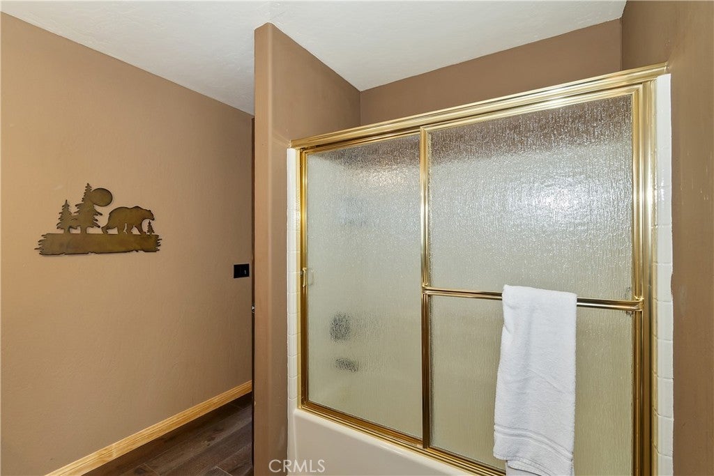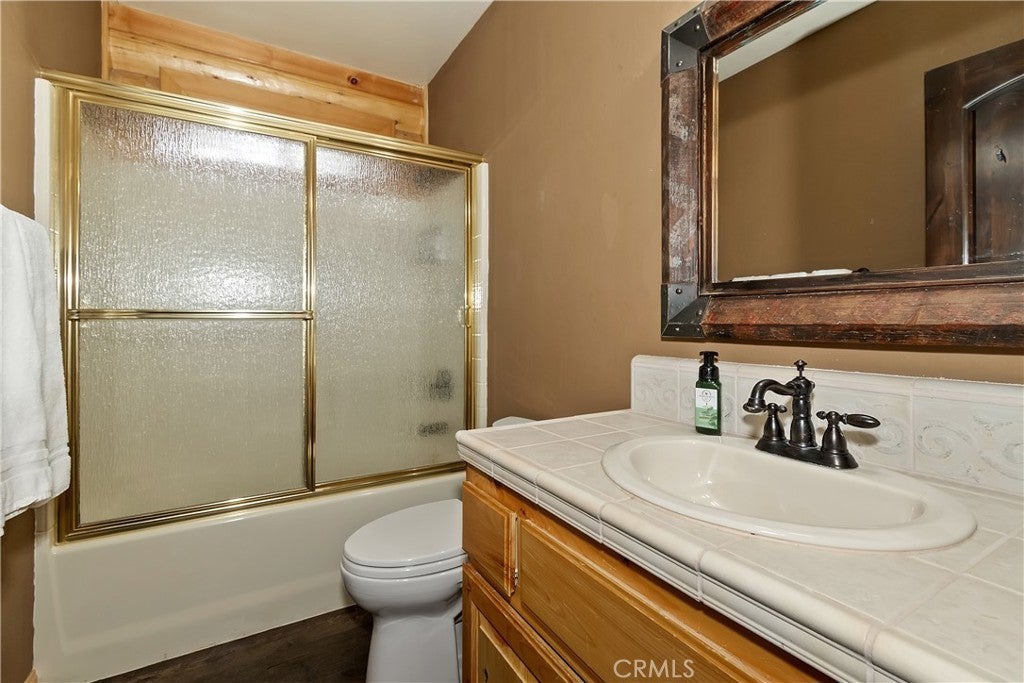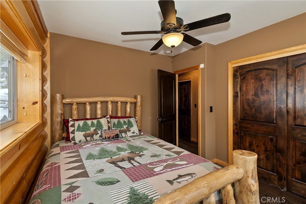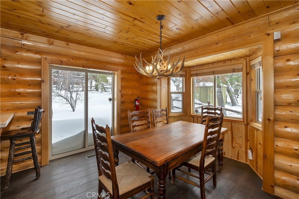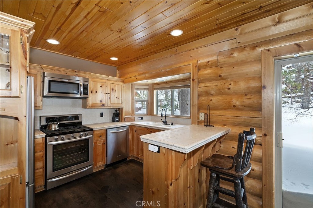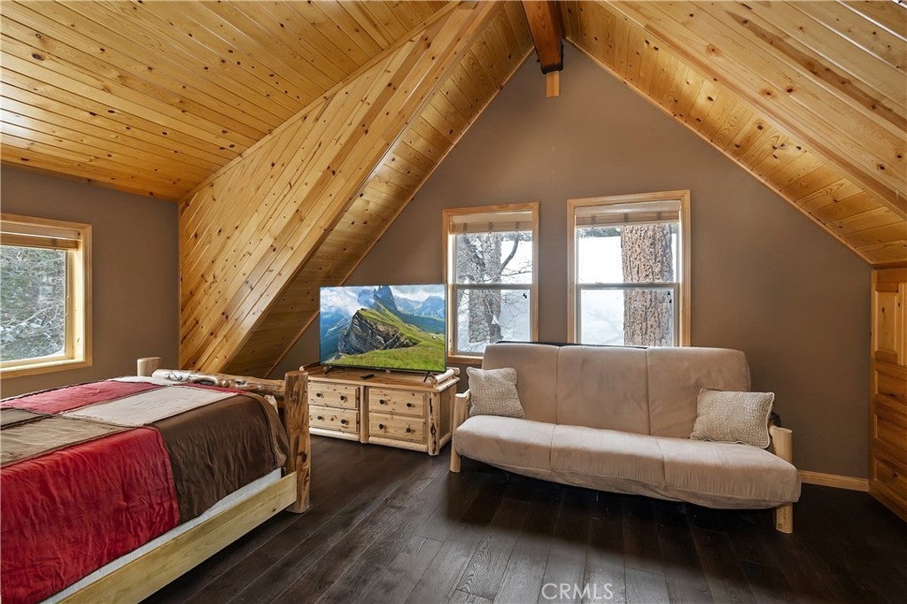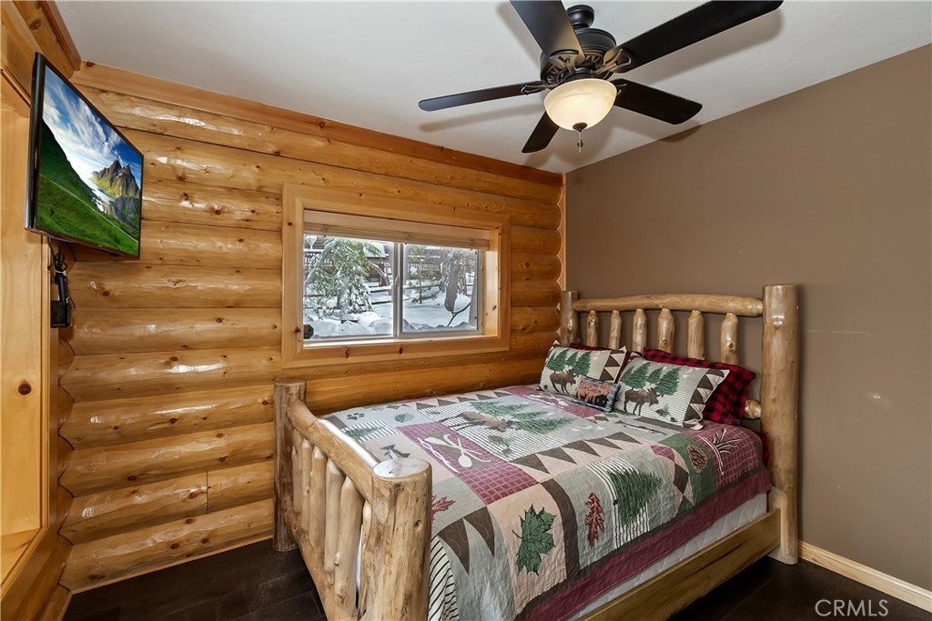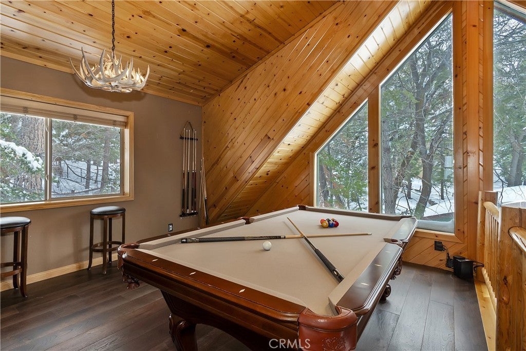 This is the true log cabin in the mountains you have been waiting for ~ Located in Moonridge and just a few minute drive to Bear Mountain ski slopes ~ Imagine yourself relaxing on your front deck taking in the sounds of nature and your peek-a-boo views of the ski slopes ~ As you enter you will fall in love with the soaring tongue and ceilings and the floor to ceiling river rock wood burning fireplace ~ Hardwood floors flow throughout the cabin ~ The main level gives you the open kitchen, dining area, living room, 2 bedrooms and a full bathroom ~ Upstairs is your large loft with pool table and the master bedroom with its own en suite bathroom and vaulted ceiling ~ The backyard is where the magic happens ~ You have your own private hot tub sunken in the deck, a paver walkway to a bridge taking you over the built in waterfall to a sitting area ~ Your own private park for relaxing and letting the stressors of everyday life just melt off your shoulders ~ This is your opportunity to finally have the quintessential cabin in the woods you have always dreamed of!