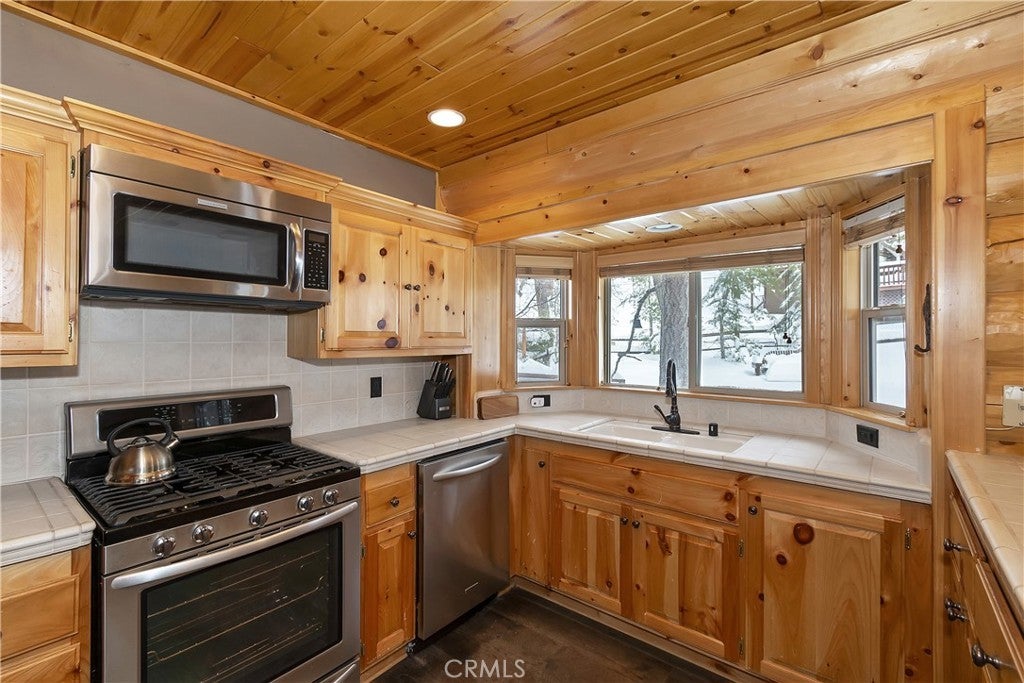 Breakfast Bar, Open Floorplan, Bedroom on Main Level, Primary Suite, Cathedral Ceiling(s), Living Room Deck Attached, Loft, Tile Counters, Wood Product Walls