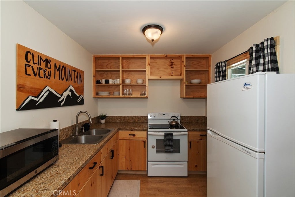 Surrounded by soaring pines and set on a 5,000 square-foot fully fenced lot, this turnkey mountain retreat blends rustic charm with thoughtful modern upgrades ~ From the moment you arrive, the freshly painted exterior and inviting front porch set the tone for a home designed to embrace the beauty of mountain living ~ Inside, you’ll find two cozy living spaces, offering flexibility for gathering and relaxation ~ One features a classic brick wood burning fireplace ~ The perfect place to curl up and watch the snowfall drift through the trees on crisp winter evenings ~ New flooring flows throughout, complemented by fresh light fixtures that add warmth and elegance to every room ~ The remodeled kitchen shines with contemporary finishes and functionality, while the beautifully updated bathrooms provide a spa-like feel ~ Dual-pane windows enhance comfort and efficiency, and a new water heater and upgraded copper plumbing offer peace of mind for years to come ~ A washer and dryer are also included for added convenience ~ Step outside to enjoy both a front and back porch ideal for morning coffee, evening sunsets, or simply breathing in the fresh mountain air ~ new asphalt driveway, room for the family with off street parking ~ Two spacious storage sheds in the backyard provide ample room for all your mountain toys and gear ~ Rain gutters have been installed to protect the foundation and ensure proper drainage year-round ~ Located in a quiet, sought-after neighborhood just minutes from scenic hiking trails, local grocery stores, and premier ski resorts ~ This home offers the perfect balance of tranquility and accessibility ~ Don’t miss your opportunity to own this beautifully upgraded, move-in-ready mountain escape ~ where comfort, charm, and adventure meet.