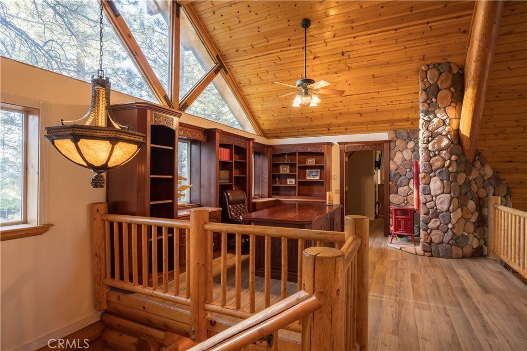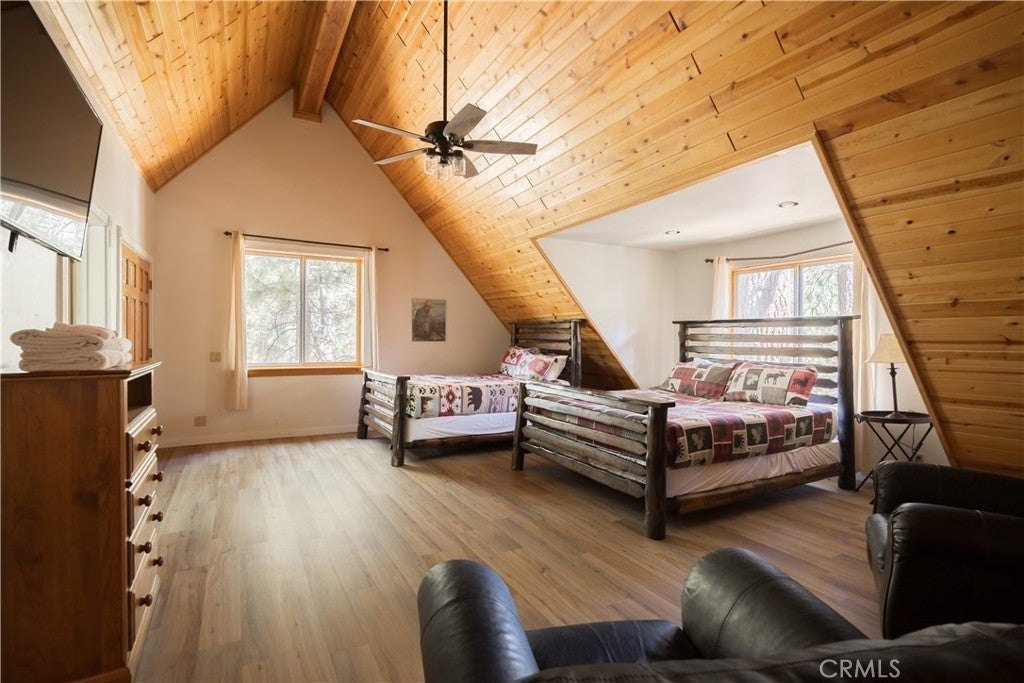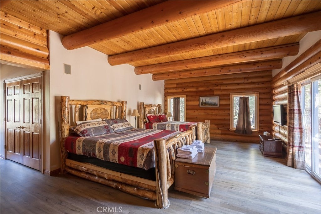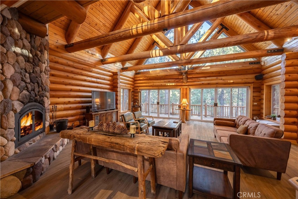 Absolutely amazing log home on a rare level acre + lot in the heart of Big Bear! Ideally positioned on the property to take in the forest setting from the back deck. Amazing interior offers soaring beamed ceilings with 2 story river rock fireplace, 3 huge bedrooms with a bonus 4th bedroom, game room with bar, large master bath for just a few of the highlights. New flooring and recently updated kitchen. Spacious outdoor decking w/ Spa that overlooks the forest to take in the setting & ideal for stargazing. This home is perfect for large gatherings or corporate retreats. 1000 sf 3 car garage with bedroom, in-ground well, metal roofing with new solar system and great income figures. Plenty of room on the property for endless possibilities tennis, pickle-ball court, RV garage or just keep it the way it is for your mountain oasis
