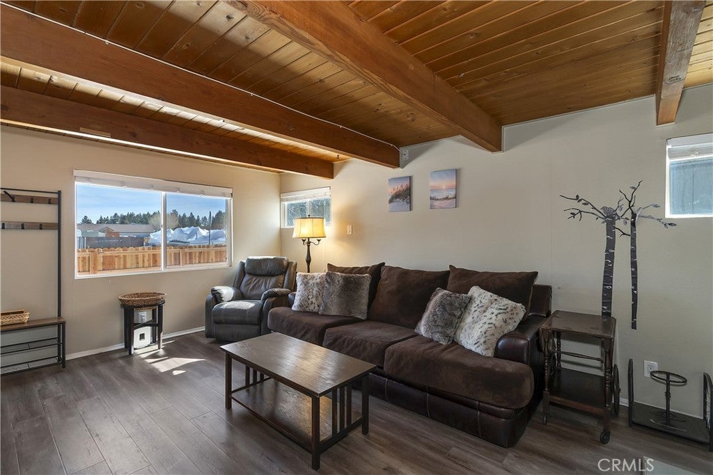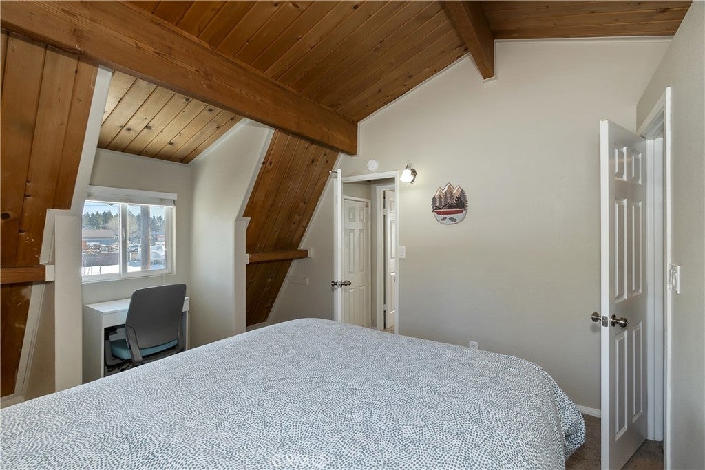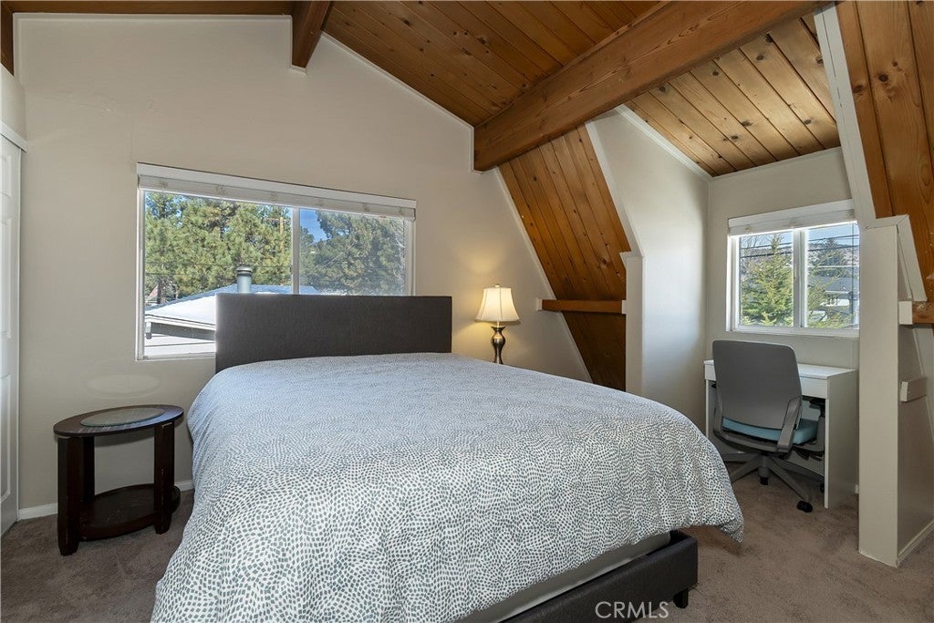 This charming Dutch Gambrel-style mountain home offers the perfect blend of character, comfort, and location ~ Ideally situated in the heart of Big Bear City, it’s conveniently close to ski slopes, shopping, dining, and local entertainment ~ An ideal opportunity for full-time living, a weekend getaway, or an investment property ~ Thoughtfully upgraded and beautifully maintained, the home features a functional layout filled with warmth and natural charm ~ Enjoy crisp mountain air and star-filled nights from the expansive wraparound concrete porch that extends to the back of the home ~ Perfect for BBQs, relaxing, and entertaining ~ Inside, you’ll find two spacious bedrooms, both with views of Gold Mountain in the distance ~ Two updated bathrooms, one upstairs, and one down ~ Master bathroom has a large, tiled shower with two showerheads ~ Laundry hookups, newer laminate-style flooring, dual pane windows, and a wood-burning stove complete with tile hearth ~ Beautifully appointed kitchen, with stainless steel appliances ~ Fully fenced yard ~ This inviting mountain retreat is truly a special find.
