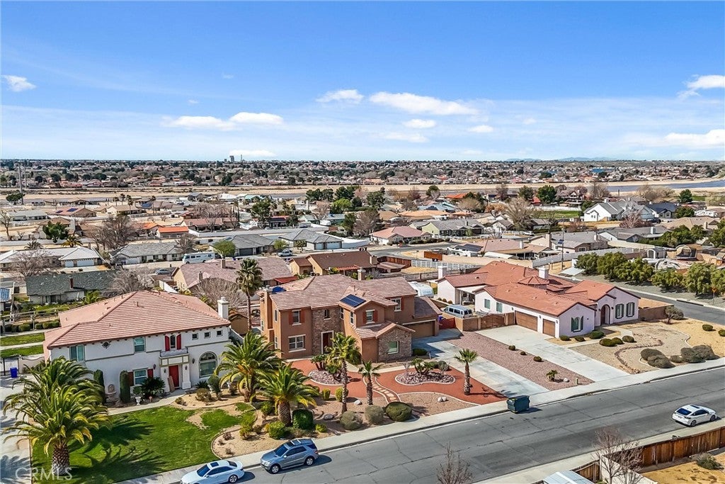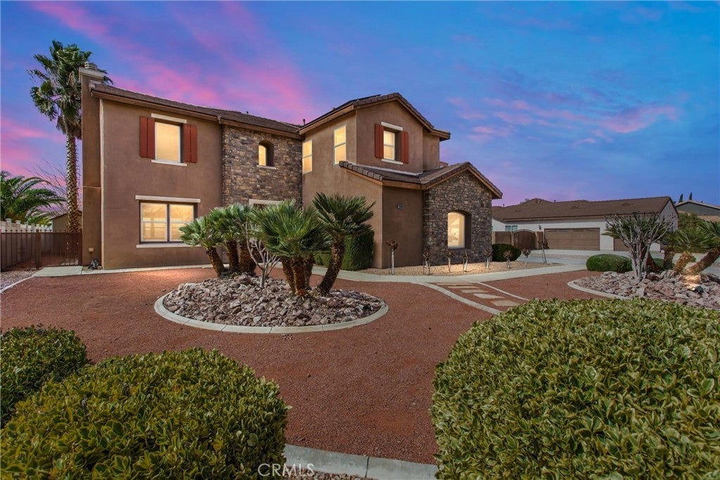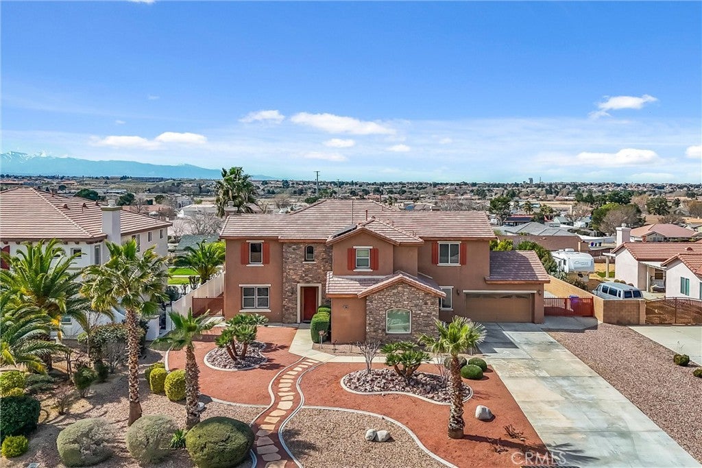 Experience the ultimate in high-desert luxury with this stunning 5-bedroom, 4-bathroom estate, where panoramic views meet unparalleled craftsmanship. This Apple Valley gem welcomes you with rich hardwood flooring and elegant granite countertops throughout. The expansive floor plan is designed for modern living, featuring a convenient main-floor bedroom and an upstairs layout that is nothing short of spectacular. The primary master suite is a true sanctuary, spanning the entire length of the home with his-and-her walk-in closets, while a newly added second mini-master upstairs ensures comfort and privacy for guests or family. Every additional bedroom on the second level also features its own walk-in closet, providing ample storage for everyone. The exterior of this property is a private oasis designed for both relaxation and grand-scale entertaining. Crowned with an advanced solar infrastructure, the home maintains a climate of absolute comfort even on the brightest days, marrying architectural elegance with a commitment to renewable sophistication.. Step out onto the brand-new, fully lit patio cover that leads to a beautifully landscaped yard, complete with a soothing waterfall feature and a cozy fire pit perfect for crisp evenings. As the sun sets, the property transforms into a resort-style retreat with decorative night lights illuminating the entire perimeter. For the hobbyist or organized homeowner, the backyard includes a dedicated shed fully equipped with lights, while the massive 4-car garage and spacious RV parking provide plenty of room for all your vehicles and toys. Located just minutes from the equestrian center, local parks, premier shopping, and dining, this home offers the perfect balance of peaceful seclusion and community convenience.
