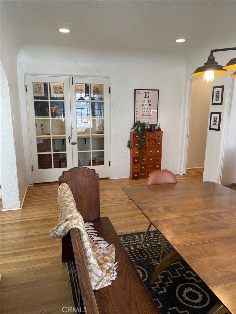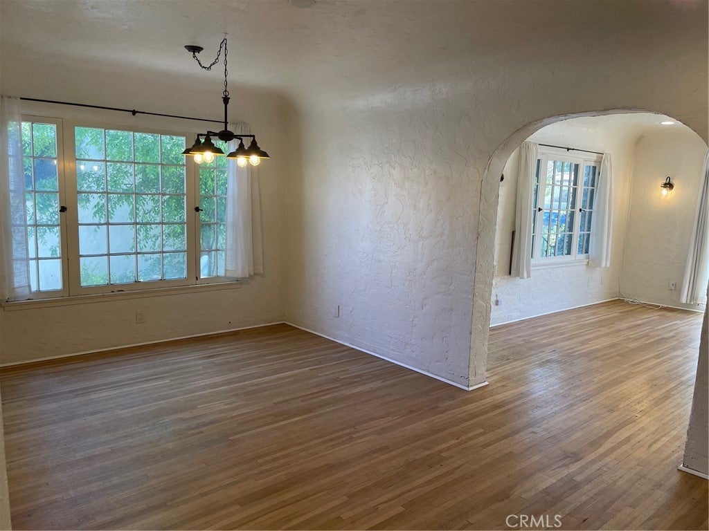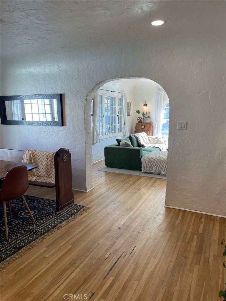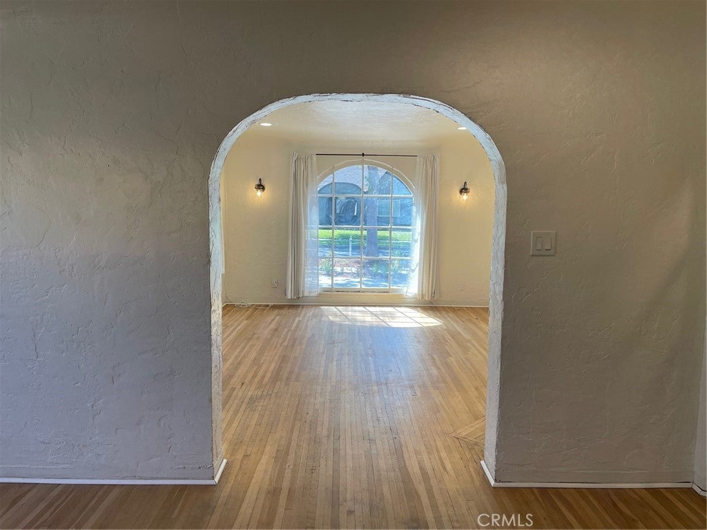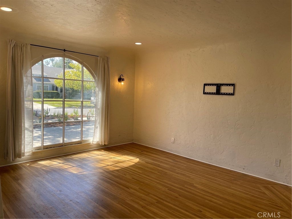 Looks and feels like a house, especially from the street view. Step back in time to this charming 1927 Tudor-home, located in Riverside’s highly desirable Palm Heights/Wood Streets historic neighborhood. This spacious two-bedroom single story home offers 1,000 sq ft and features beautiful original hardwood floors, barrel ceilings, classic arched openings, vintage glass door knobs, recessed lighting, lots of natural light with original payne windows with a large front arched picture window. Additional thoughtful upgrades while preserving its historic character include: stainless steel appliances, Bosch dishwasher, stainless steel refrigerator, and Kitchen Aid washer and dryer with seperate full laundry room & sink. A quaint arched kitchen nook, a hidden lite built-in office space behind French doors, updated light fixtures and recently painted outside and freshly painted inside. Enjoy the inviting front porch, gorgeous new landscaping both front and back, and tree-lined streets that define this beloved historic neighborhood. Palm Heights neighborhood provides flags and wreathes on the vintage street lights which adds to this picturesque neighborhood and on Christmas Eve the street is lined with candle light luminaries for a serene holiday stroll with Riverside Plaza shopping, dining, and everyday conveniences that are just minutes away. Detached vintage garage/storage space (over 200 sq ft) with 2 windows for natural light is included. Perfect for art studio or storage. Due to the historic Model-T era design, the garage door opening is smaller and not suitable for modern vehicle parking. Ample parking with circular driveway included. Rent includes water and gardner. This is a duplex, when facing the front of the home, the right side is available with it's own address and meters.