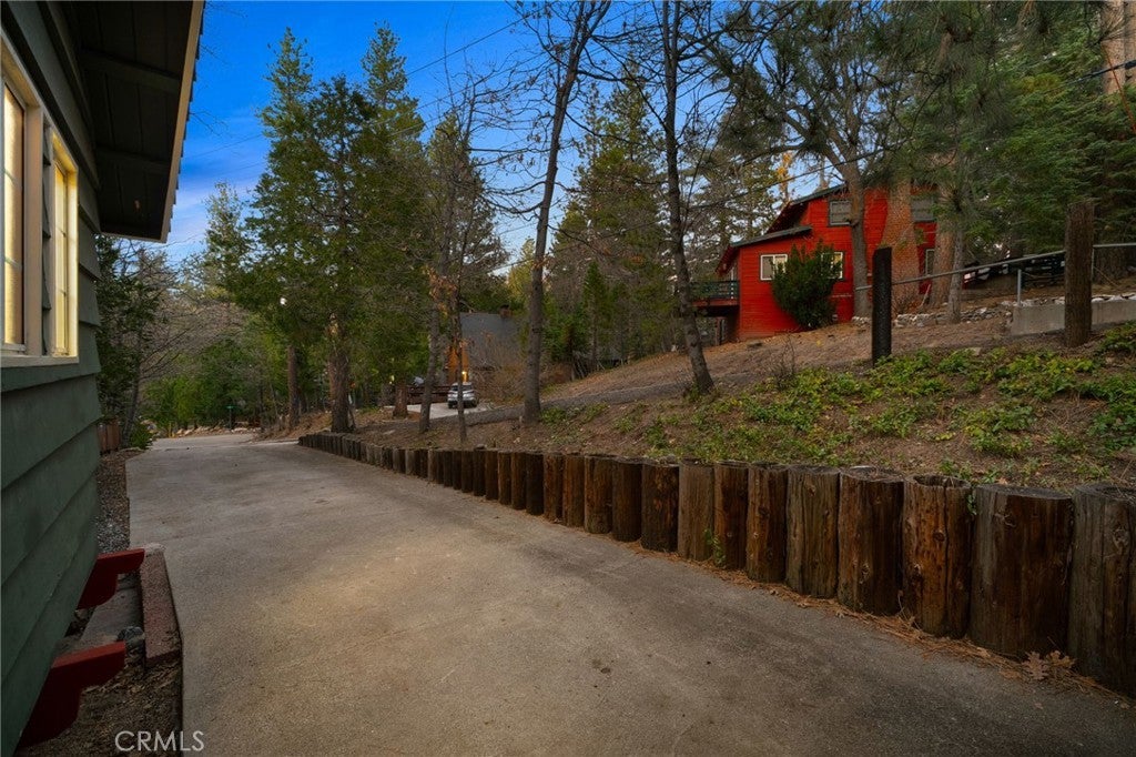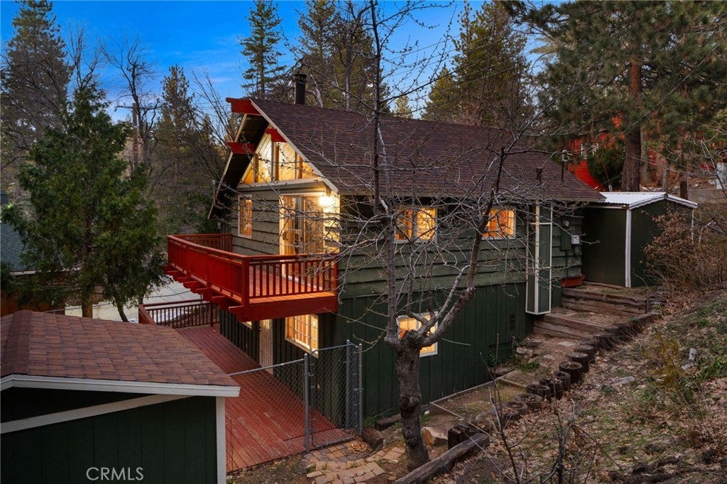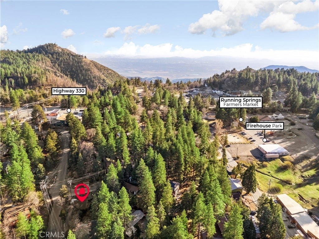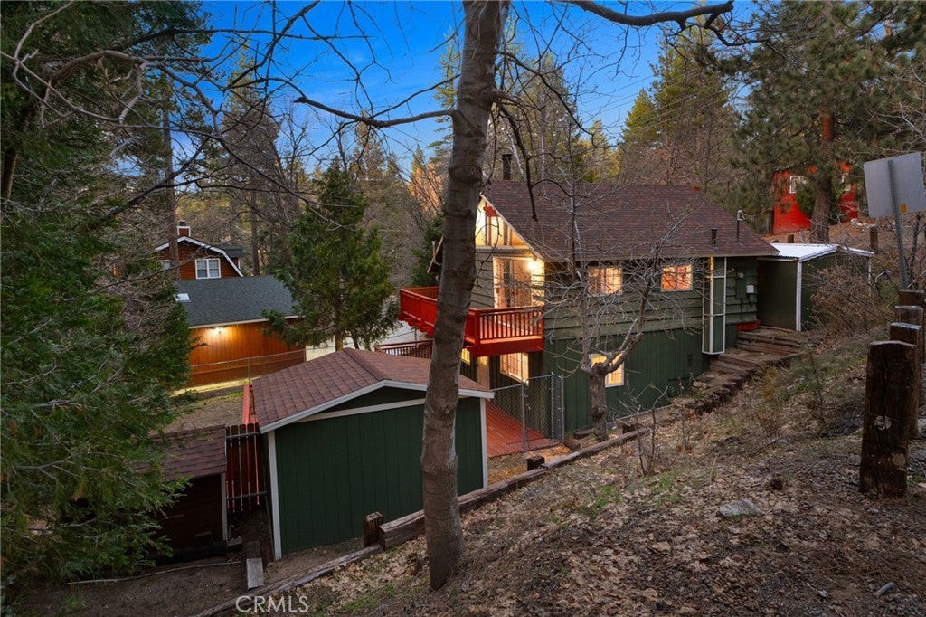 Tucked within the pines, this magical mountain cabin offers original character and peaceful living in the heart of Running Springs. Inside, rich knotty pine tongue-and-groove paneling creates an authentic cabin atmosphere, while the open living and dining area is anchored by a mid-century modern stainless steel round fireplace. Natural light pours through the windows, creating an inviting setting for cozy mountain evenings with family and friends. A playful loft above the living room offers the perfect perch to read, stargaze, or simply enjoy the view from above. The original kitchen flows easily into the main living and dining spaces, making it ideal for both relaxed daily living and weekend gatherings. Set on a generous 5,950 sqft lot with multiple cherry trees, the property offers space to garden, expand, or simply enjoy the peaceful surroundings. Multiple storage sheds provide flexibility for hobbies, workshop space, or additional storage, along with ample parking on the flat, paved driveway. Other thoughtful updates include a newer roof, newer furnace, and an updated main water shut-off valve. Ideally located within walking distance to the heart of Running Springs, local shops, restaurants, fire station, the park and the post office, with scenic hiking trails nearby and Snow Valley Mountain Resort just 8 minutes away for skiing and sledding. Conveniently situated about 90 minutes from Orange County or Los Angeles, and roughly 30 minutes to Big Bear, this property offers the perfect balance of accessibility and mountain tranquility making it an inviting full-time home, weekend retreat, or investment opportunity.