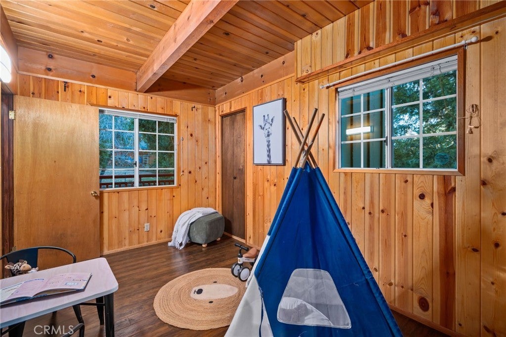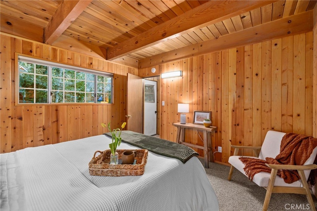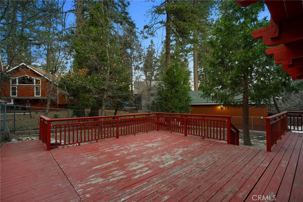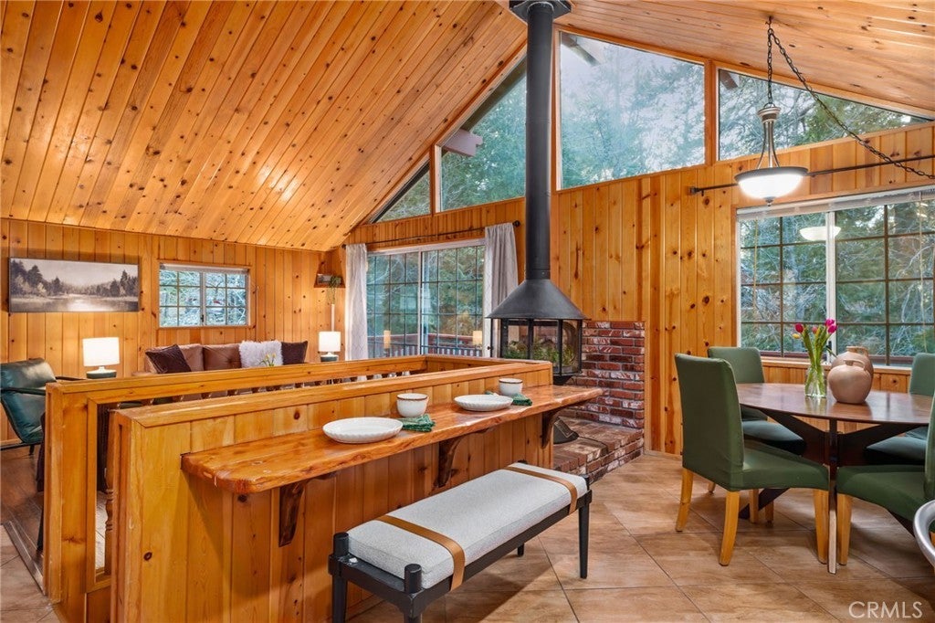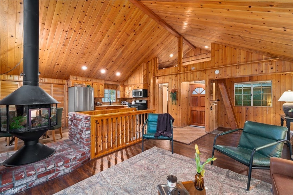 Tucked within the pines, this magical mountain cabin offers original character and peaceful living in the heart of Running Springs. Inside, rich knotty pine tongue-and-groove paneling creates an authentic cabin atmosphere, while the open living and dining area is anchored by a mid-century modern stainless steel round fireplace. Natural light pours through the windows, creating an inviting setting for cozy mountain evenings with family and friends. A playful loft above the living room offers the perfect perch to read, stargaze, or simply enjoy the view from above. The original kitchen flows easily into the main living and dining spaces, making it ideal for both relaxed daily living and weekend gatherings. Set on a generous 5,950 sqft lot with multiple cherry trees, the property offers space to garden, expand, or simply enjoy the peaceful surroundings. Multiple storage sheds provide flexibility for hobbies, workshop space, or additional storage, along with ample parking on the flat, paved driveway. Other thoughtful updates include a newer roof, newer furnace, and an updated main water shut-off valve. Ideally located within walking distance to the heart of Running Springs, local shops, restaurants, fire station, the park and the post office, with scenic hiking trails nearby and Snow Valley Mountain Resort just 8 minutes away for skiing and sledding. Conveniently situated about 90 minutes from Orange County or Los Angeles, and roughly 30 minutes to Big Bear, this property offers the perfect balance of accessibility and mountain tranquility making it an inviting full-time home, weekend retreat, or investment opportunity.