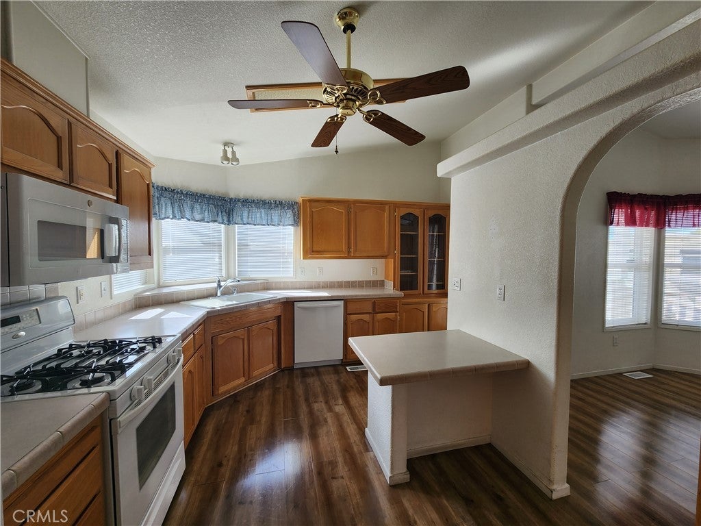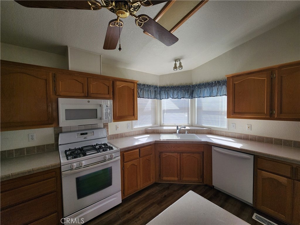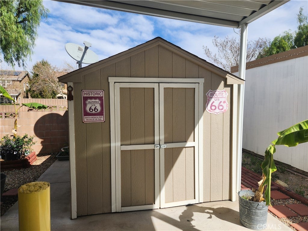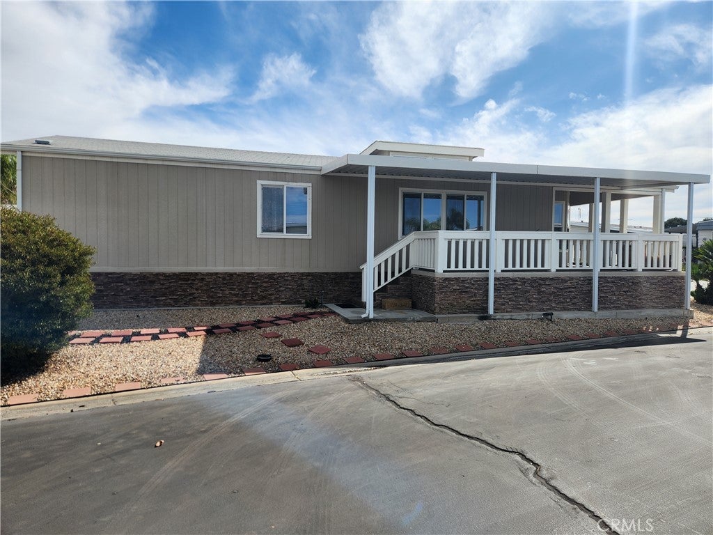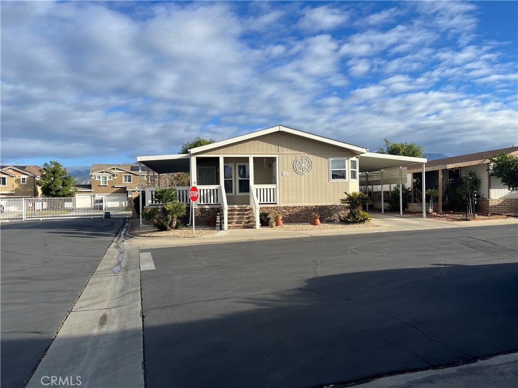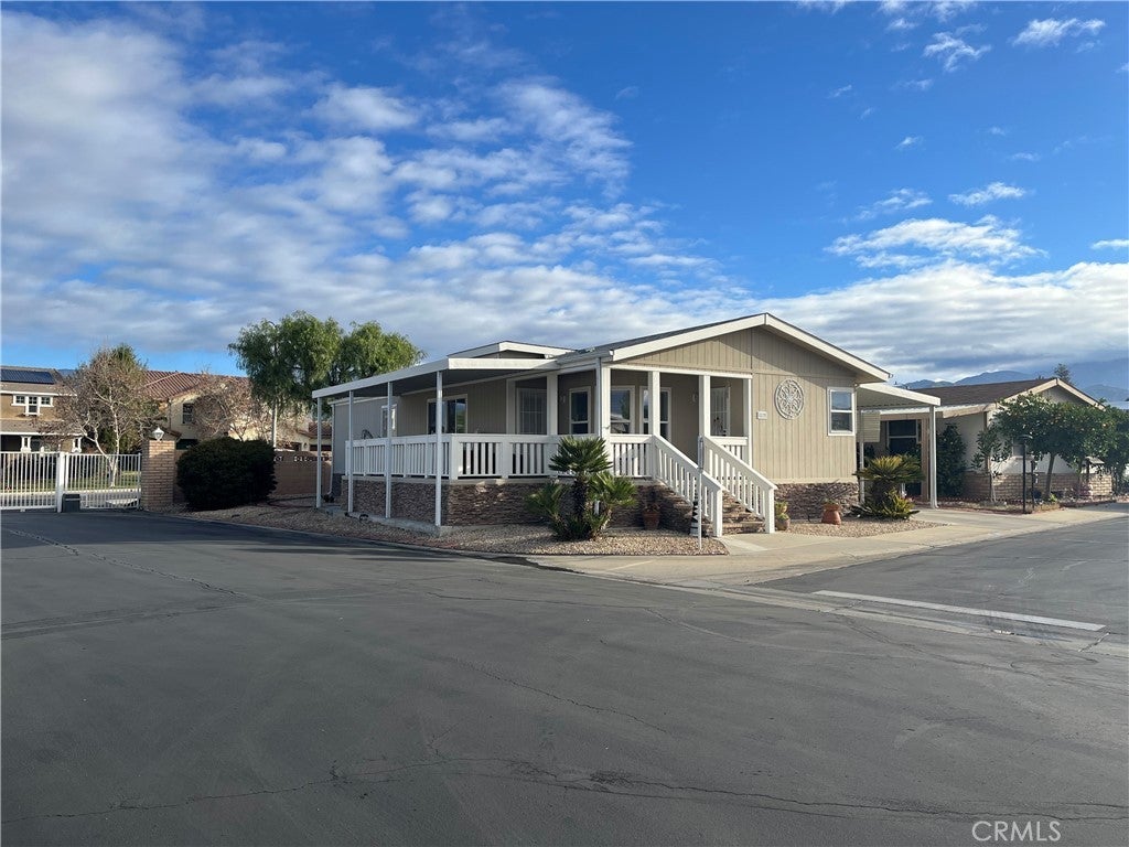 Welcome to this beautifully maintained single-level, 3 bedroom, 2 bathroom home with a large living and dining room, a beautiful kitchen with tile accented counters, a pantry, and ample wood cabinetry. It has a primary bedroom with double sinks and a soaker walk-in tub. Located in a highly desirable 55+ community in Redlands. Built in 2006 and featuring, dual pane windows, and high ceilings, this home offers a light and bright atmosphere and is move-in ready. Inside, you’ll find a functional and inviting floor plan with an inside laundry room. a washer and dryer, and more. Plenty of room for entertaining too! Tons of storage throughout. Covered parking, a raised bed planter, and a utility shed add to the appeal. The home is ready for its next homeowner to simply turn the key and settle in. The community offers low monthly park rent along with amenities that enhance everyday living. Residents enjoy access to a clubhouse, sparkling pool and spa, and a welcoming atmosphere. Perfectly situated for easy entrance and exit. This is a value priced home, affordable, and full of charm.