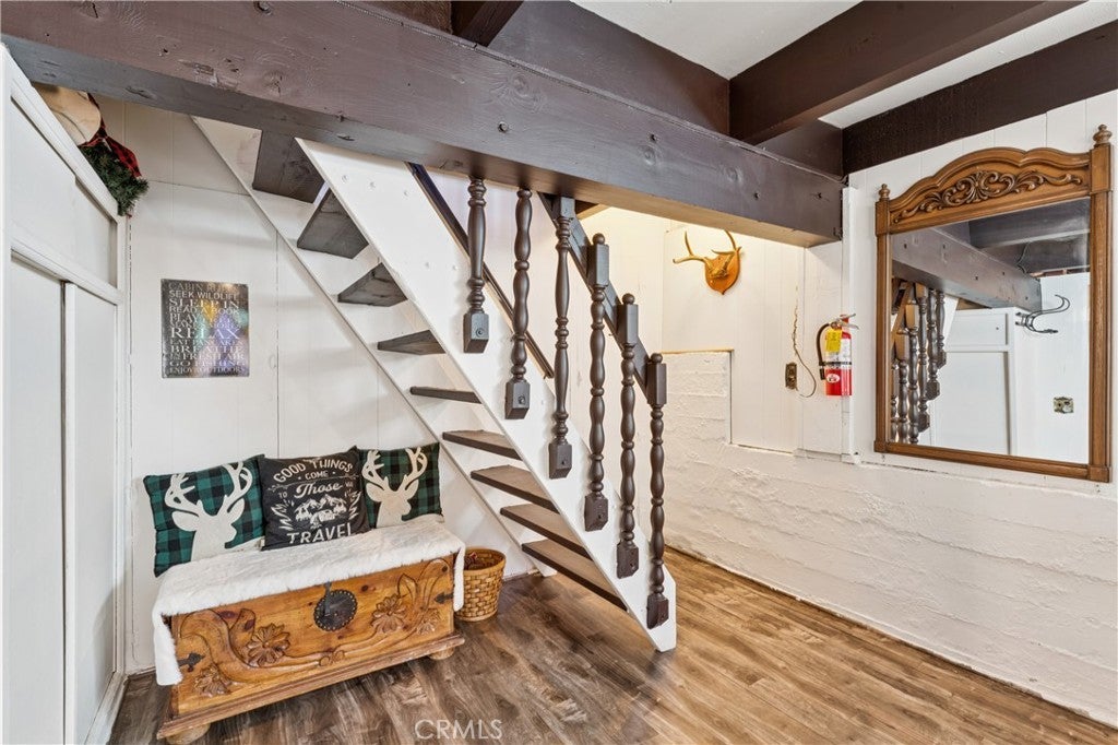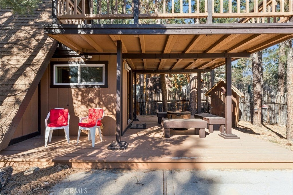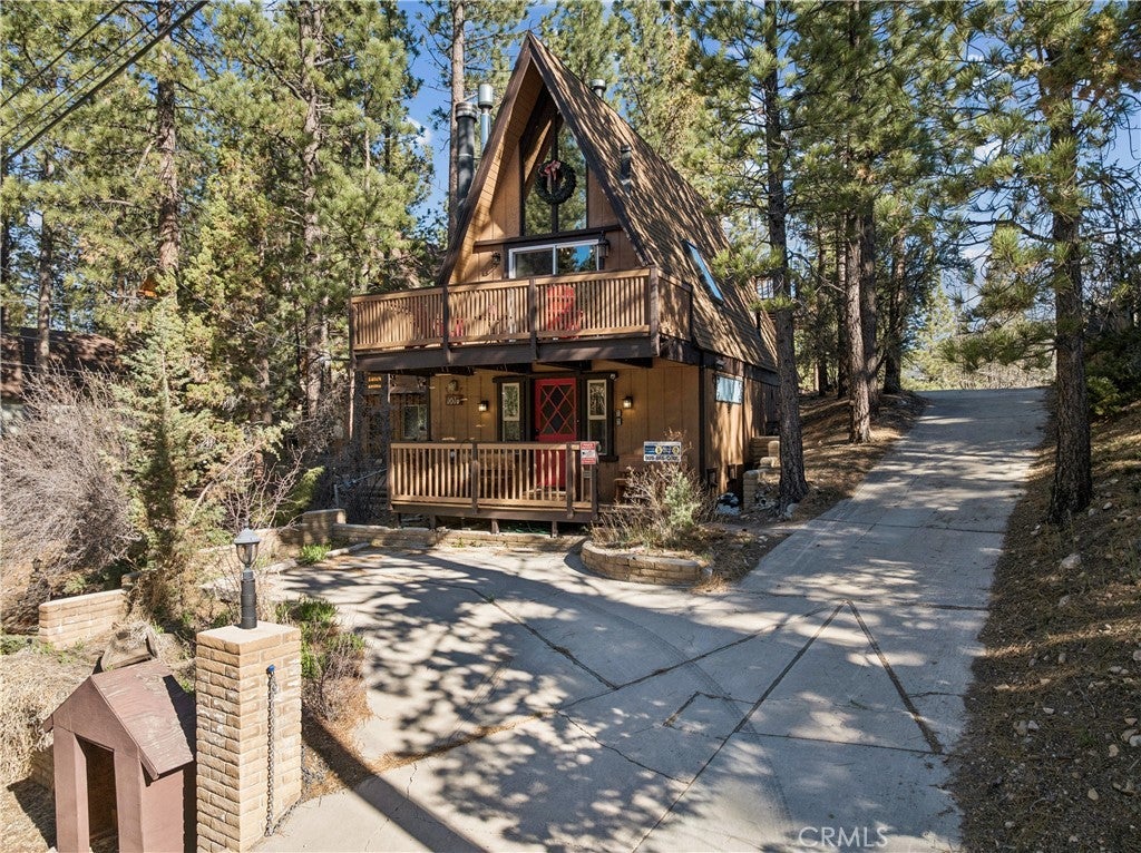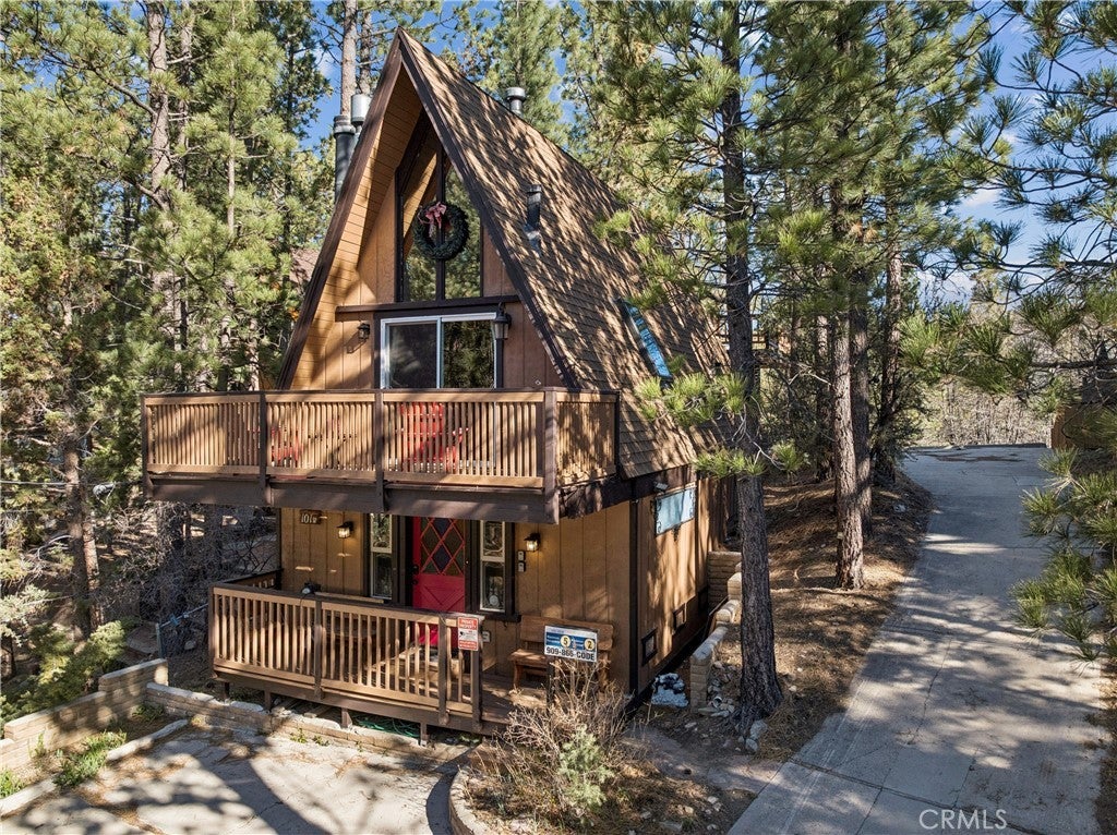 Vintage A-Frame Cabin with Classic Mountain Charm. Escape to this haven tucked away in a peaceful Big Bear neighborhood, the perfect blend of nostalgia and comfort you’ve been dreaming of. Perched on a gentle hill with a long driveway offering ample parking, it’s ideal for weekend getaways with friends or family. Step outside to the front deck, perfect for morning coffee or al fresco meals with fresh mountain air. Out back, the spacious patio with a cozy firepit and roomy yard becomes your favorite gathering spot after a day of adventure - imagine s’mores under the stars, laughter, and total relaxation. Inside, the main floor captures that timeless cabin magic: soaring vaulted ceilings, exposed wood beams, and large windows that flood the space with natural light. The open-concept living area features a welcoming wood-burning stove, while the kitchen boasts an easy eat-in island, ideal for casual breakfasts or evening cocktails. A bathroom with a shower and convenient laundry area complete this level. Downstairs, the primary bedroom offers a private retreat with its own fireplace and three-quarter bath. Up in the loft, you’ll find flexible space for an extra bed, home office, or peaceful reading nook, plus a private deck made for stargazing. Whether you’re hosting a lively group or craving quiet mountain solitude, this home gives you room to spread out or cozy up together. When you’re ready for adventure, Big Bear’s world-class skiing, hiking trails, shopping, and dining are just minutes away. Come create unforgettable memories.