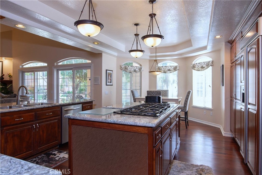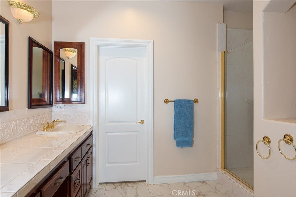 Stunning Custom Mediterranean Estate on 1 Acre Adjacent to the Alessandro Arroyo This exceptional residence lives like a single story, offering approximately 3,400 sq.ft. on the main level alone. A private courtyard entry with elegant double doors welcomes you into a grand foyer featuring soaring two-story ceilings. Just off the entry are a sophisticated library with custom built-ins and a versatile reception room—ideal for entertaining or easily converted into a fifth bedroom. The traditional step-down living room and formal dining room with buffet niche/dry bar create an inviting setting for gatherings. The chef’s kitchen boasts a center island, breakfast nook, and seamless flow into the expansive family room. The main floor also includes a luxurious primary suite complete with a sitting area, wet bar, and an walk-in closet, as well as a private guest suite with its own exterior entrance. Upstairs, you’ll find a spacious loft/sitting area, a large storage closet, and Jack-and-Jill bedrooms. Throughout the home, you’ll appreciate custom alder cabinetry, three main-floor fireplaces, a whole-house fan, dual A/C units, and walk-in closets in every bedroom. The outdoor spaces are equally impressive: a generous patio with ceiling fan, a covered outdoor room, retractable awning, a sparkling pool and a full outdoor kitchen equipped with grill, sink, refrigerator, and bar seating. Multiple seating areas overlook the natural terrain, complemented by a variety of fruit trees. Additional features include a finished three-car garage with built-in cabinetry and a separate storage room. This is truly a one-of-a-kind custom home—thoughtfully designed, beautifully appointed