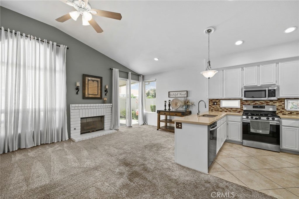 Welcome to your dream home nestled in the desirable, gated Sun Lakes Country Club community! This delightful residence boasts incredible curb appeal, highlighted by lush green grass and a charming porch that greets you as you enter. Step inside to discover a spacious living room adorned with bright white walls and plush carpeting, creating a warm and inviting atmosphere. The layout flows effortlessly into the kitchen and family room that features a fireplace, perfect for entertaining or enjoying family meals. A cozy breakfast nook offers a quaint spot to sip your morning coffee, while sliding doors provide easy access to the tranquil backyard. The well-appointed kitchen features a convenient walk-in pantry, ensuring ample storage for all your culinary needs. Retreat to the expansive primary bedroom, which also features sliding doors leading to the serene backyard. The en-suite bathroom is designed for comfort, showcasing dual sinks, a soothing shower, and a generous walk-in closet complete with custom shelving units. This home also includes a spacious second bedroom and an additional bathroom, along with a functional laundry room for added convenience. Step outside to your private backyard oasis, where you’ll find meticulously maintained green grass, lovely plants, and a covered patio area—perfect for relaxation and outdoor gatherings. Don’t miss this opportunity to own a charming home in a vibrant community filled with amenities. Community amenities include: two 18-Hole golf courses, 3 Clubhouses, 3 pools and spas (one of each is indoors), six tennis courts, three paddle tennis courts, eight pickleball courts, cable and internet covered and a restaurant, bar and lounge! Schedule your showing today!