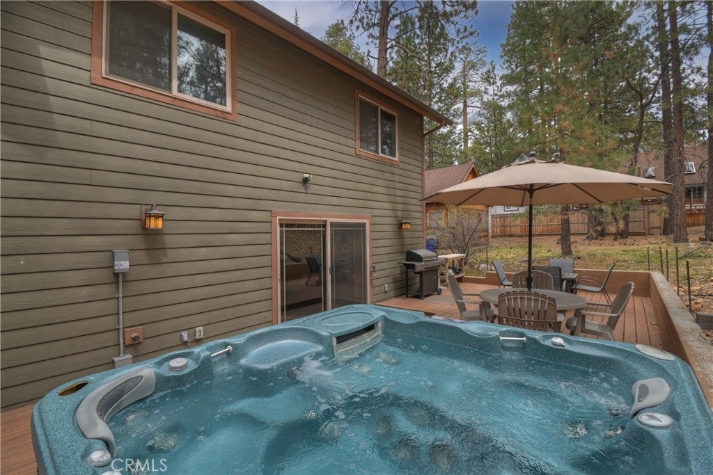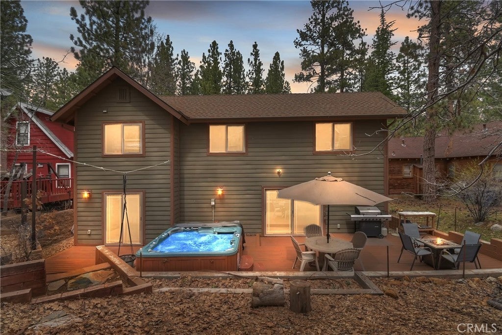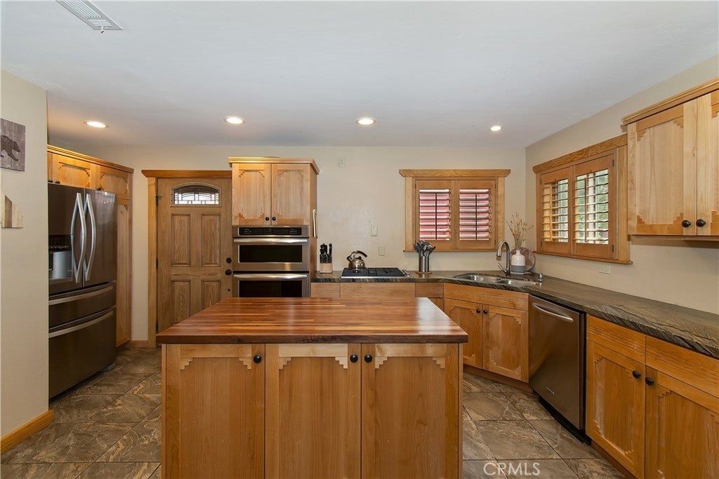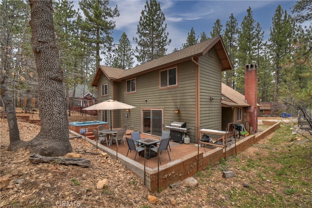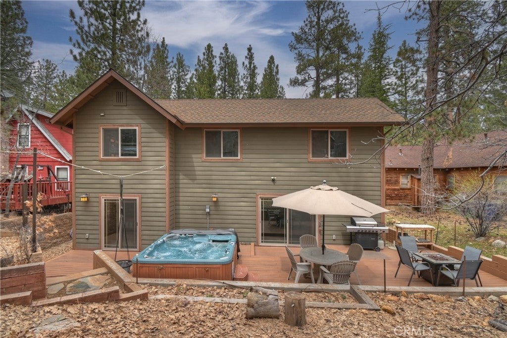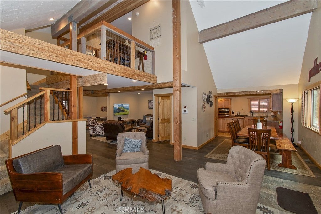 This home is for those that want a remodeled house with room to gather with all of their loved ones under one roof ~ As you enter you will love the high ceilings and native rock wood burning fireplace in the living room ~ To your right you have your large dining area for holiday meals with the family ~ The kitchen is absolutely gorgeous with it's, butcher block island, custom wood cabinets (with push to open drawers), granite countertops and stainless steel appliances ~ The main level also has your family room with wet bar, a game room, your master bedroom and bathroom and another 3/4 bathroom ~ On the upper level you have a large loft, 4 more bedrooms and 2 more bathrooms ~ In the backyard you have your large deck with hot tub and plenty of room for relaxing and entertaining ~ Walking distance to Snow Summit, Big Bear Lake and the Village ~ Centrally located while being on a quiet cul-de-sac with little to no traffic ~ This is the mountain escape you have been longing for!