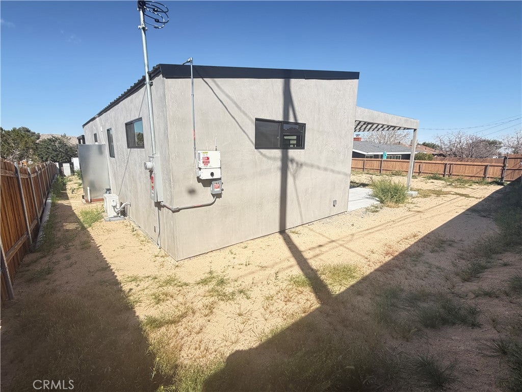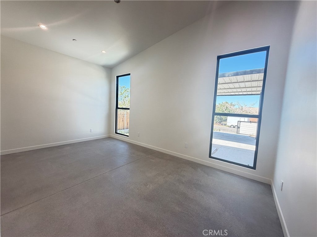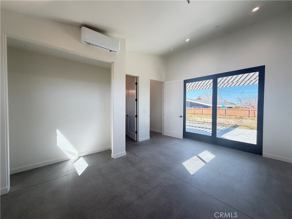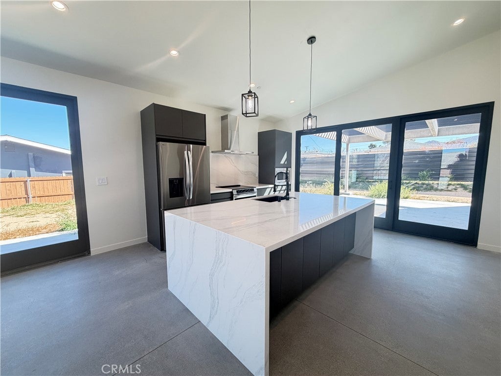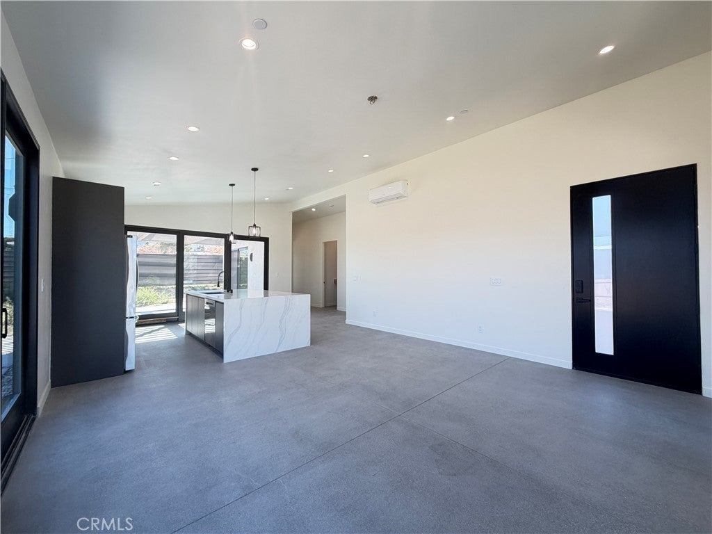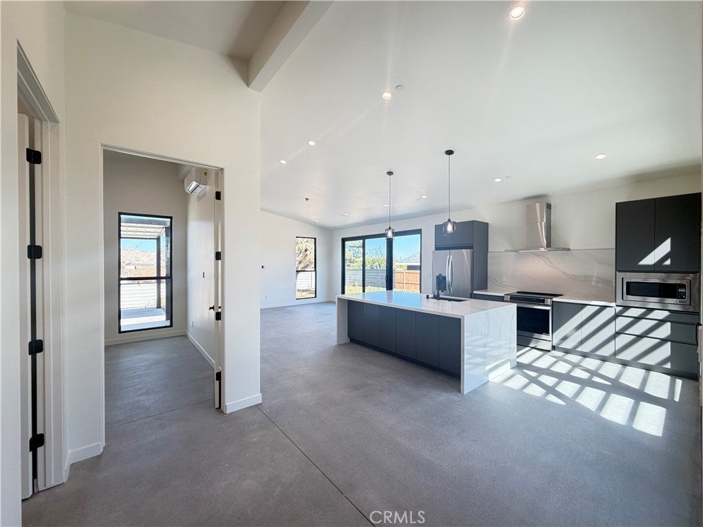 Experience modern desert luxury in this stunning never lived in 2024 new-construction masterpiece located in the heart of Joshua Tree. Perfectly blending contemporary aesthetics with high-efficiency living, this 2-bedroom, 2-bathroom home offers 1,302 sq. ft. of meticulously designed space. Step inside to an expansive open-concept floor plan featuring soaring ceilings, polished concrete floors, and abundant natural light. The chef-inspired kitchen serves as the home's centerpiece, boasting a double-waterfall quartz island, custom cabinetry, and premium stainless steel appliances. Both bedrooms are generously sized, while the bathrooms offer a spa-like retreat with custom tile work and sleek walk-in showers. Designed for the modern environmentalist, the property includes fully paid solar panels and an energy-efficient zoned ductless mini-split HVAC system. Outside, the property sits on a spacious lot with mountain views, offering a blank canvas for your desert oasis or a high-end short-term rental. Located just minutes from the Joshua Tree National Park entrance and the vibrant local Village, this home is the ultimate desert sanctuary.