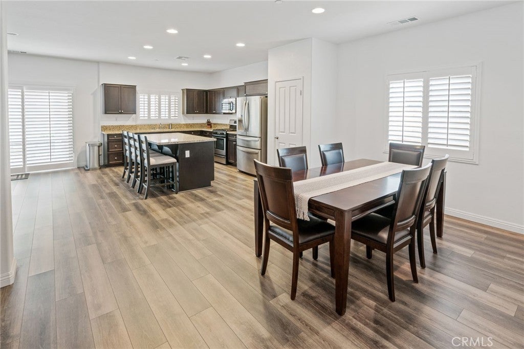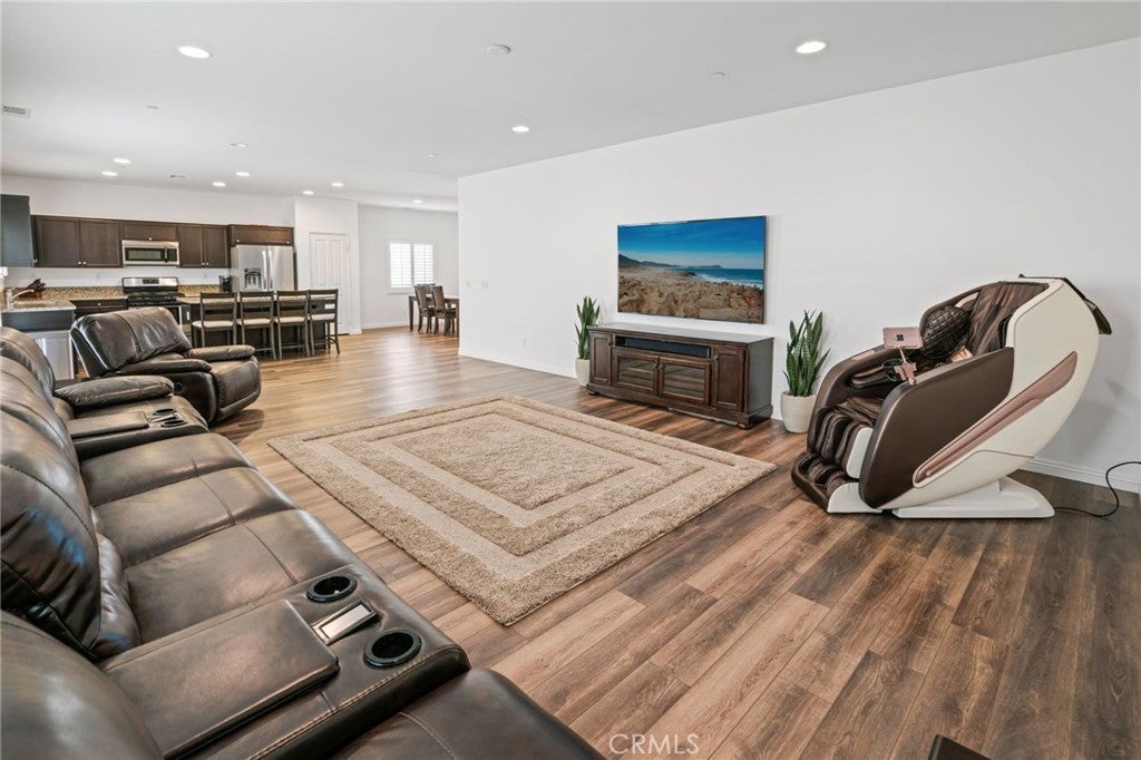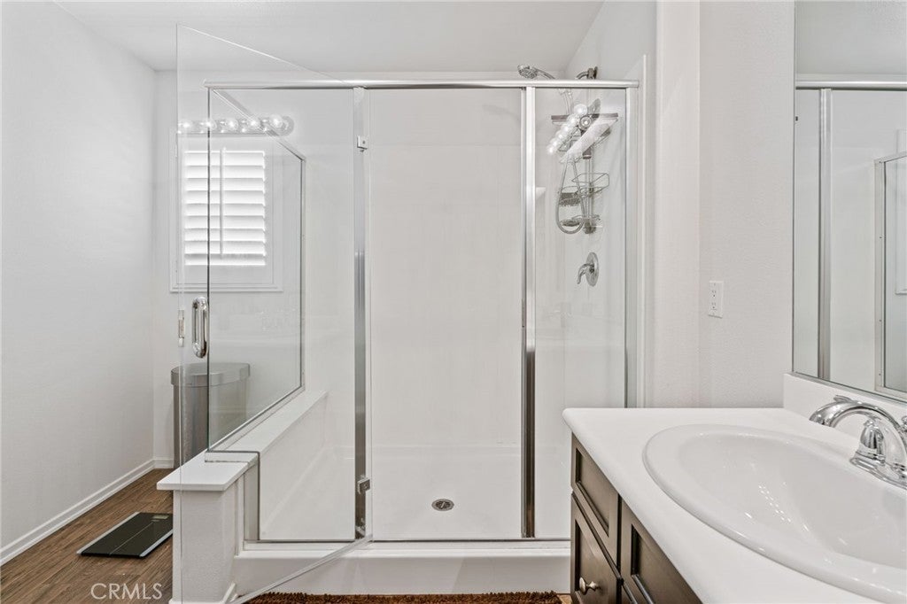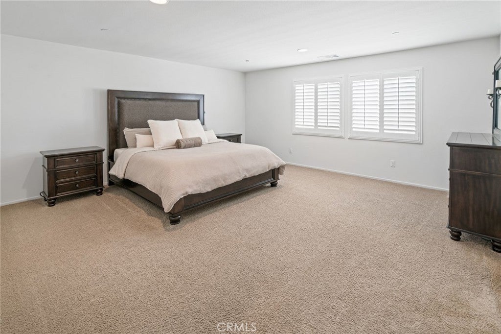 Beautiful 4 bedroom, 3 bathroom home in the Bella Strada community of Fontana. Built in 2017, this spacious two story home offers approximately 2,760 square feet with a highly functional open floor plan. The main level features a downstairs bedroom and full bathroom, ideal for guests, multigenerational living, or a home office. The kitchen opens to the dining area and large family room and includes granite countertops, a large center island with seating, dark wood cabinetry, stainless steel appliances, a gas range, built-in microwave, and walk-in pantry. Upstairs features a large loft, spacious secondary bedrooms, convenient laundry room, and an oversized primary suite with dual walk-in closets and an ensuite bath with dual sinks and a large glass-enclosed shower. Additional highlights include luxury vinyl flooring throughout, new baseboards throughout, plantation shutters, and recessed lighting. The backyard is designed for low maintenance with extensive concrete hardscape, a long covered pergola patio, side yard space, raised planter beds, block wall fencing, and a storage shed. Home includes paid-off solar, offering energy efficiency and added value. Bella Strada HOA amenities include a pool, park, and playground.
