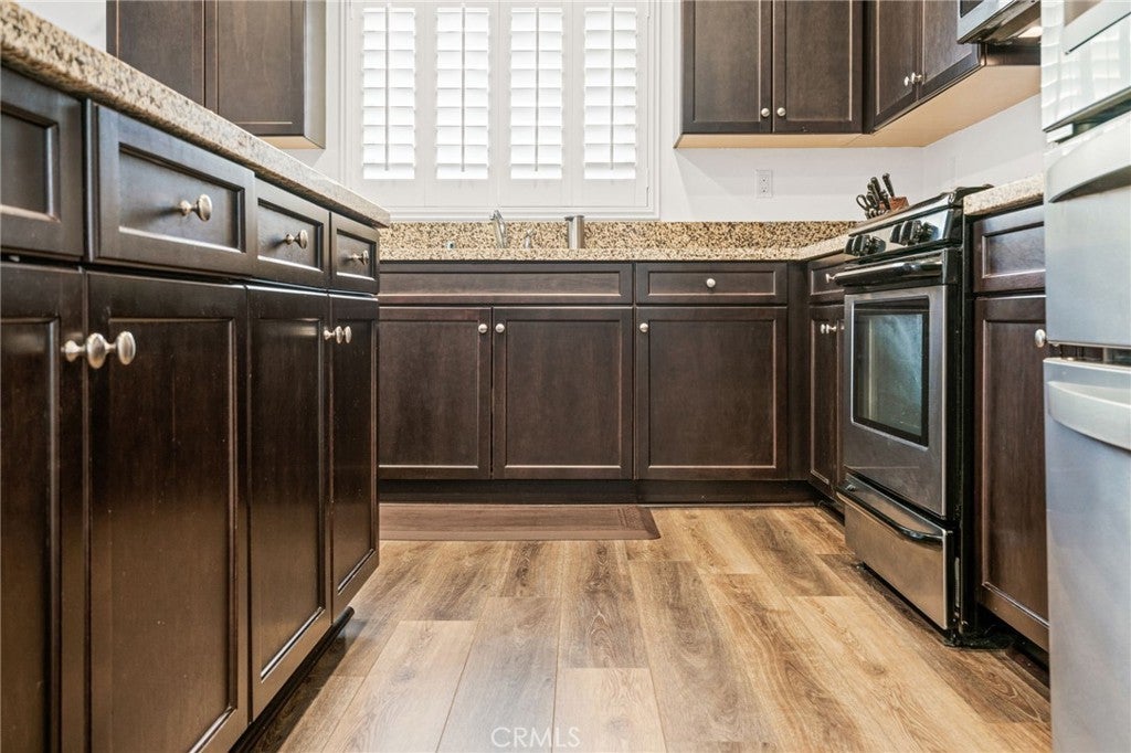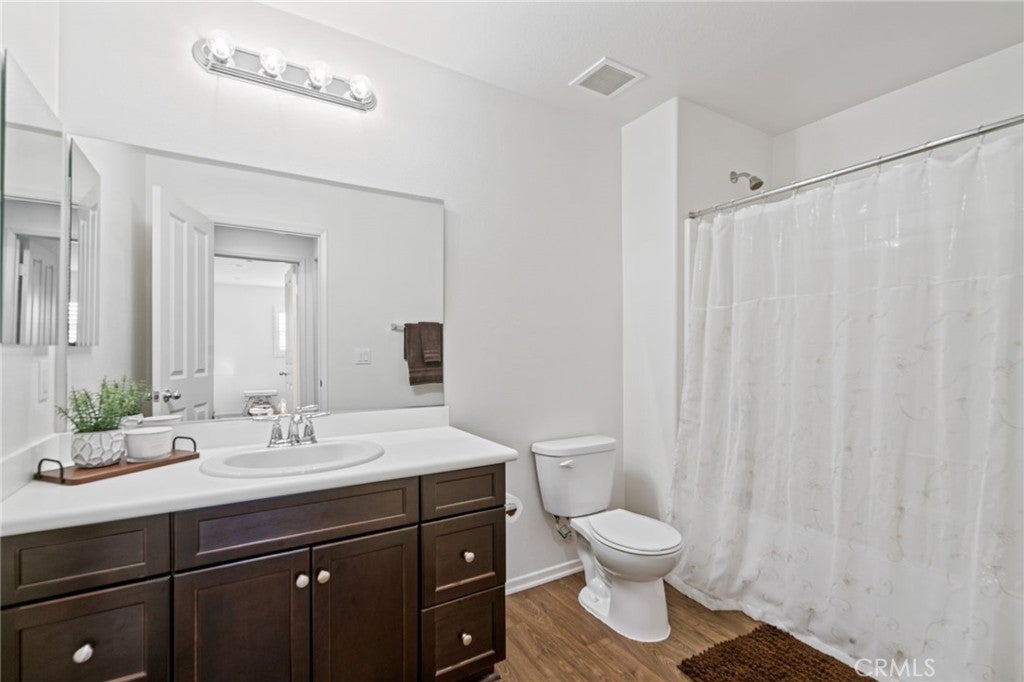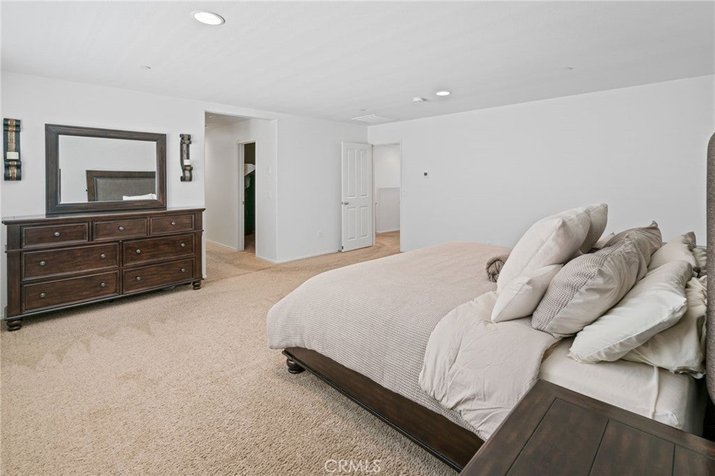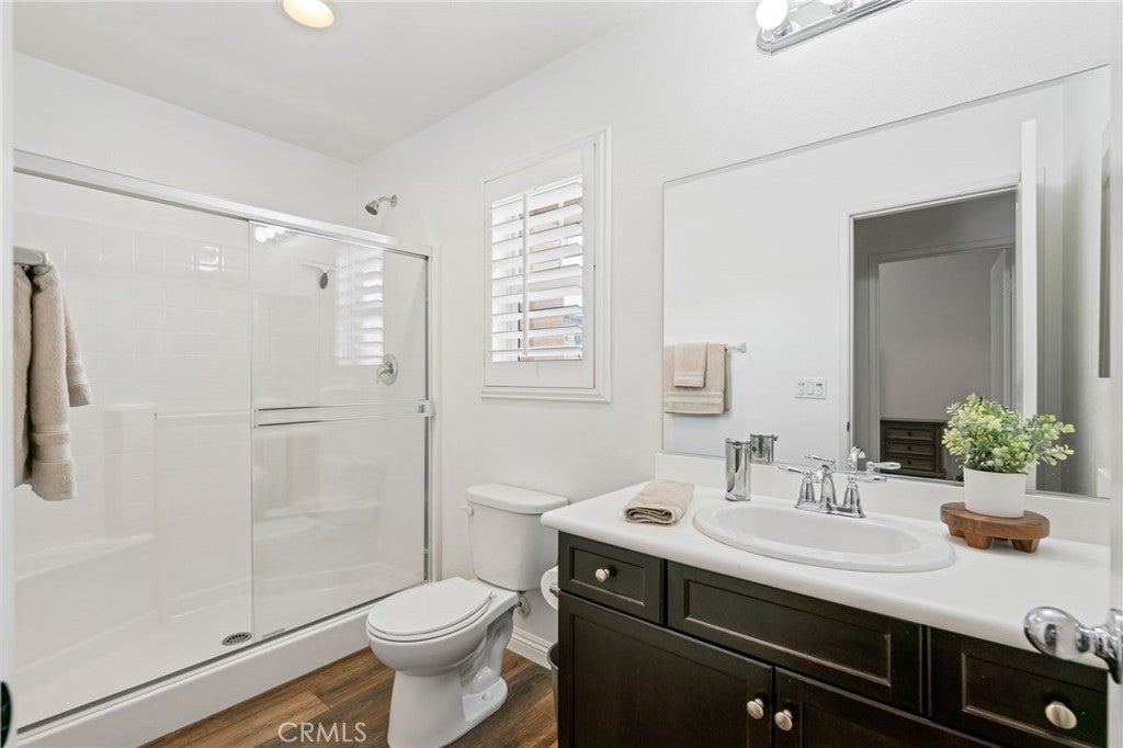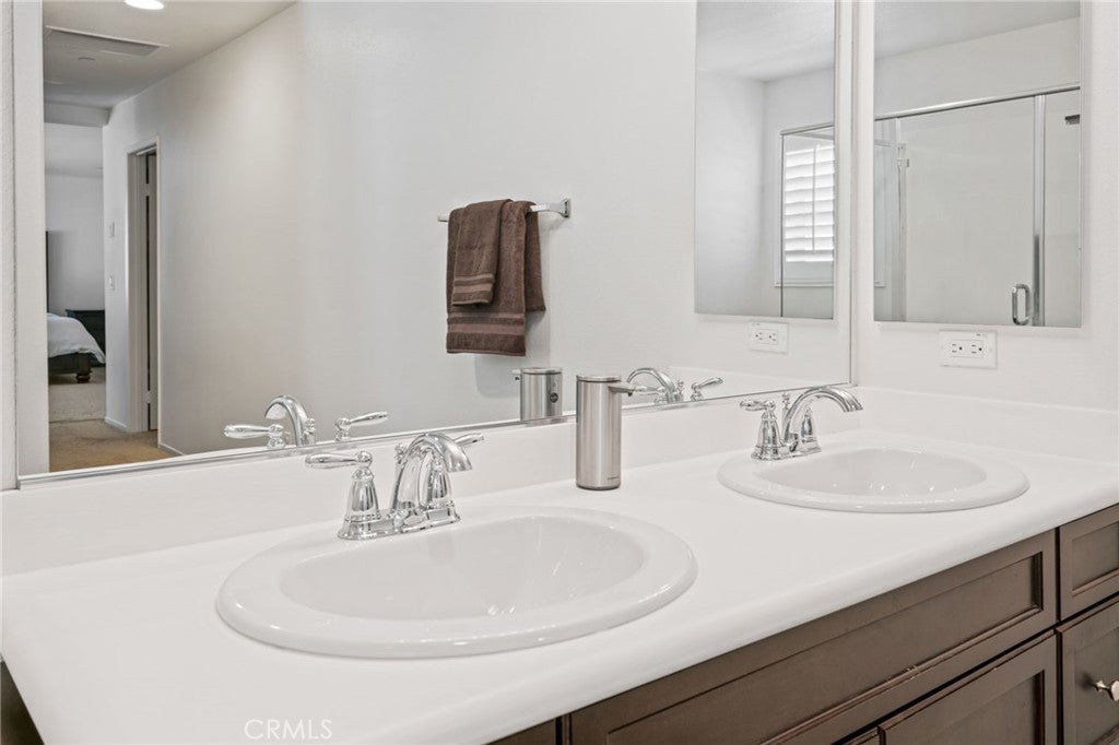 Beautiful 4 bedroom, 3 bathroom home in the Bella Strada community of Fontana. Built in 2017, this spacious two story home offers approximately 2,760 square feet with a highly functional open floor plan. The main level features a downstairs bedroom and full bathroom, ideal for guests, multigenerational living, or a home office. The kitchen opens to the dining area and large family room and includes granite countertops, a large center island with seating, dark wood cabinetry, stainless steel appliances, a gas range, built-in microwave, and walk-in pantry. Upstairs features a large loft, spacious secondary bedrooms, convenient laundry room, and an oversized primary suite with dual walk-in closets and an ensuite bath with dual sinks and a large glass-enclosed shower. Additional highlights include luxury vinyl flooring throughout, new baseboards throughout, plantation shutters, and recessed lighting. The backyard is designed for low maintenance with extensive concrete hardscape, a long covered pergola patio, side yard space, raised planter beds, block wall fencing, and a storage shed. Home includes paid-off solar, offering energy efficiency and added value. Bella Strada HOA amenities include a pool, park, and playground.