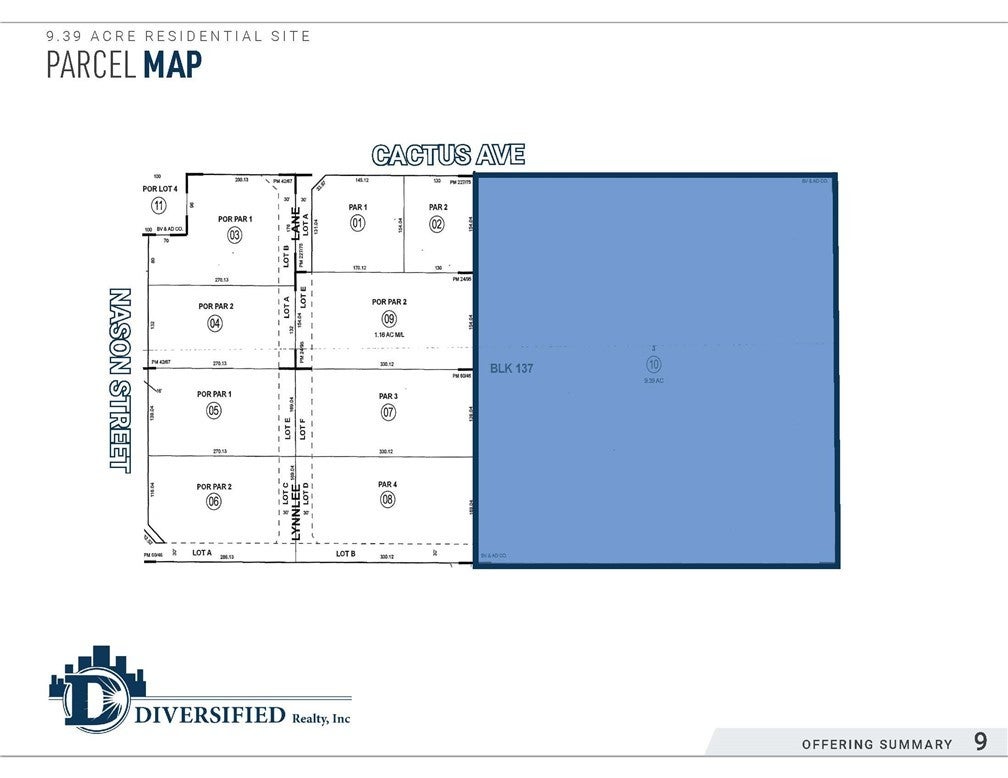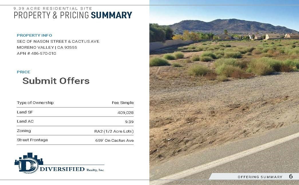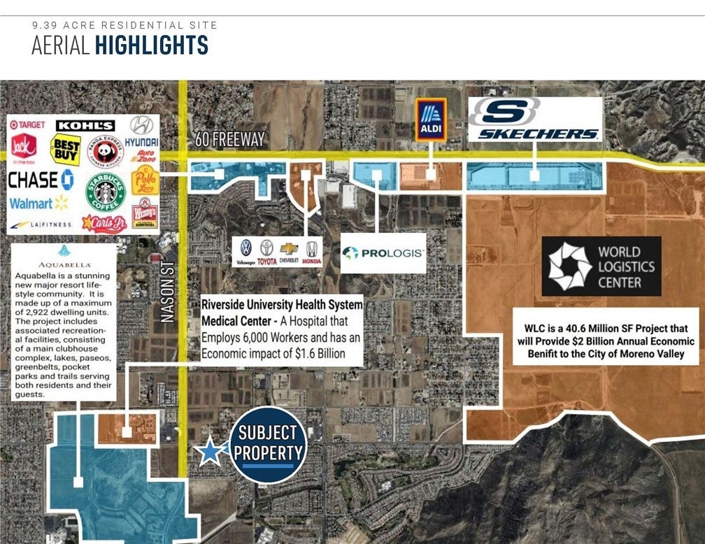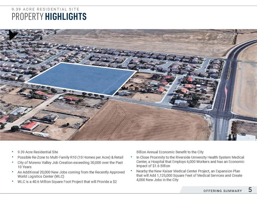 Property is Unpriced! • 9.39 Acre Residential Land Ideal for Townhomes or Cluster Detached Single-Family Development • Possible Re-Zone to R10 (10 Homes Per Acre) • City of Moreno Valley Job Creation exceeding 30,000 over the Past 10 Years • An Additional 20,000 New Jobs coming from the Recently Approved World Logistics Center (WLC) • WLC is a 40.6 Million Square Foot Project that will Provide a $2 Billion Annual Economic Benefit to the City • In Close Proximity to the Riverside University Health System Medical Center, a Hospital that Employs 6,000 Workers and has an Economic Impact of $1.6 Billion • Nearby the New Kaiser Medical Center Project, an Expansion Plan that will Add 1,125,000 Square Feet of Medical Services and Create 4,000 New Jobs in the