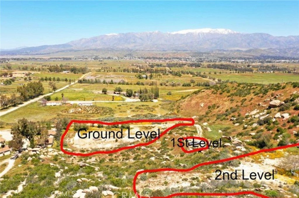 Build your dream ranch. This property has the best views of the city from up above. 3 Levels of building area. Has City water meter and Record of Survey completed and filed with Riverside County. Property line surveyed and staked. City power pole close by. Great neighbors and country living at it's best.